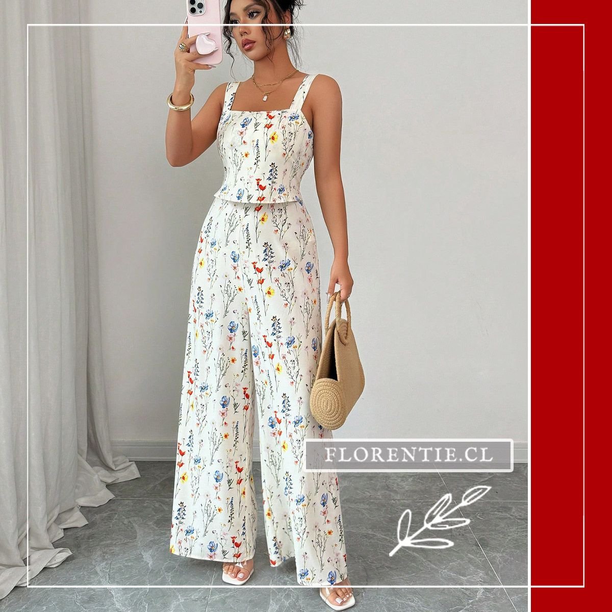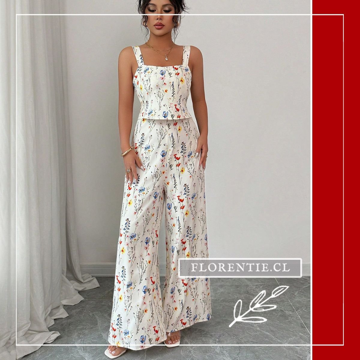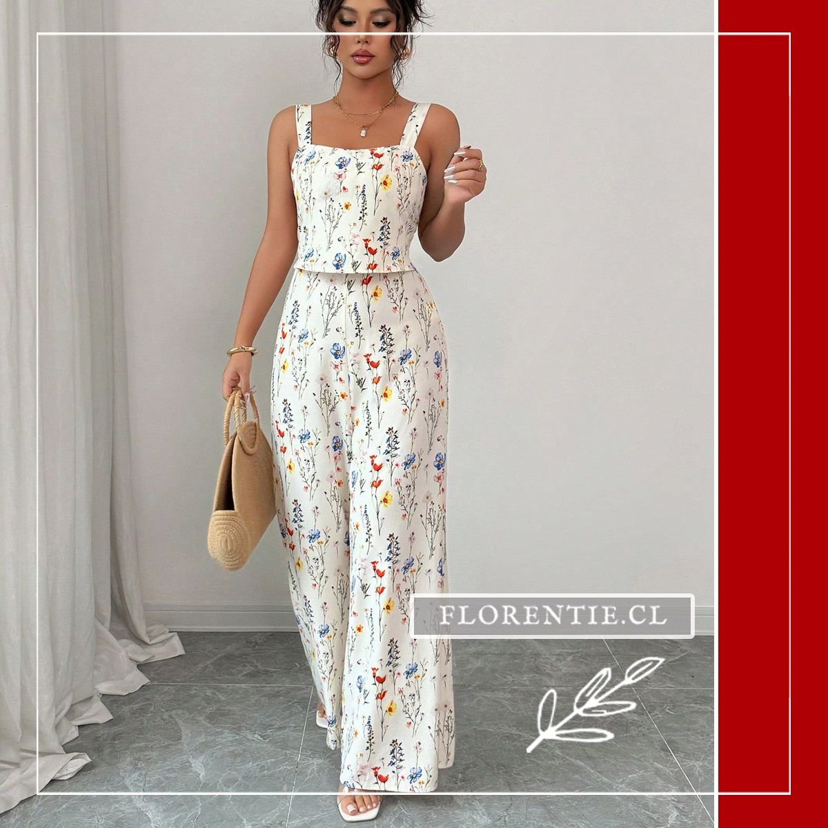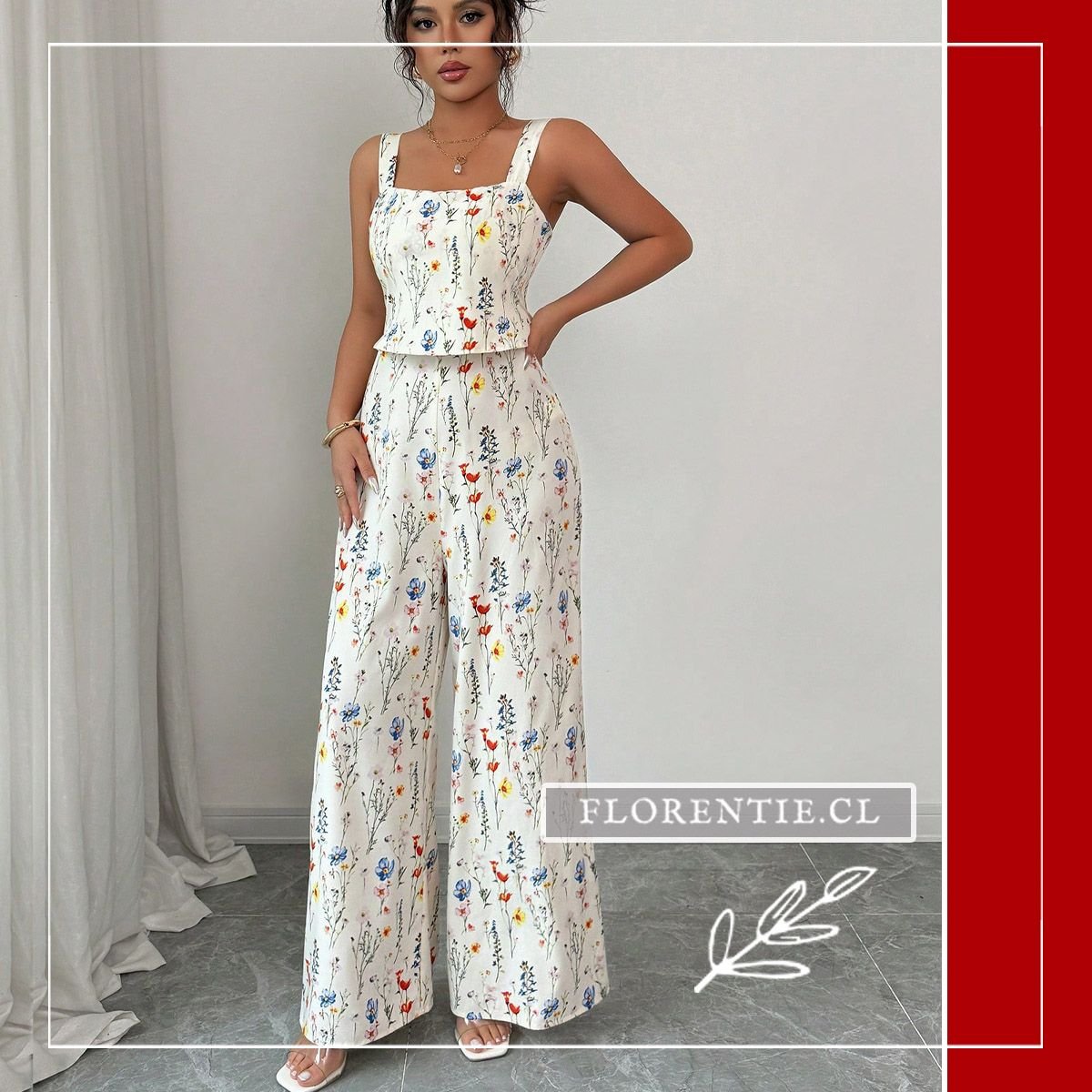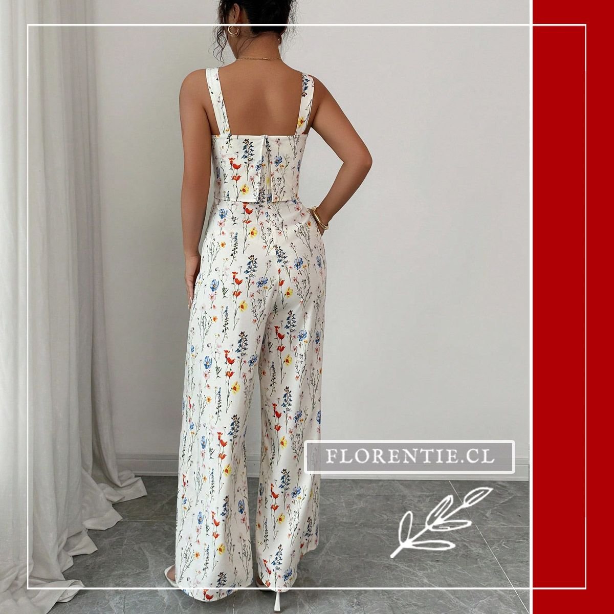 Enterito con flores, destaca tu figura con un top corset entallado y un pantalón palazzo de talle alto. El estampado botánico, con flores silvestres en tonos vivos sobre fondo claro, aporta un aire fresco y femenino. Ideal para eventos primaverales o de verano como bodas diurnas, fiestas en jardín, cócteles al aire libre y celebraciones especiales. Su combinación de elegancia estructurada y un diseño floral romántico asegura un look memorable y lleno de estilo para la temporada.