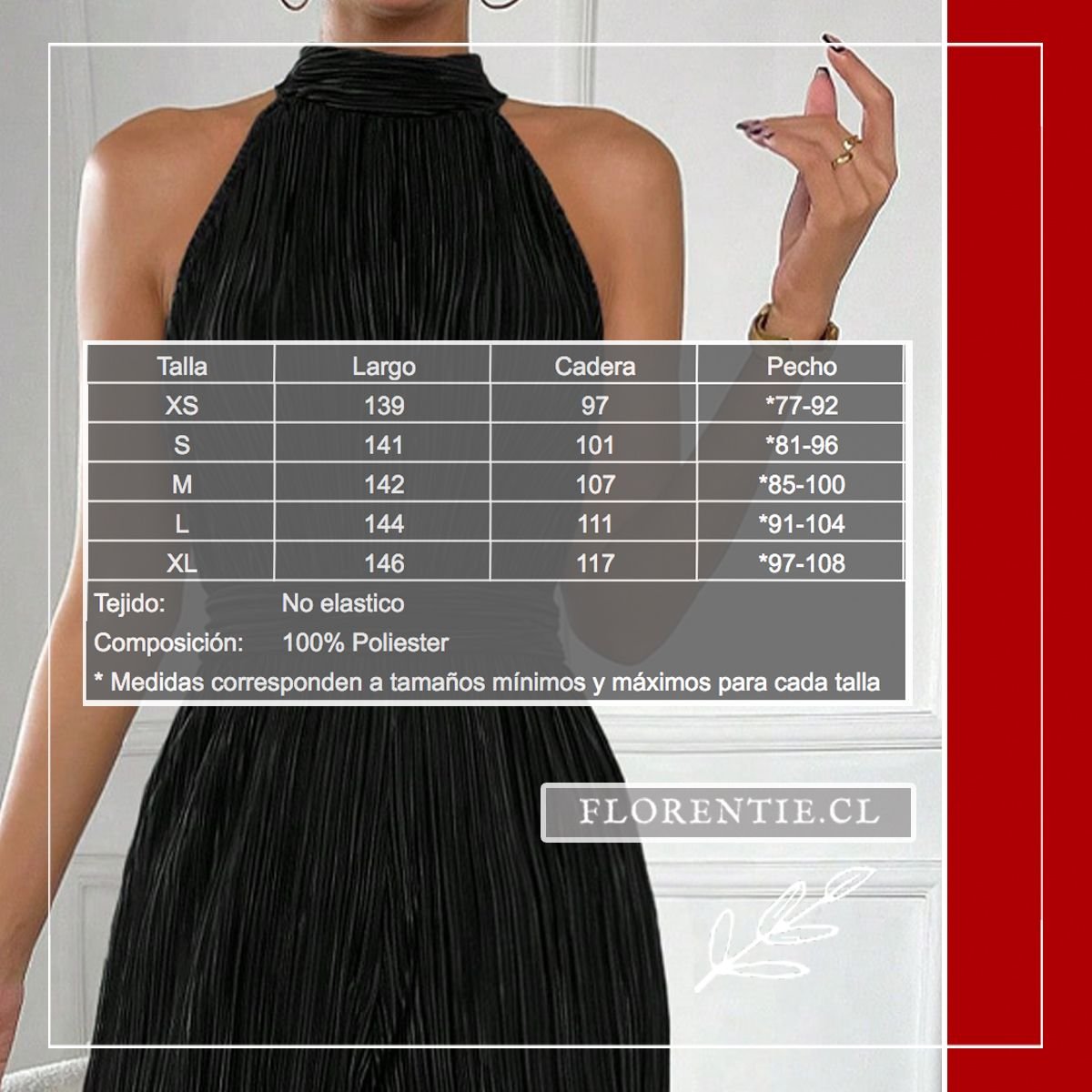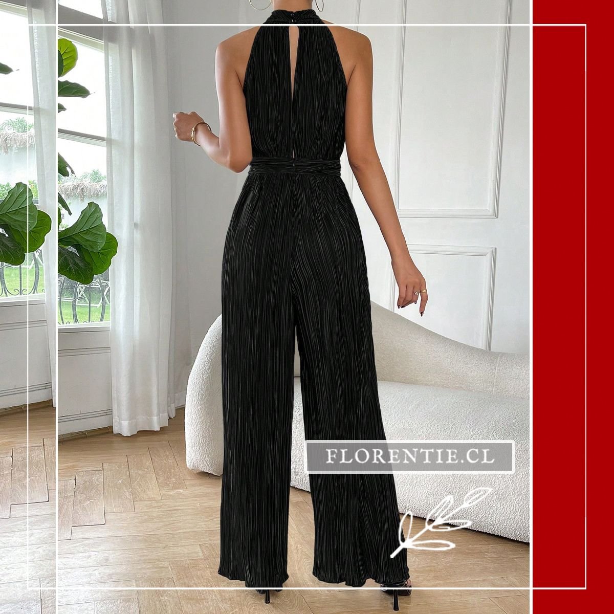 Enterito halter: diseño en negro con cuello alto y pantalón palazzo plisado. Este modelo combina elegancia y comodidad con su cuello halter que se ata en la nuca para soporte seguro. La banda ancha en cintura permite ajuste personalizado y marca la silueta de forma favorecedora. Perfecto para eventos formales, cócteles, bodas y ocasiones especiales. La tela plisada con acabado satinado ofrece movimiento fluido y elegancia. El pantalón de corte amplio facilita el caminar con comodidad. Combina con accesorios metálicos para contrastar con el negro. ¿Lista para destacar con un enterito versátil que une sofisticación y funcionalidad?