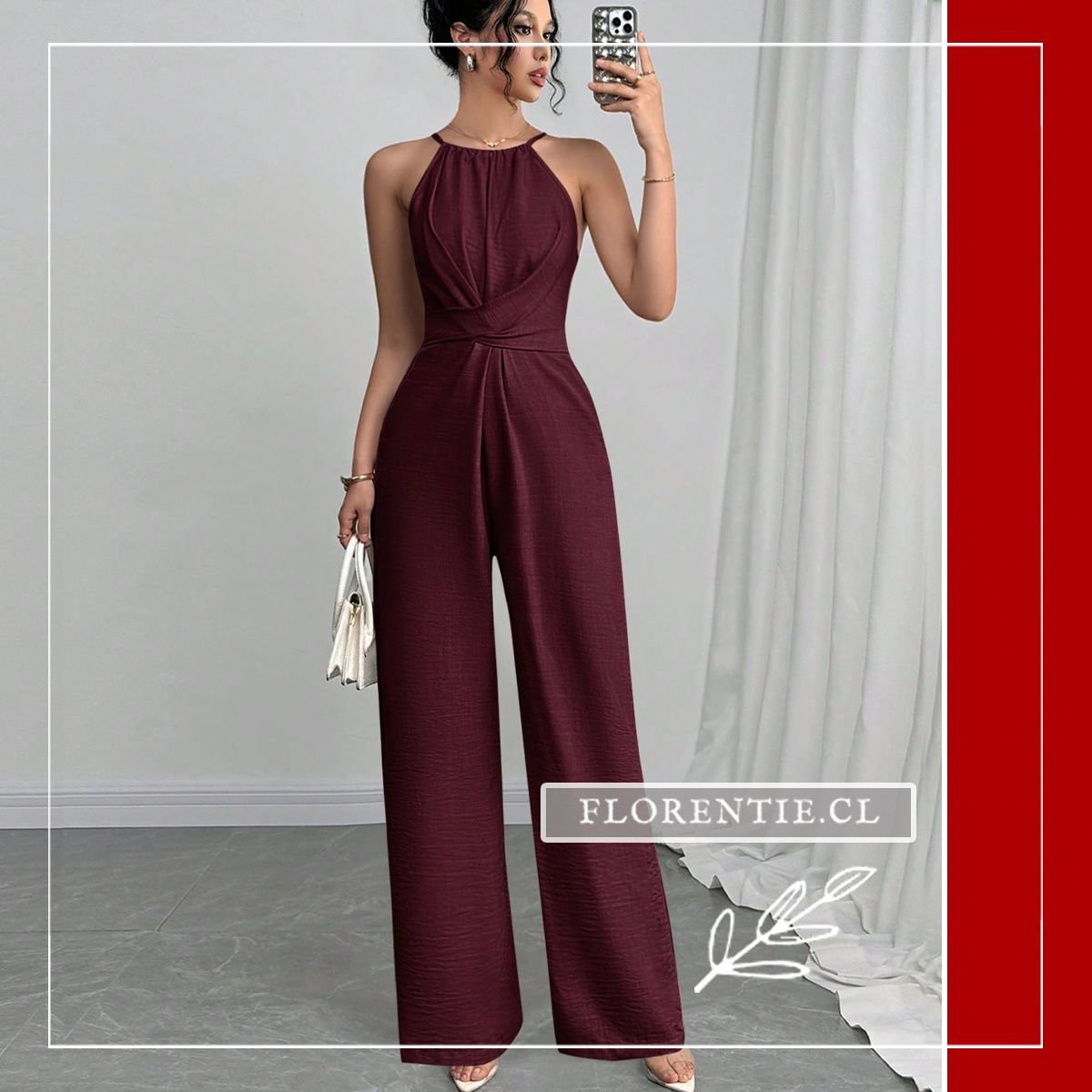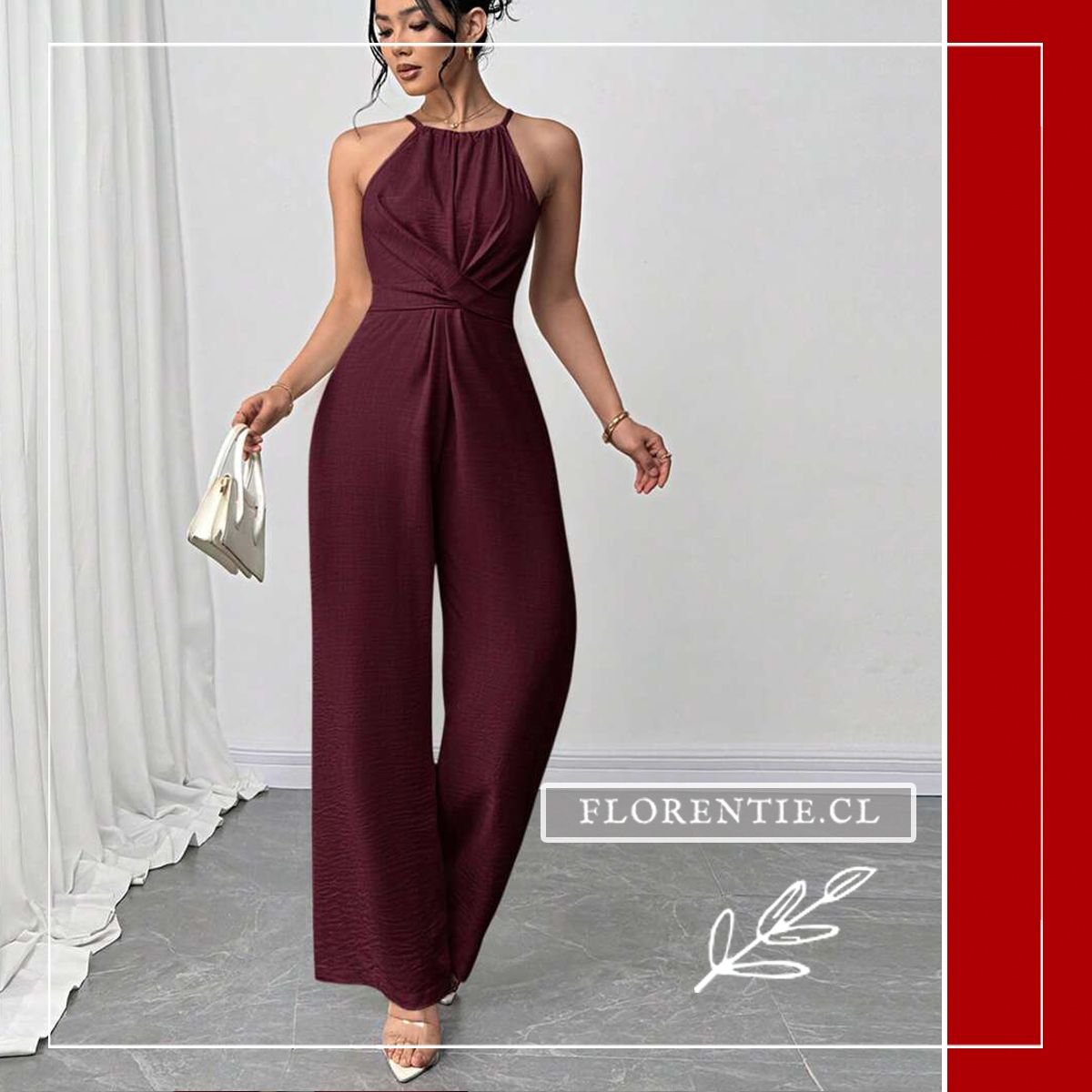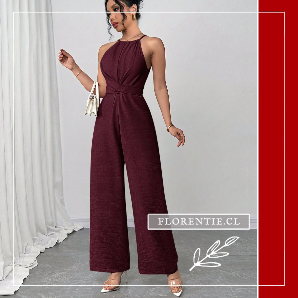 Enterito matrimonio: diseño halter en burdeos con pantalón palazzo y cinturón anudado. Este modelo elegante combina sofisticación y comodidad con su escote fruncido que crea un efecto drapeado favorecedor. El pantalón de corte amplio permite movimiento total, ideal para bailes y eventos prolongados. Perfecto para bodas, cócteles, ceremonias y eventos semi-formales. La cintura marcada con cinturón estiliza la silueta de forma natural. El tejido con textura ligera garantiza comodidad. Combina con tacones altos y accesorios dorados.