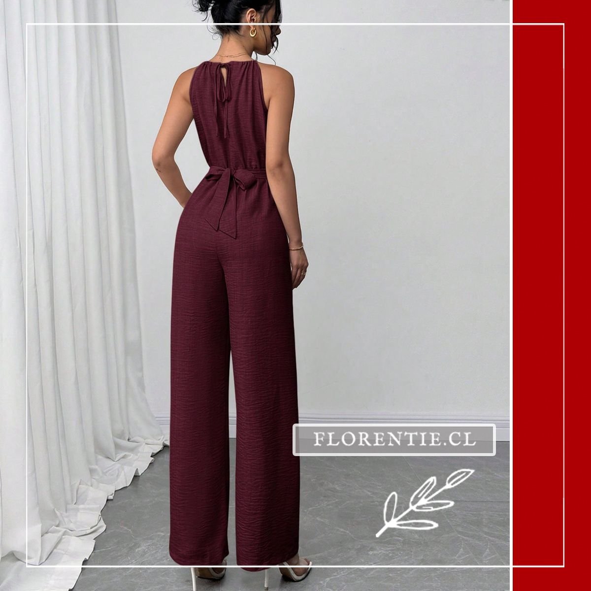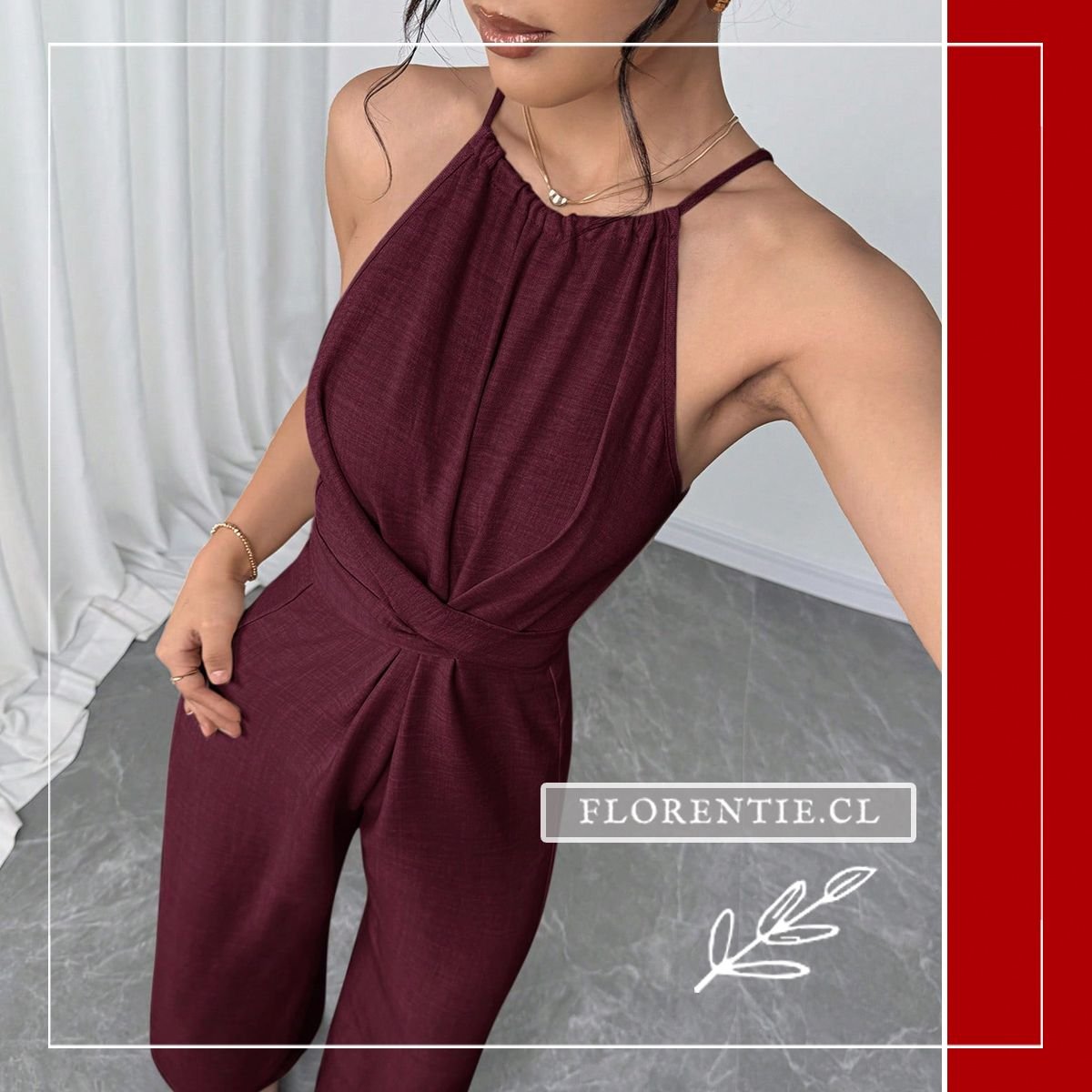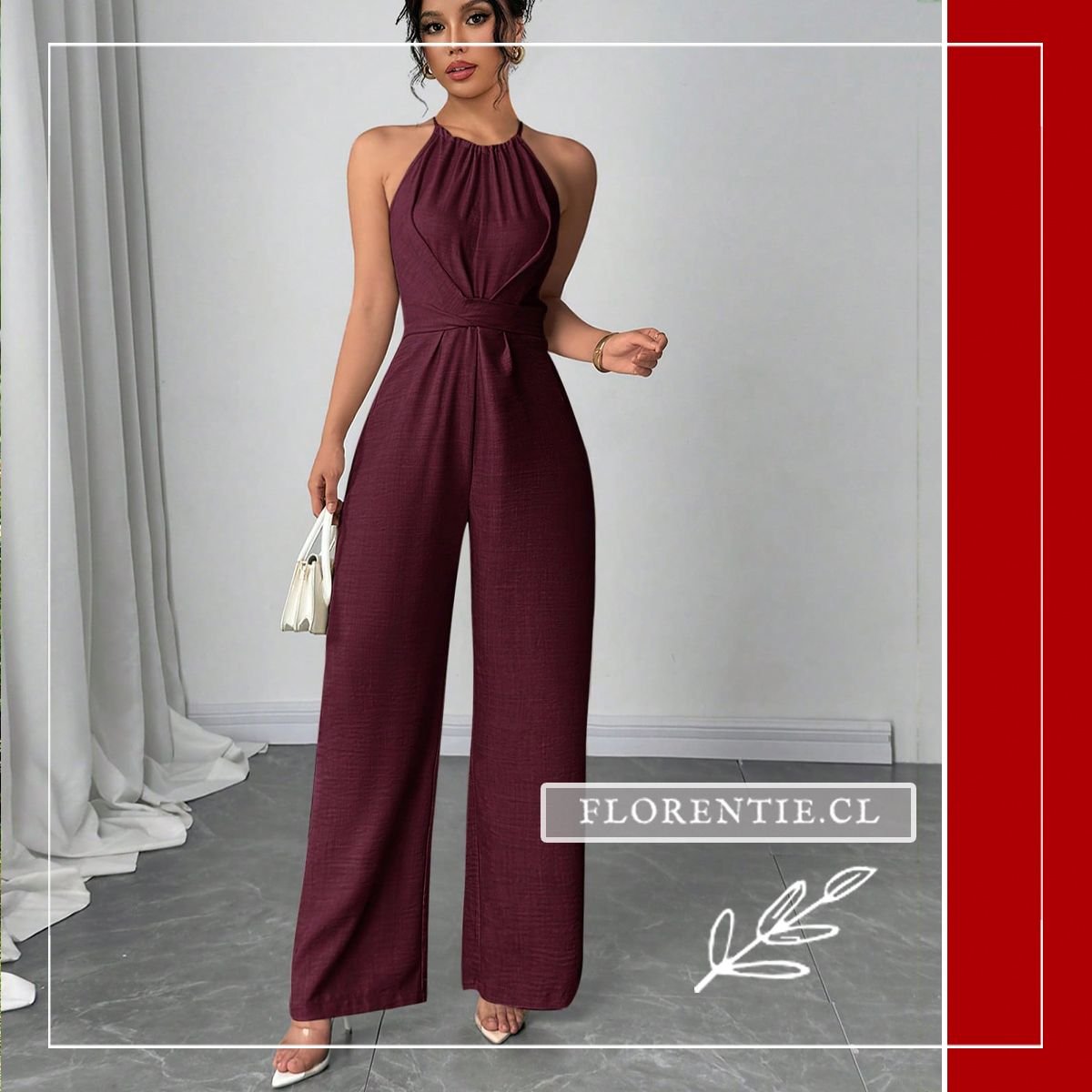 Enterito matrimonio: diseño halter en burdeos con pantalón palazzo y cinturón anudado. Este modelo elegante combina sofisticación y comodidad con su escote fruncido que crea un efecto drapeado favorecedor. El pantalón de corte amplio permite movimiento total, ideal para bailes y eventos prolongados. Perfecto para bodas, cócteles, ceremonias y eventos semi-formales. La cintura marcada con cinturón estiliza la silueta de forma natural. El tejido con textura ligera garantiza comodidad. Combina con tacones altos y accesorios dorados.