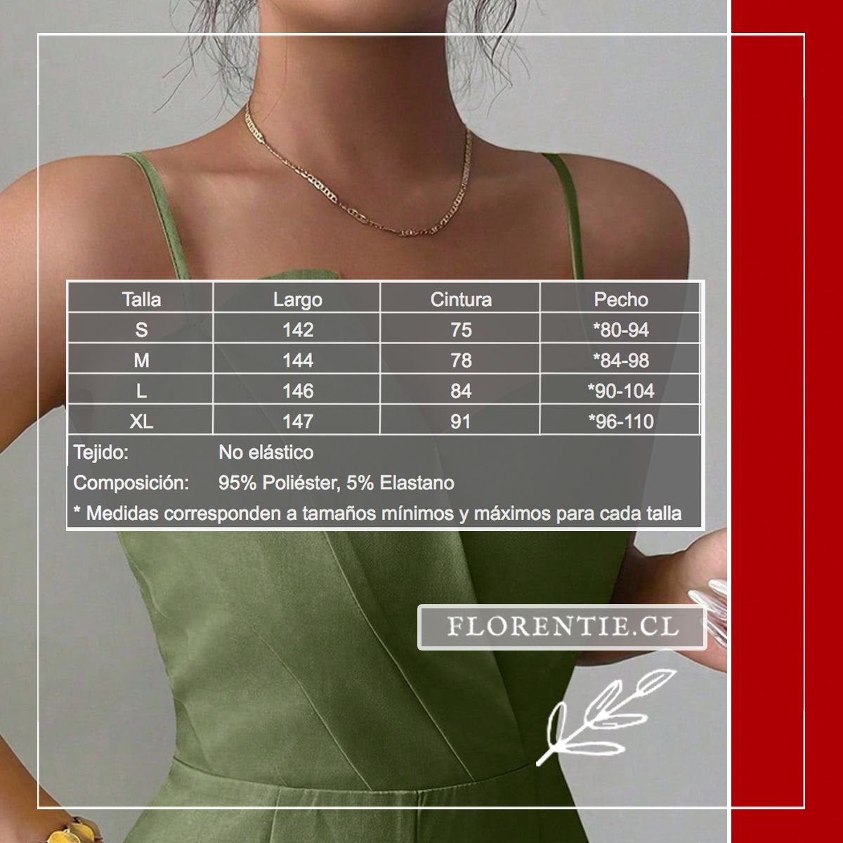 Enterito verde militar: tu outfit solución para eventos que demandan elegancia y comodidad. Este jumpsuit de verde oliva combina un bustier con escote asimétrico y tirantes ajustables con un pantalón palazzo de talle alto que estiliza tu figura.