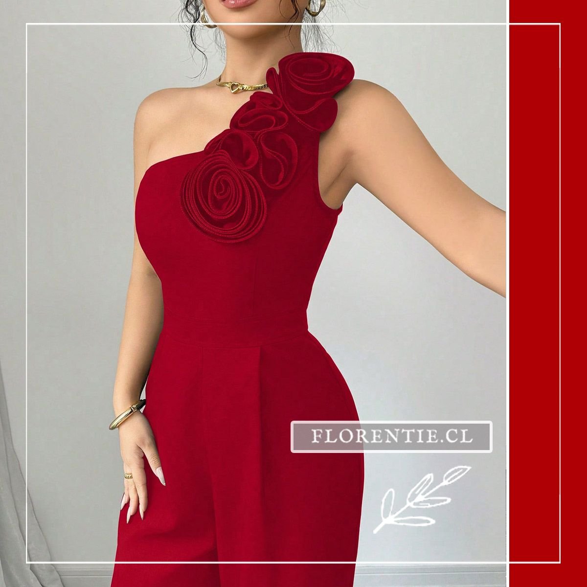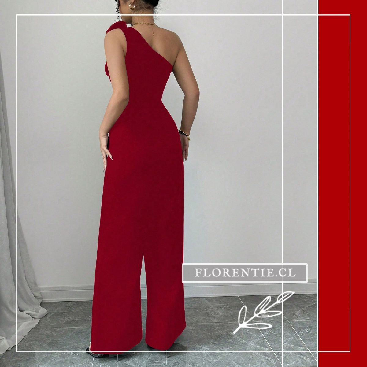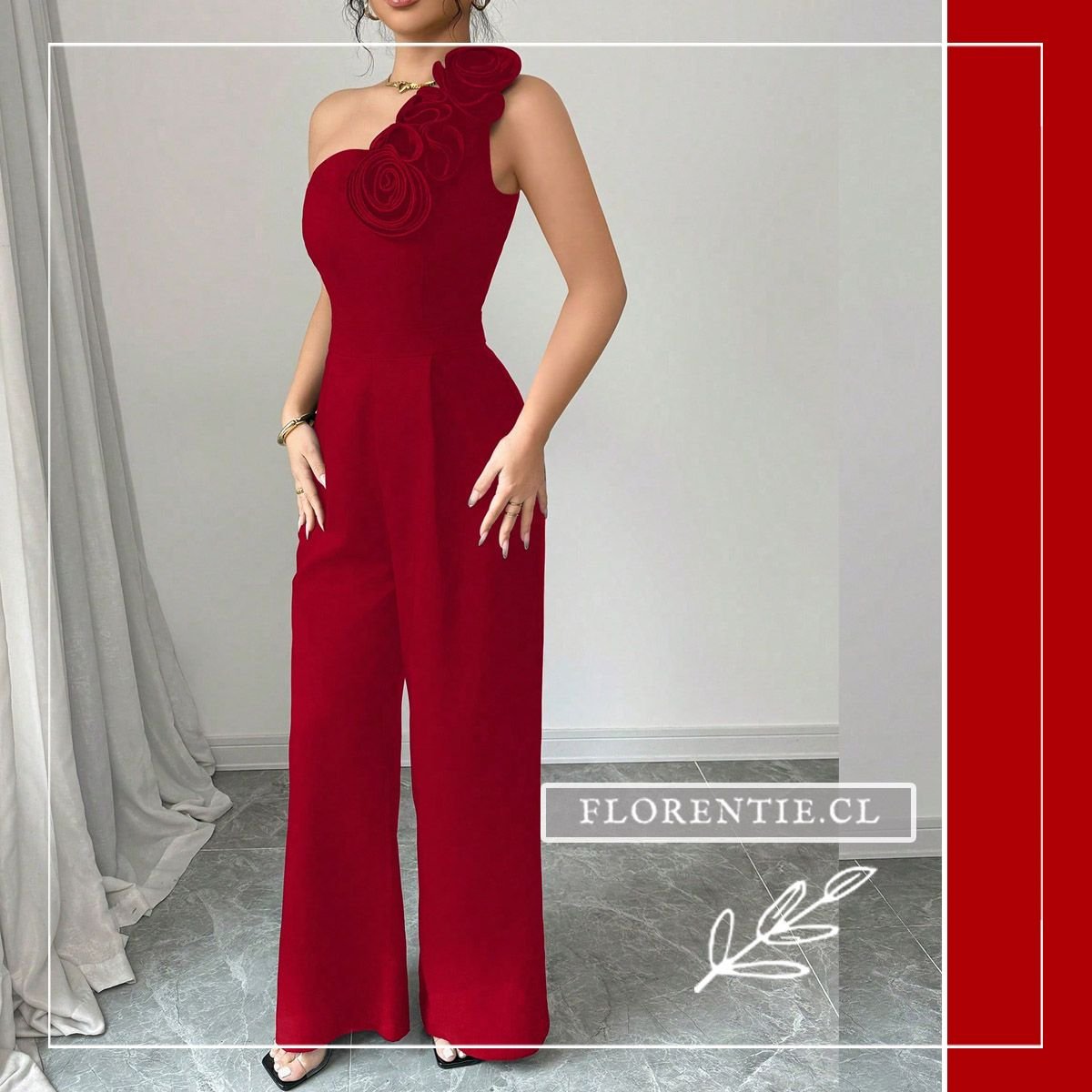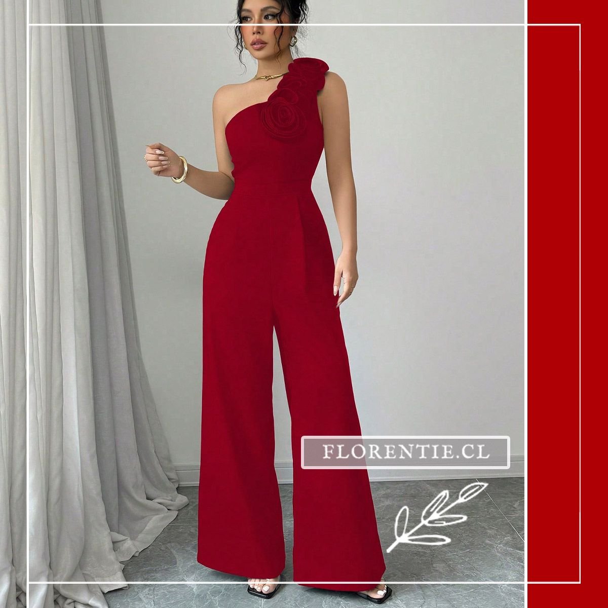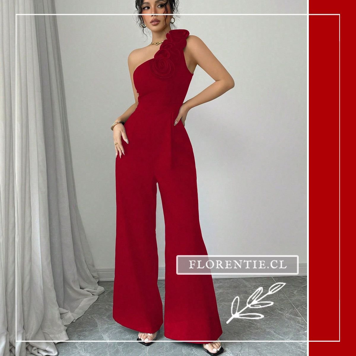 Entero rojo cautivante de diseño one-shoulder asimétrico y un exclusivo detalle floral en relieve sobre el hombro. Su torso ajustado define la silueta, mientras los pantalones palazzo de caída fluida añaden comodidad y elegancia. Ideal para eventos formales como galas, cócteles de noche, bodas, fiestas de aniversario o recepciones de gala. Este enterizo es la pieza definitiva para un look sofisticado, audaz e inolvidable en cualquier ocasión especial.