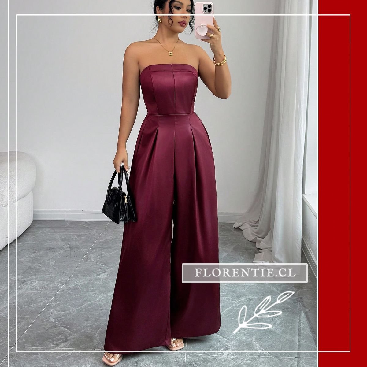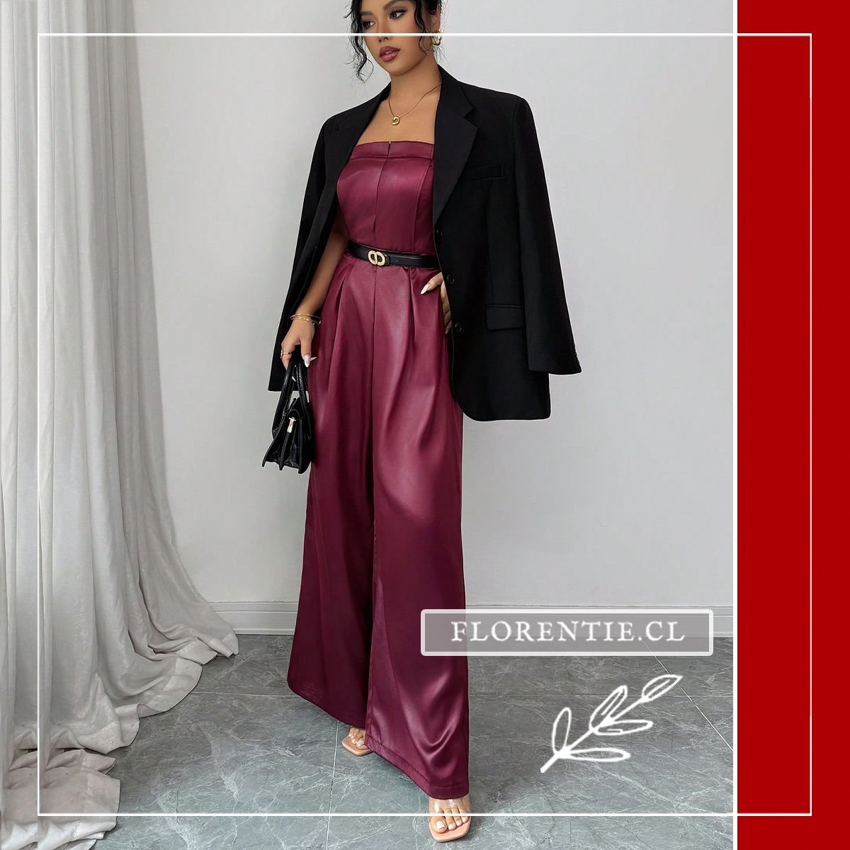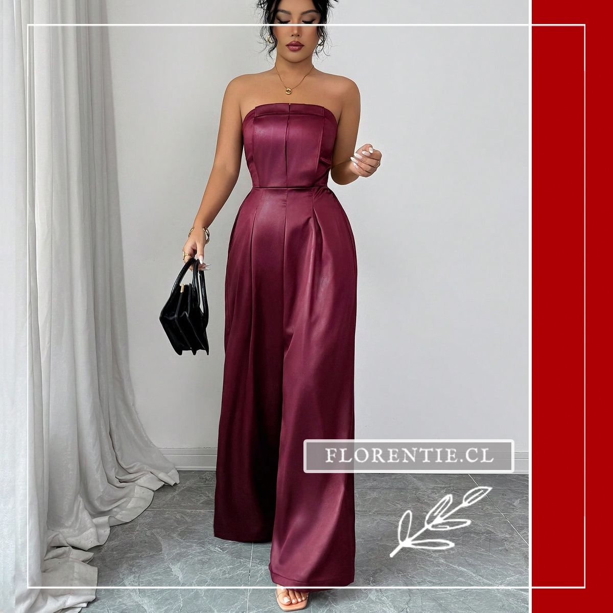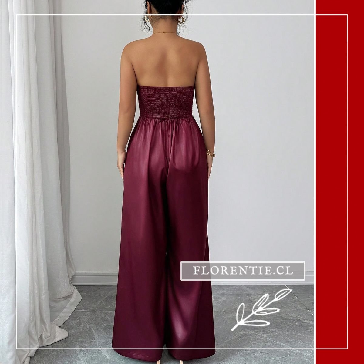 Mono enterito fiesta: elegancia y comodidad se unen en este jumpsuit color vino con diseño sofisticado para tus eventos especiales. Su torso strapless tipo corsé moldea tu silueta con paneles estructurados, mientras el pantalón palazzo de pierna ultra ancha ofrece amplitud y movimiento fluido. Los pliegues desde la cintura y bolsillos laterales añaden funcionalidad al estilo. Ideal para bodas, galas, cócteles formales o cenas de etiqueta, esta pieza en tela satinada brinda versatilidad para looks formales o semi-formales, garantizando elegancia atemporal y confianza en cualquier celebración memorable.
