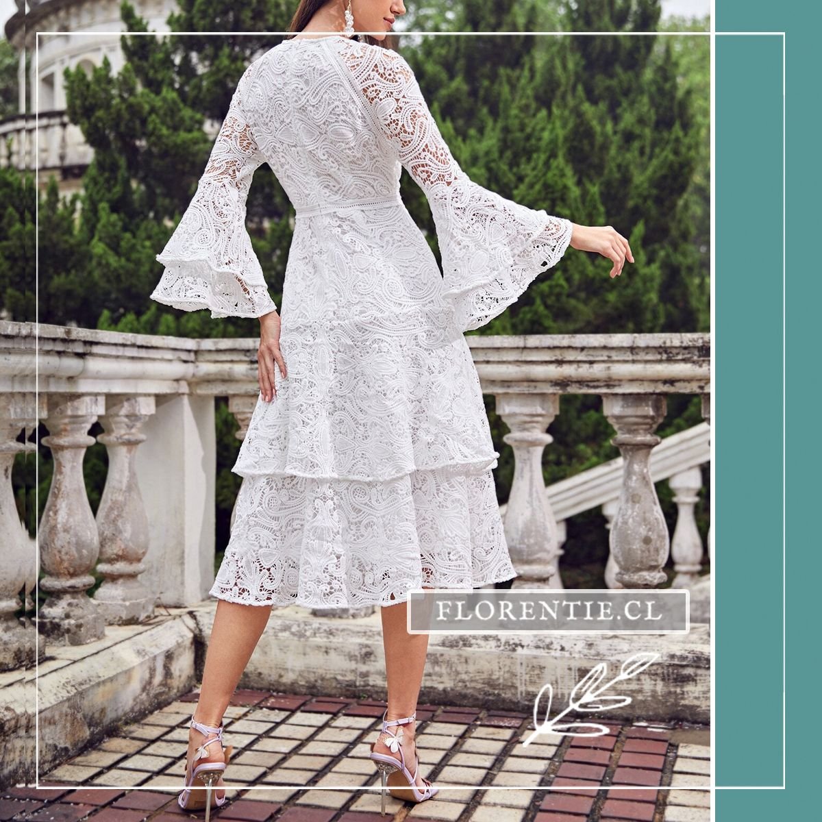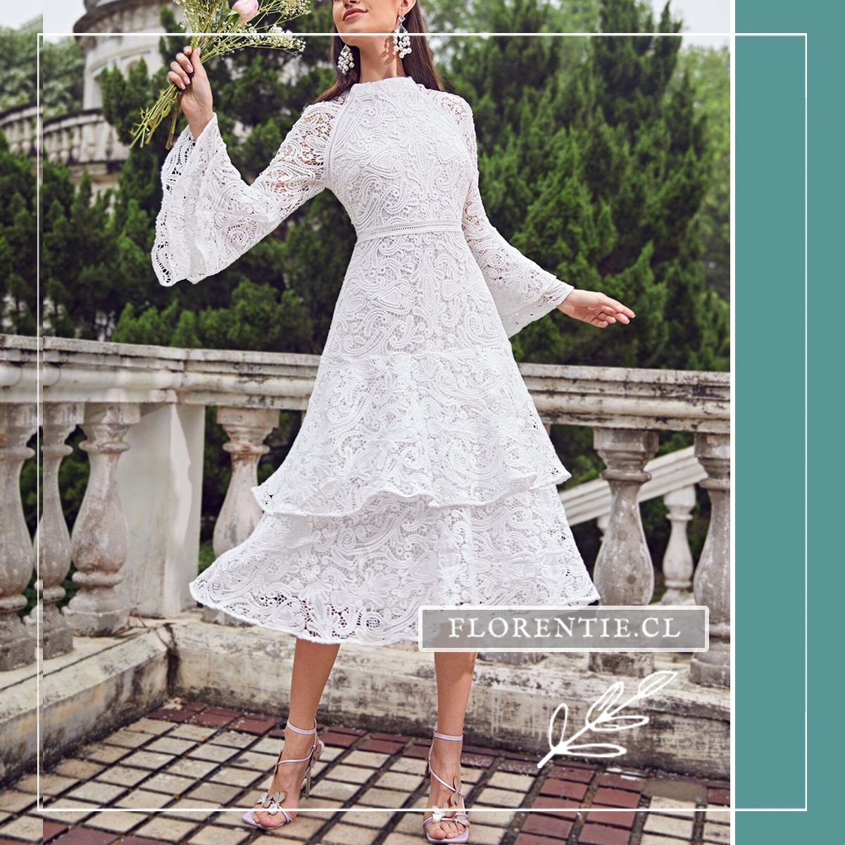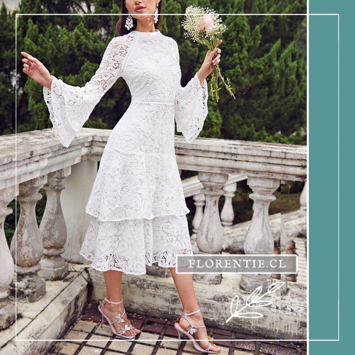Vestido novia corte A: la elección ideal para una boda con un estilo bohemio chic, romántico y lleno de encanto. Este vestido midi blanco de encaje presenta un cuerpo ajustado y una falda con capas de volantes que crean una silueta femenina y con movimiento. Sus mangas largas acampanadas y el cuello alto cerrado aportan un toque vintage único. Perfecto para una boda al aire libre, una celebración íntima en el campo, una ceremonia civil o un brunch nupcial. El cinturón define la cintura sutilmente. Consigue un look de novia distintivo y lleno de personalidad, ideal para quien busca alejarse de lo convencional.
