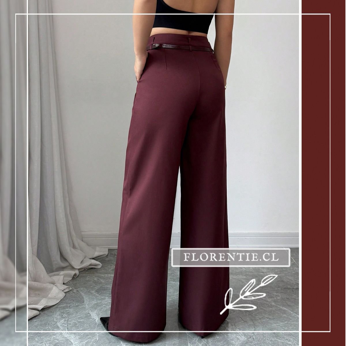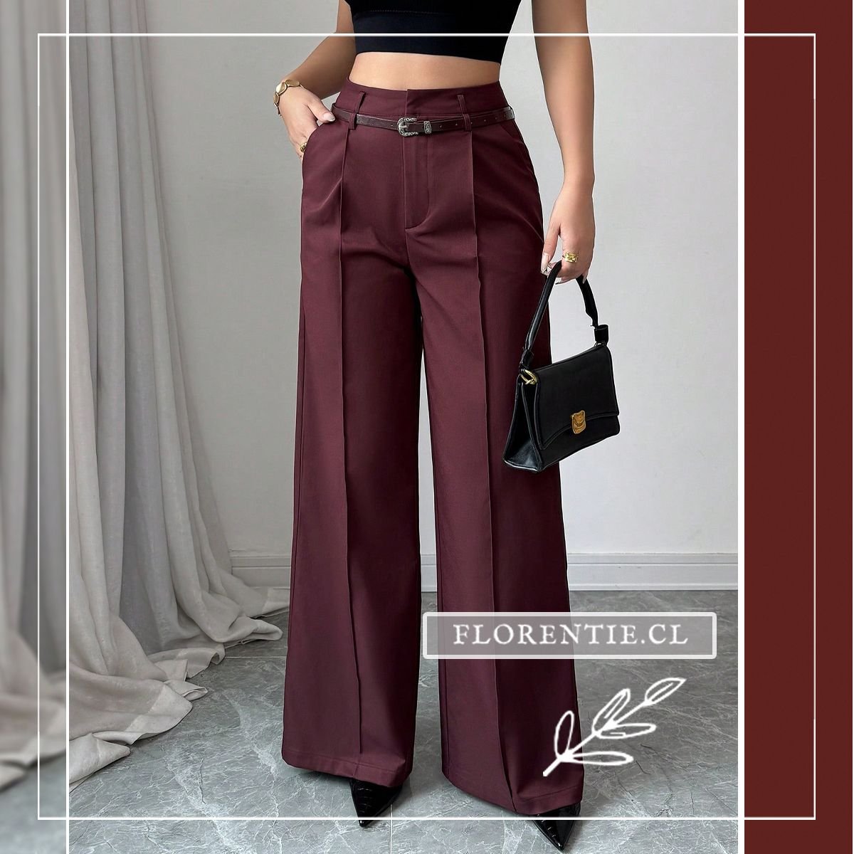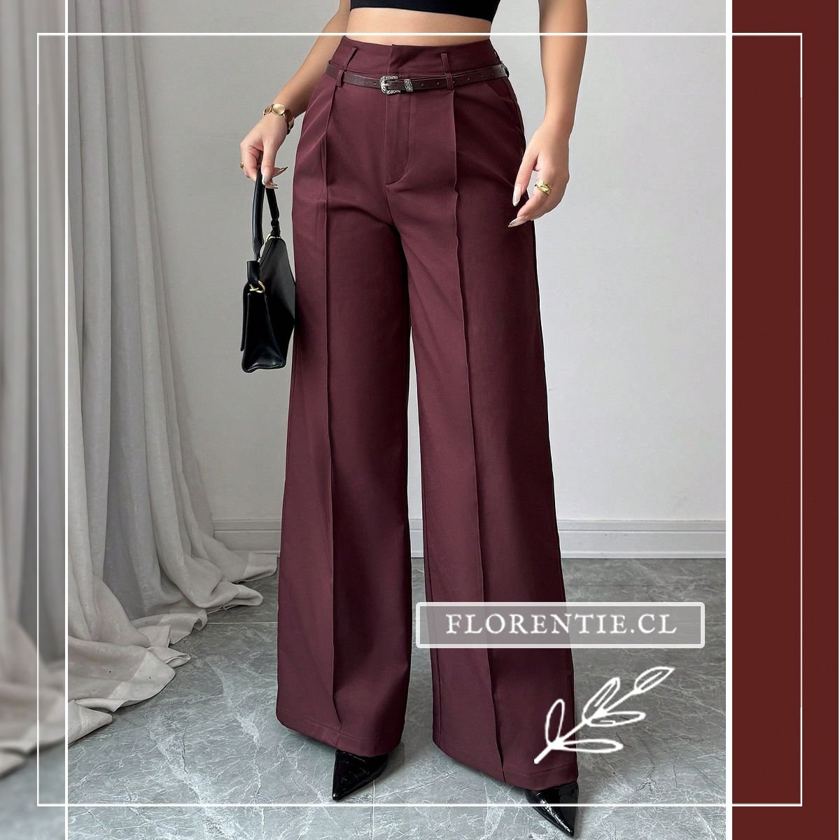 Palazzo burdeos: elegancia líquida que se adapta a tu ritmo. Confeccionados en tejido fluido de alta calidad (similar a gabardina), estos pantalones de tono vino intenso destacan por su silueta oversized y talle alto con pinzas frontales que esculpen una figura estilizada. El cinturón a juego con hebilla plateada vintage añade un toque de sofisticación retro, mientras los bolsillos laterales y la caída hasta el suelo brindan comodidad sin sacrificar estilo.