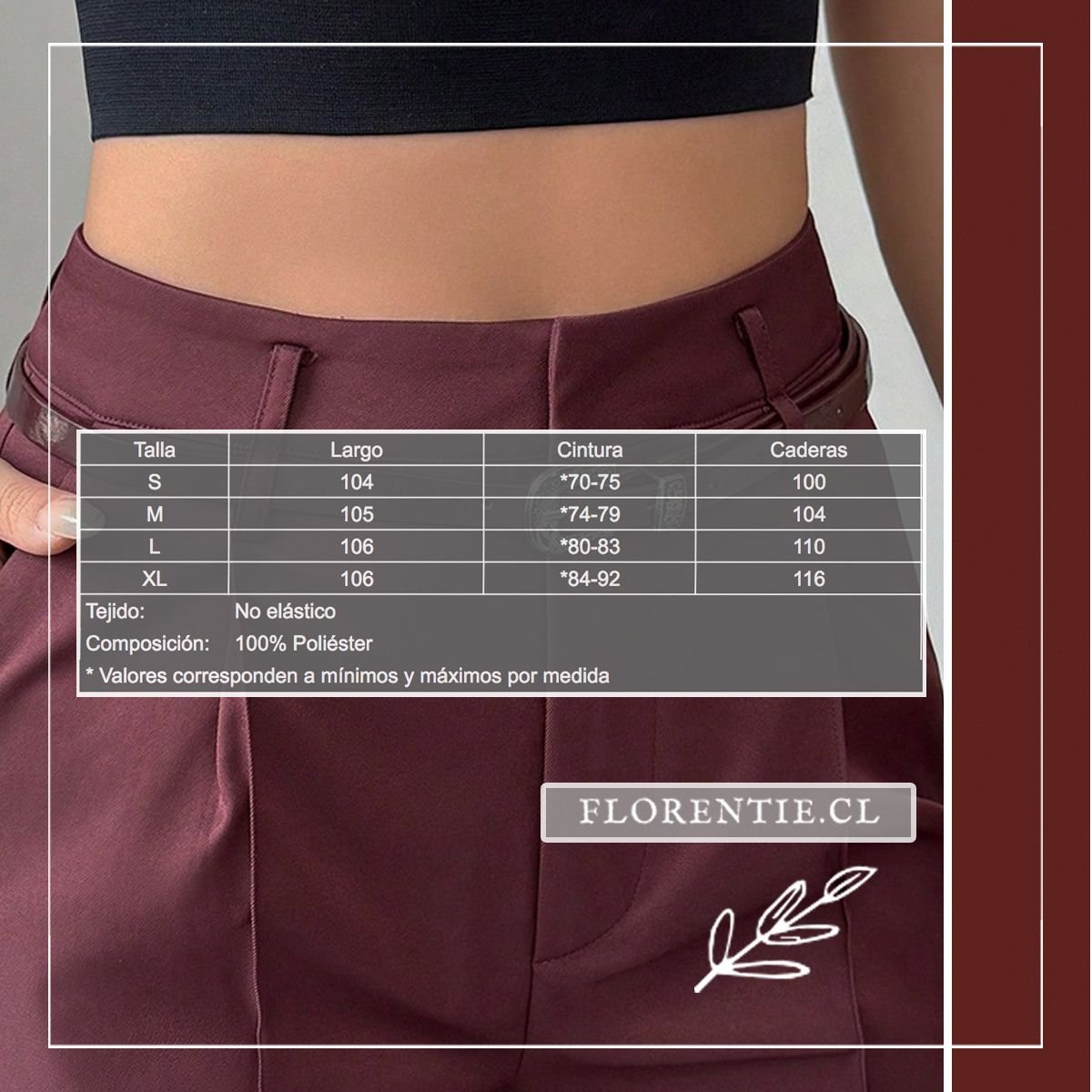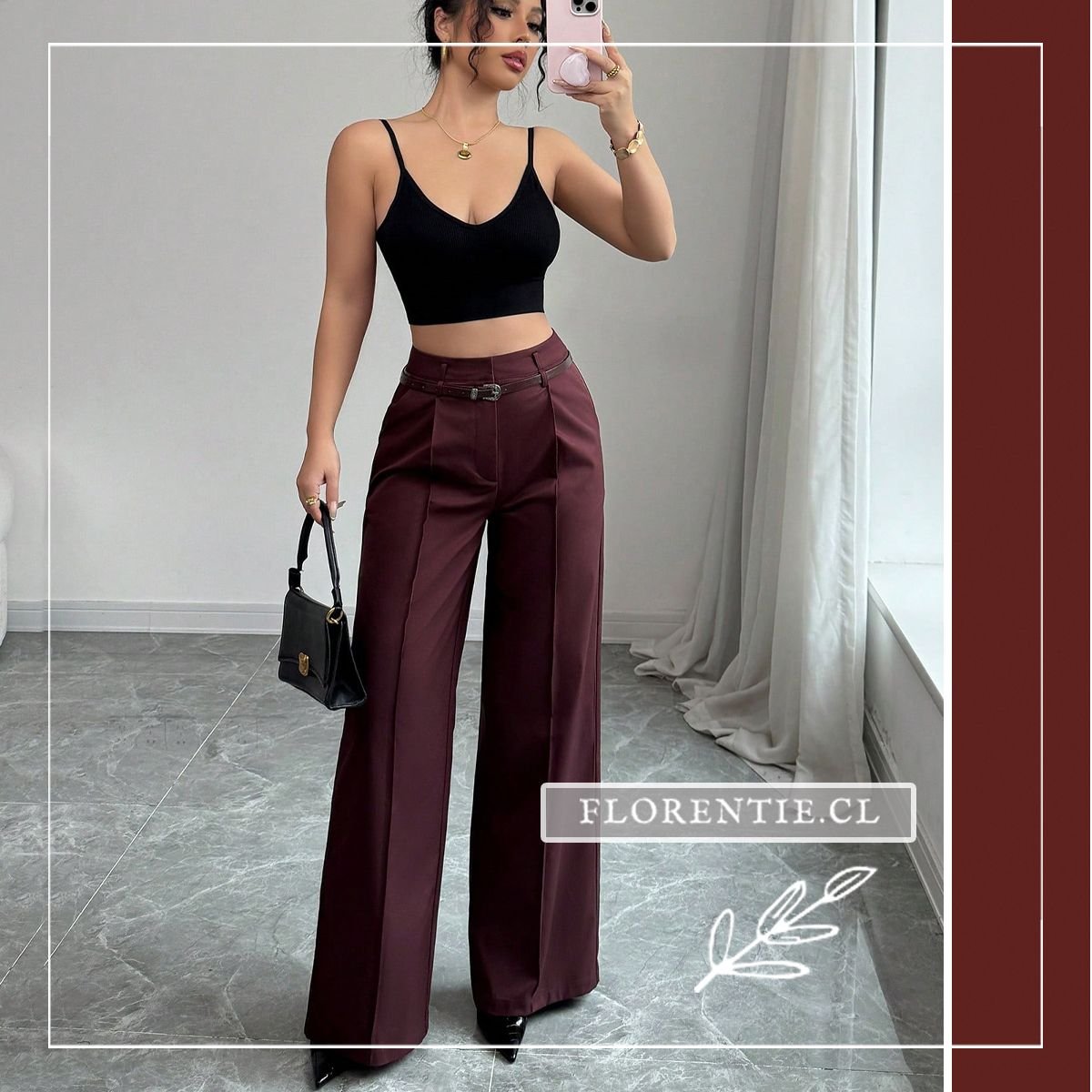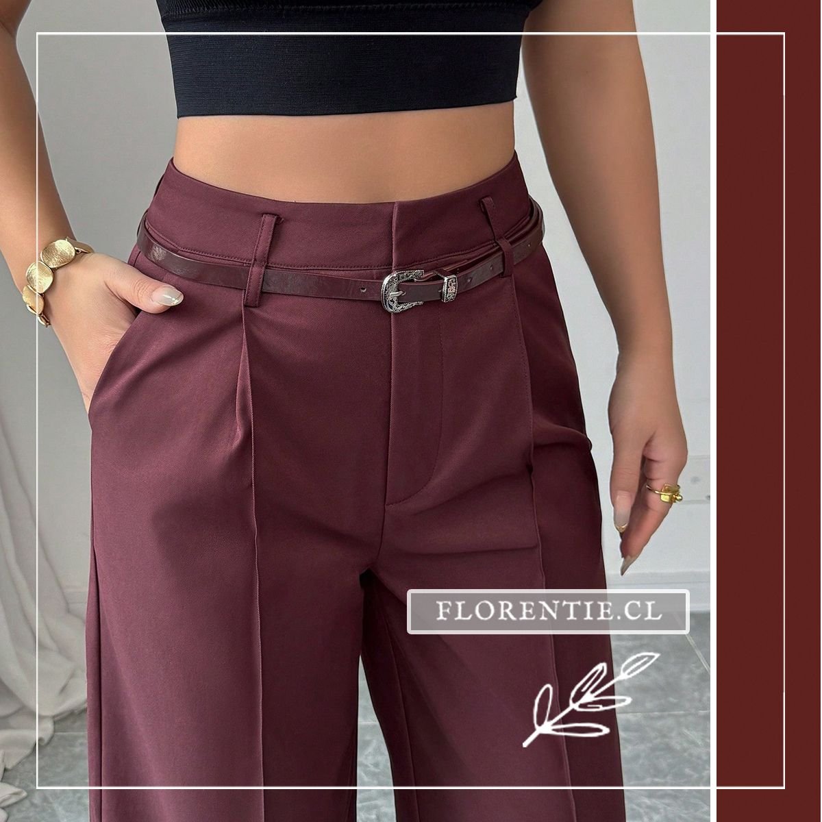 Palazzo burdeos: elegancia líquida que se adapta a tu ritmo. Confeccionados en tejido fluido de alta calidad (similar a gabardina), estos pantalones de tono vino intenso destacan por su silueta oversized y talle alto con pinzas frontales que esculpen una figura estilizada. El cinturón a juego con hebilla plateada vintage añade un toque de sofisticación retro, mientras los bolsillos laterales y la caída hasta el suelo brindan comodidad sin sacrificar estilo.