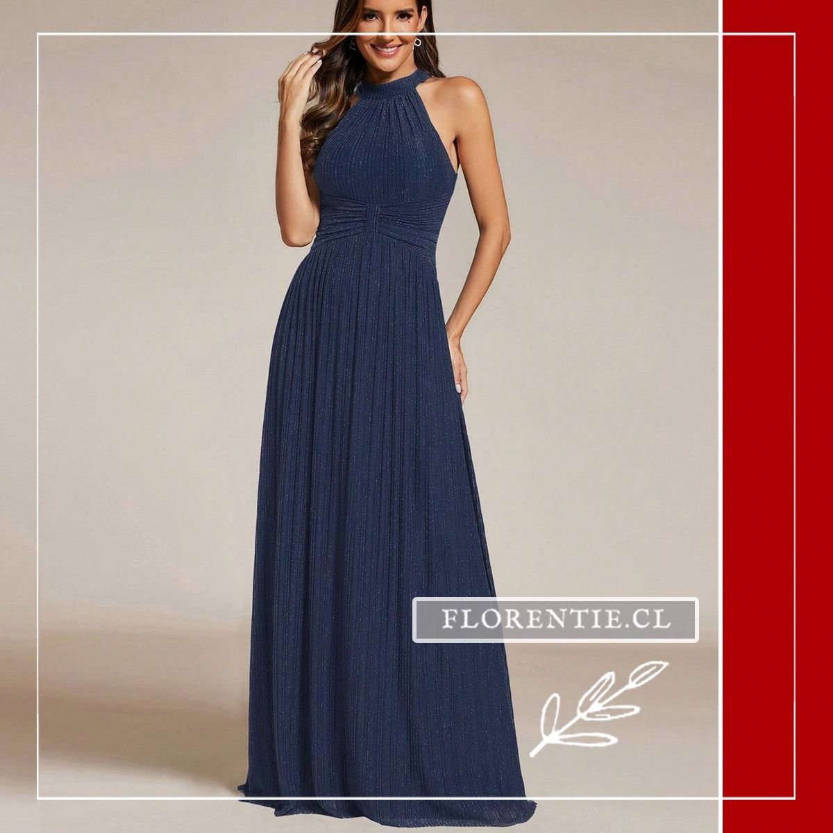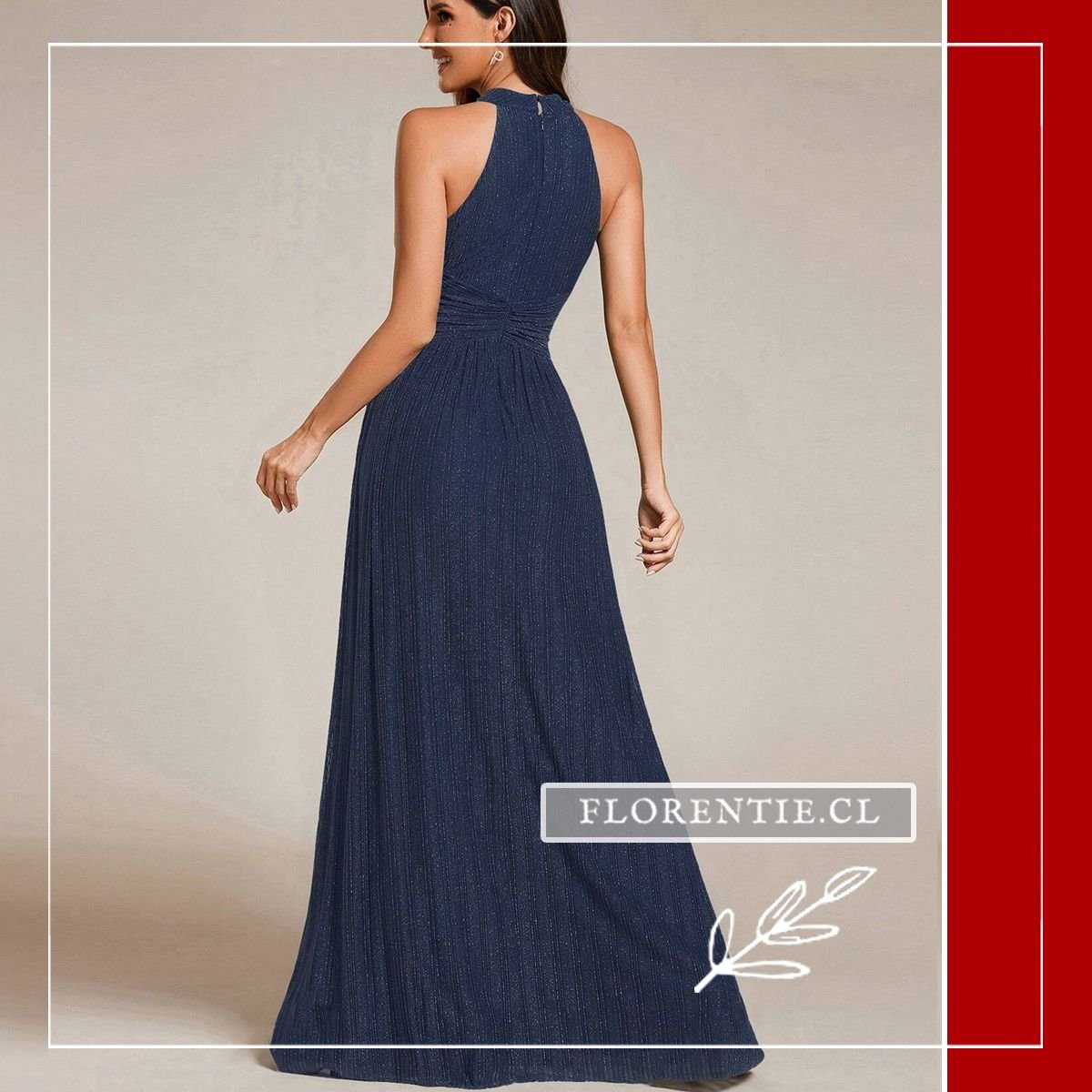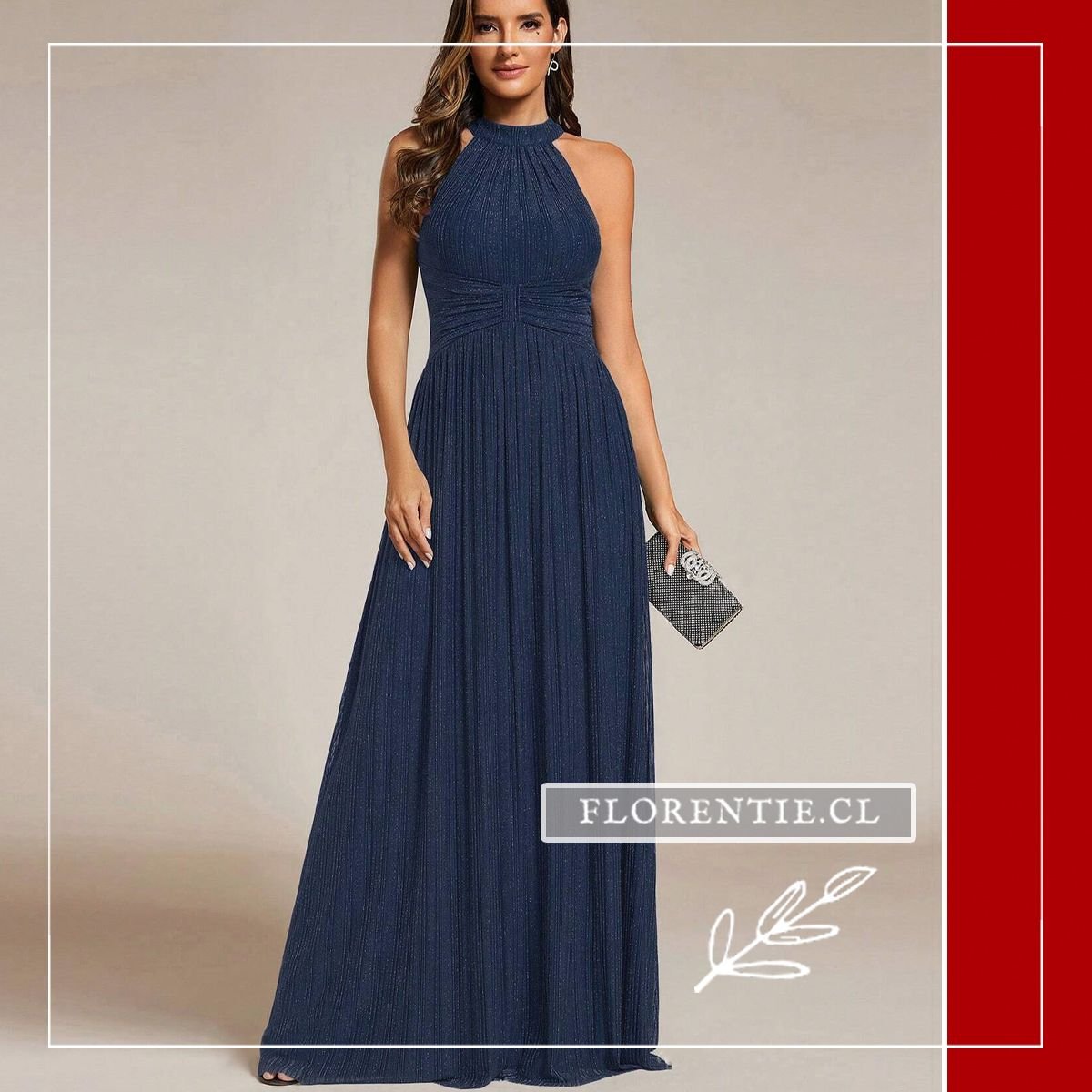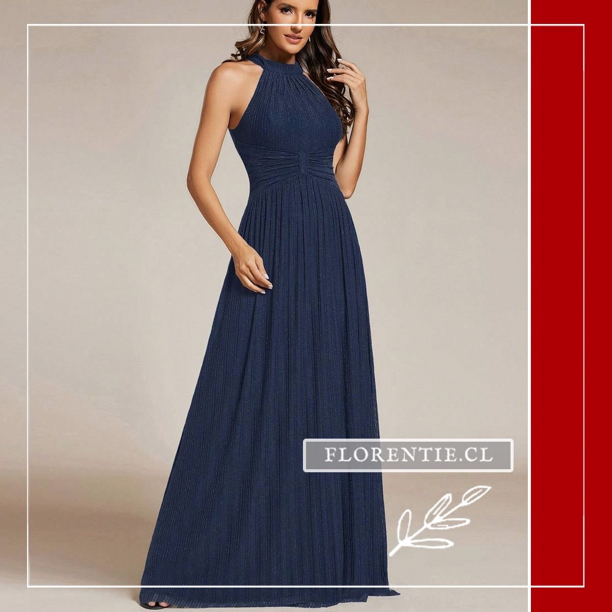 Vestido fiesta cuello halter, una pieza de líneas depuradas que realza tu figura con elegancia para eventos formales.