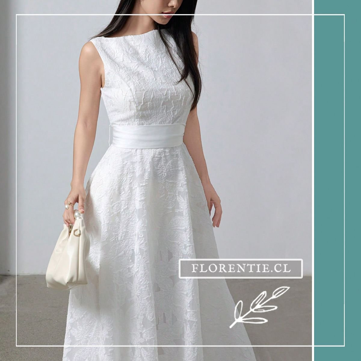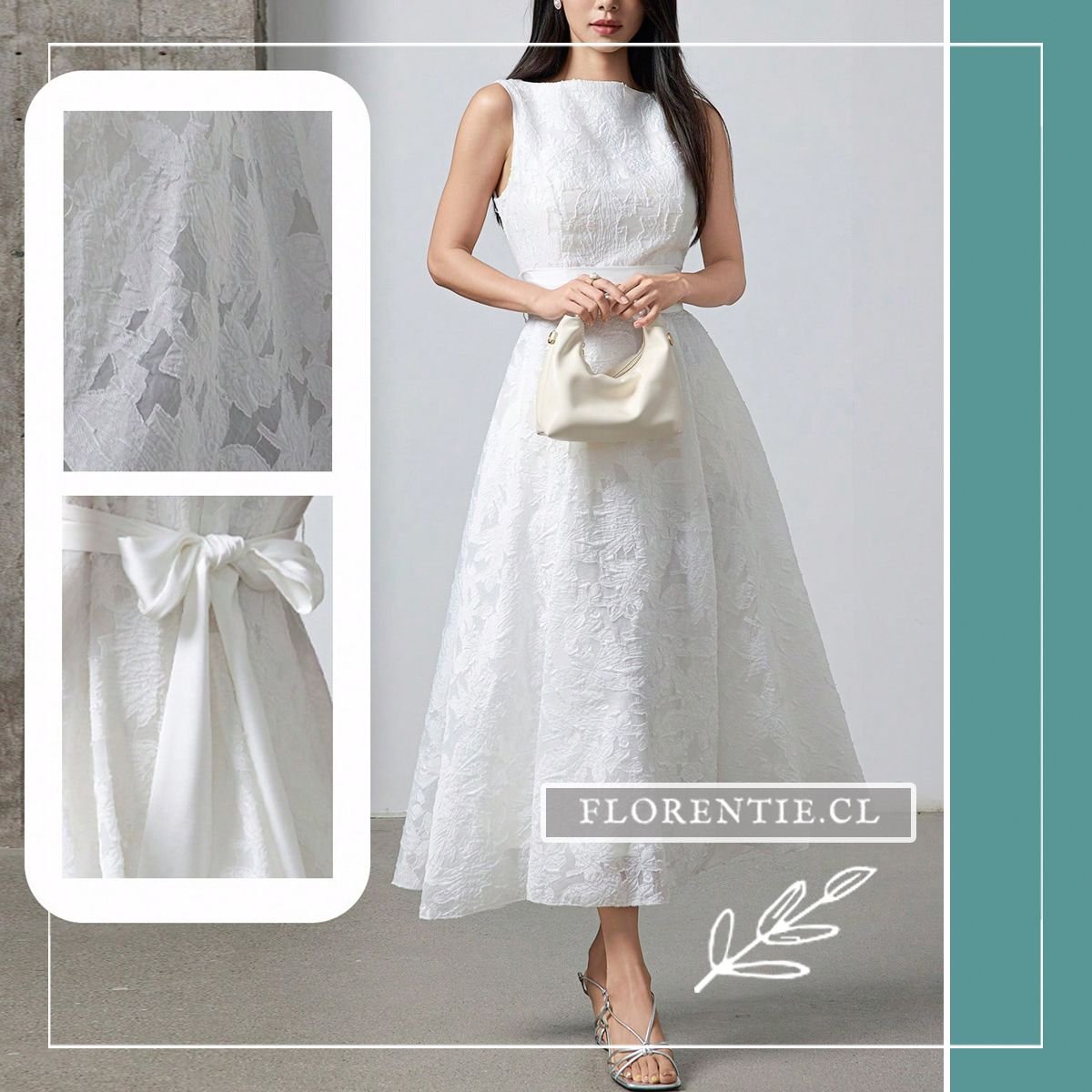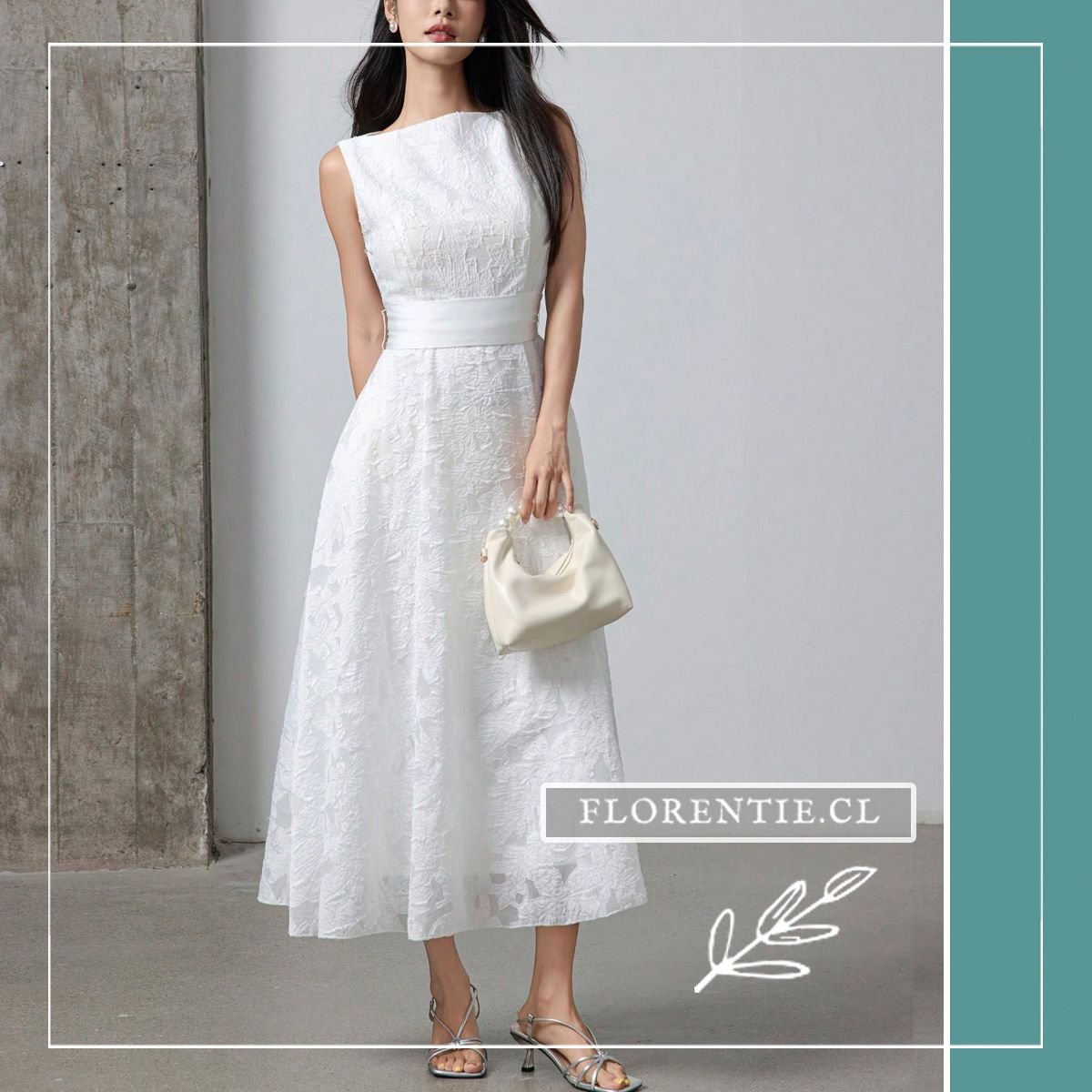 Vestido blanco Castell: un diseño midi atemporal que ofrece elegancia sofisticada y un ajuste impecable para tu evento especial. Este vestido sin mangas presenta un escote barco y un torso ajustado que se abre en una falda tipo A de largo midi, creando una silueta favorecedora y clásica. El detalle del lazo en la espalda añade un toque de romanticismo discreto. Ideal para bodas, cócteles, ceremonias de graduación, eventos de gala o cenas formales. Su tejido texturizado con motivos sutiles aporta una sensación de lujo y refinamiento. Consigue un look pulcro y versátil, perfecto para ocasiones donde la elegancia discreta es la clave.