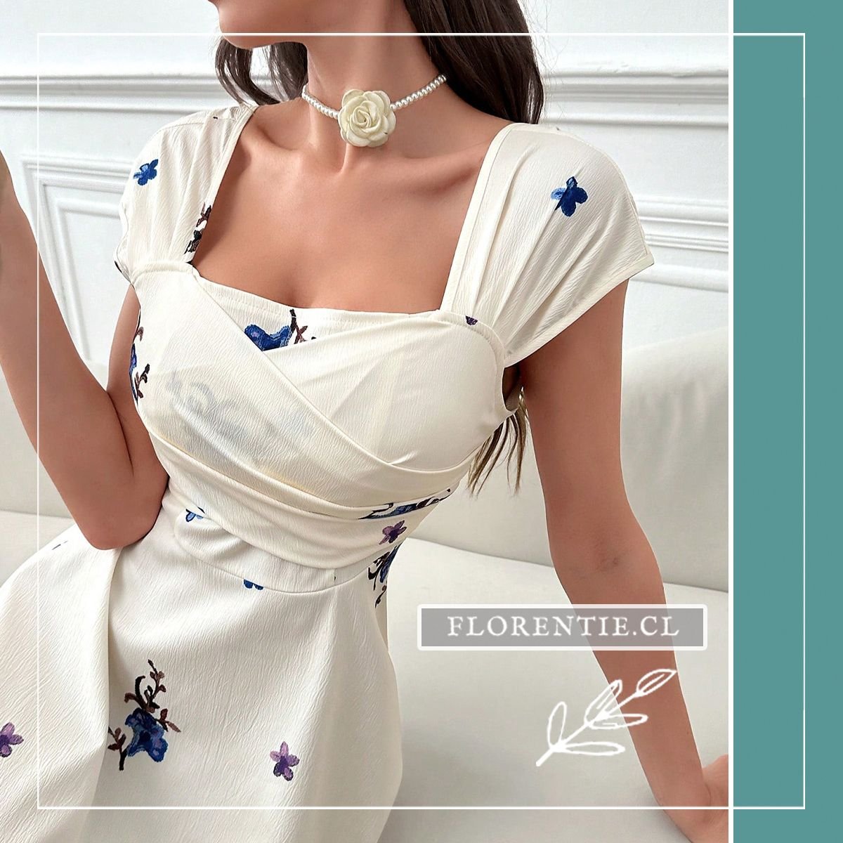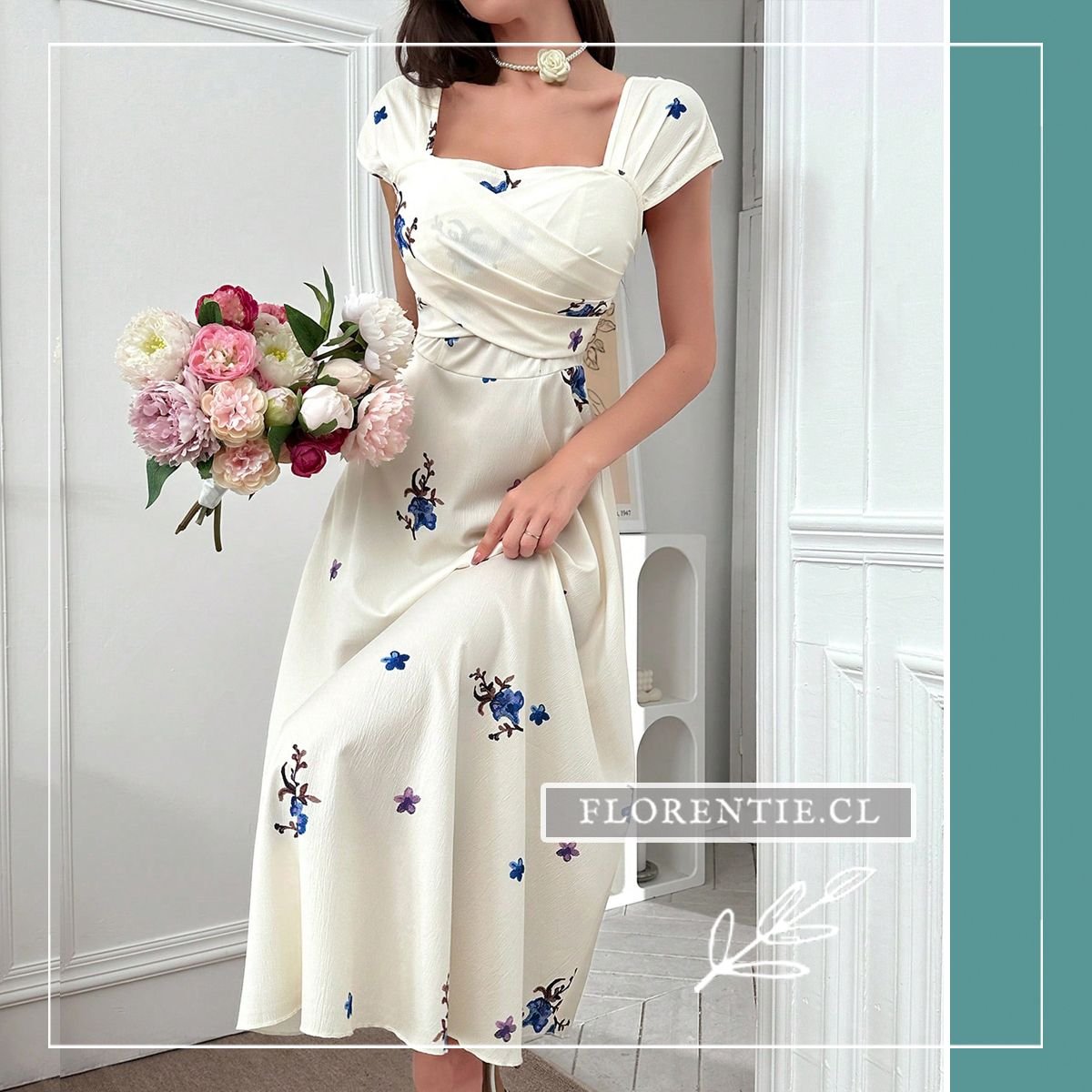Vestido blanco fiore: combina la frescura de un estampado floral con la elegancia atemporal de una silueta clásica. Este vestido midi en tono blanco presenta un escote cuadrado y mangas cortas, con un drapeado cruzado en el torso que define la cintura de forma favorecedora. Su falda amplia de aire vintage y el delicado estampado de flores azules y moradas crean un look romántico y refinado. Ideal para una boda de día, un brunch especial, una ceremonia de graduación o un evento de primavera. La tela texturizada aporta sofisticación y comodidad. Consigue un outfit lleno de encanto, perfecto para ocasiones que requieran un estilo femenino y distinguido.