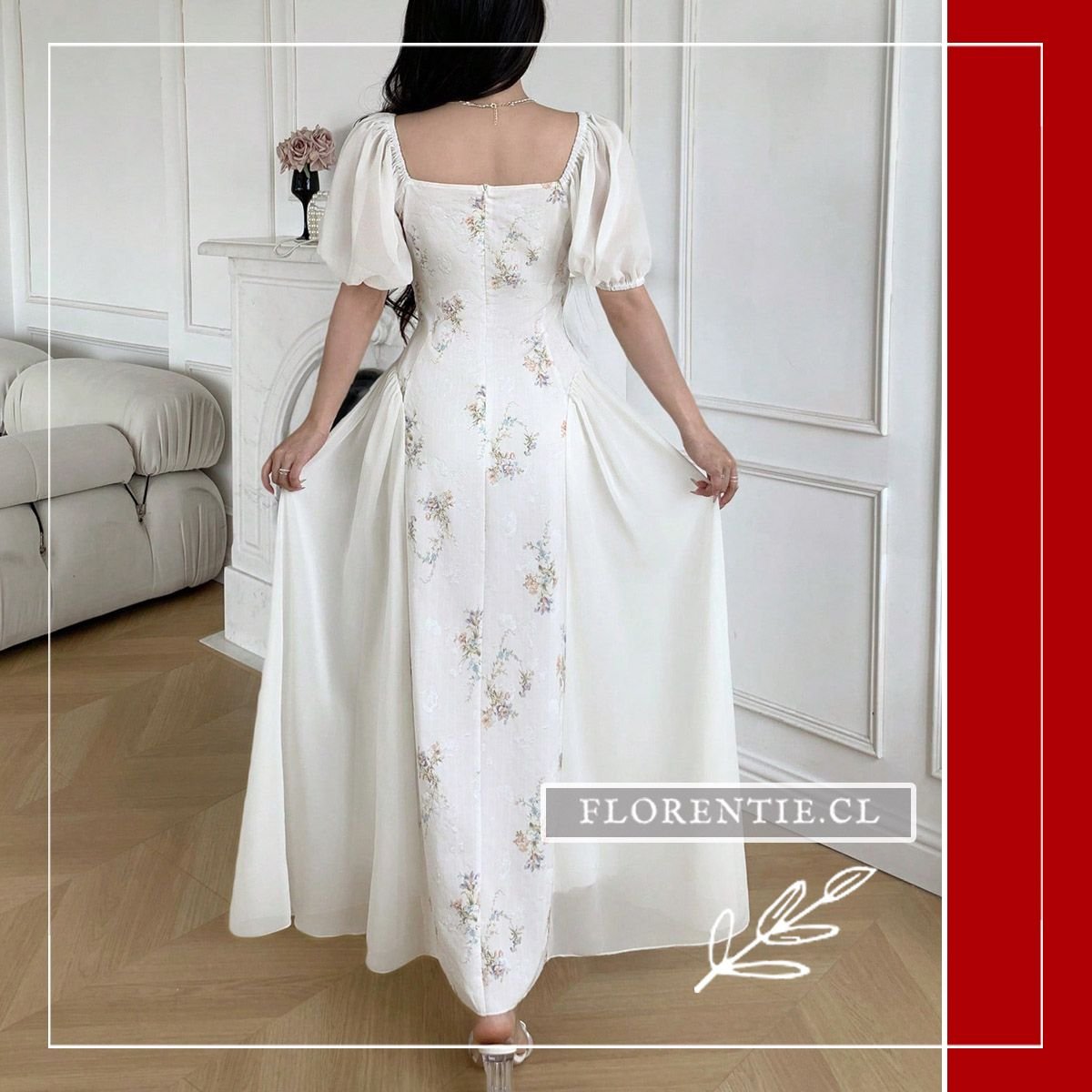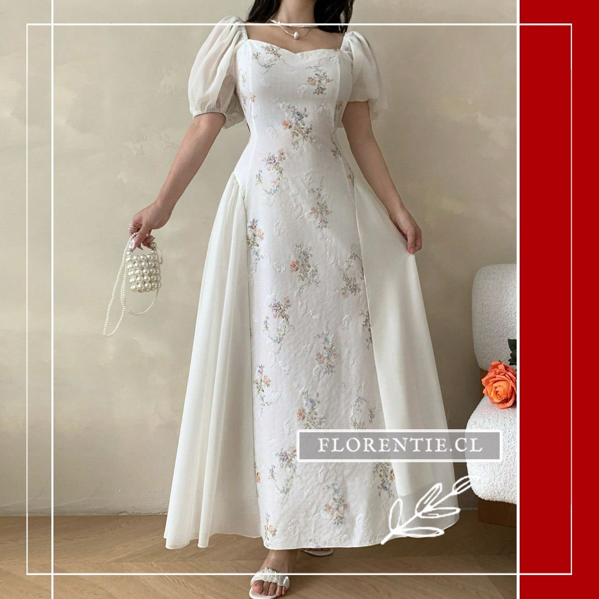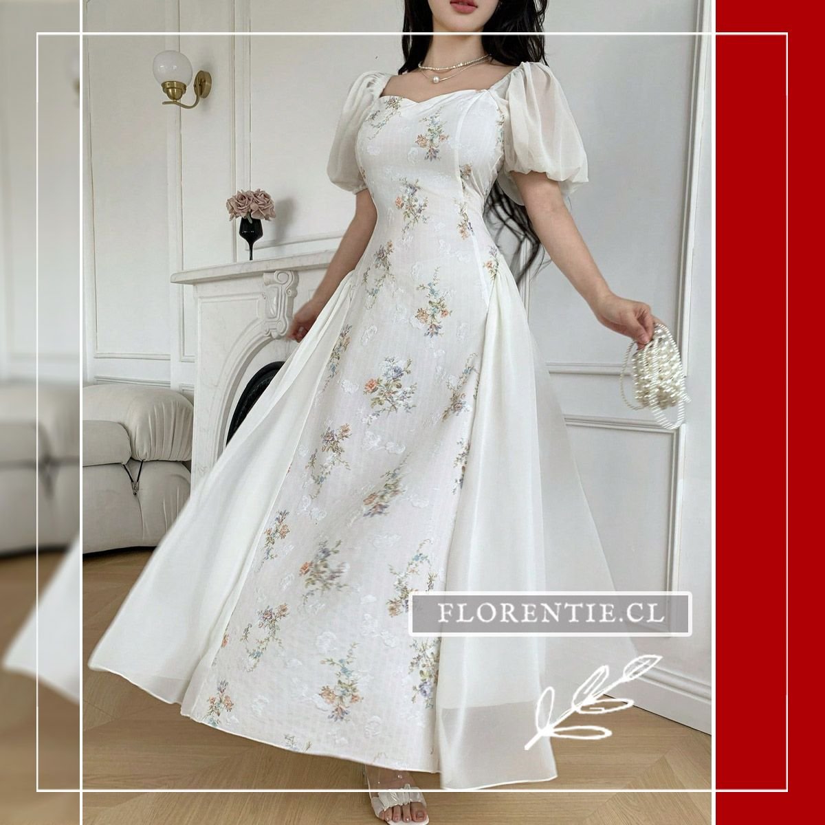 Vestido blanco Fiore: elegancia romántica y un toque vintage para tus momentos más especiales. Este vestido largo blanco presenta un escote corazón y mangas globo cortas de organza semitransparente. Su torso ajustado realza la cintura, mientras la falda combina una capa inferior con estampado floral delicado y una sobrecapa de gasa lisa. Ideal para bodas, eventos formales o sesiones fotográficas, este diseño ofrece un look vaporoso y sofisticado con cierre trasero.