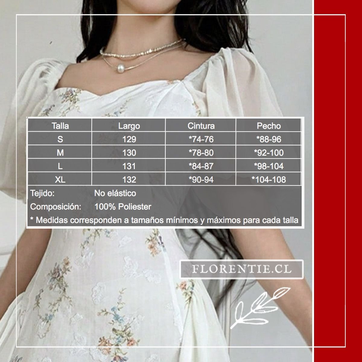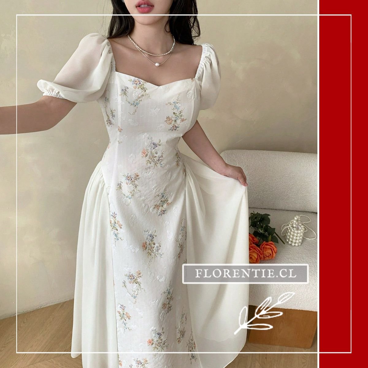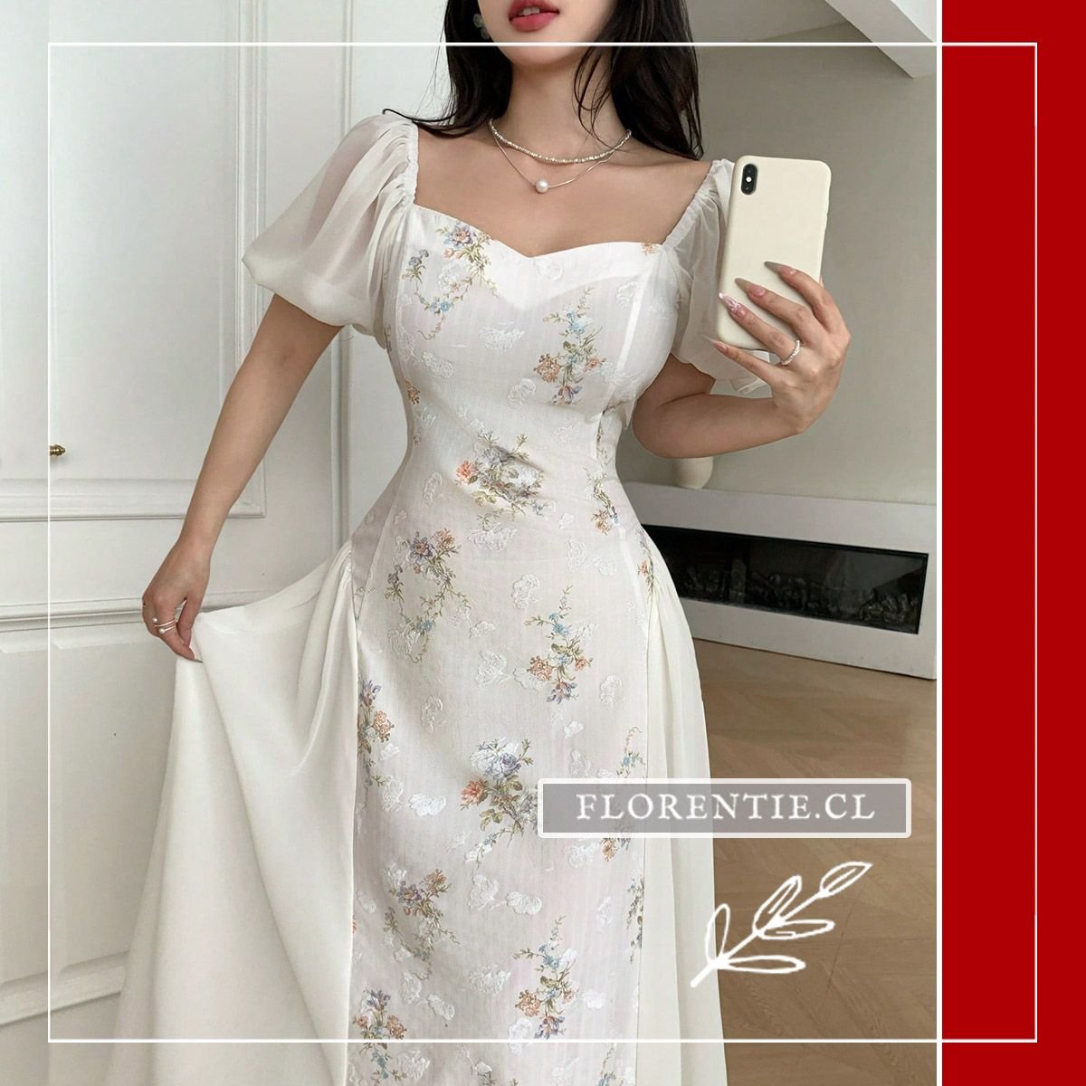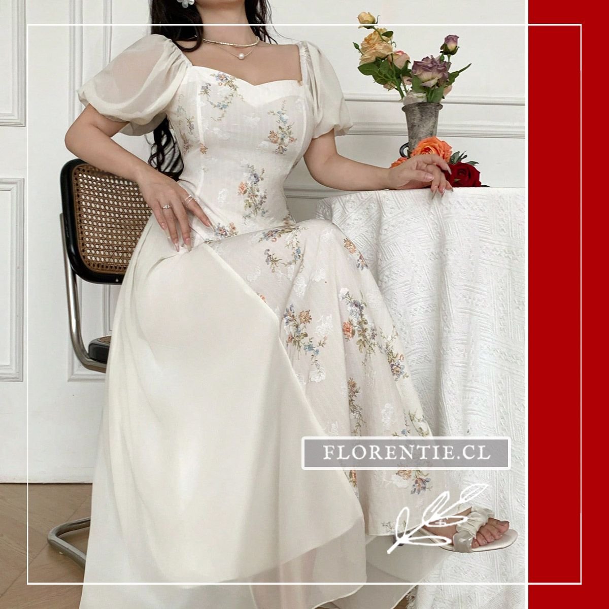 Vestido blanco Fiore: elegancia romántica y un toque vintage para tus momentos más especiales. Este vestido largo blanco presenta un escote corazón y mangas globo cortas de organza semitransparente. Su torso ajustado realza la cintura, mientras la falda combina una capa inferior con estampado floral delicado y una sobrecapa de gasa lisa. Ideal para bodas, eventos formales o sesiones fotográficas, este diseño ofrece un look vaporoso y sofisticado con cierre trasero.