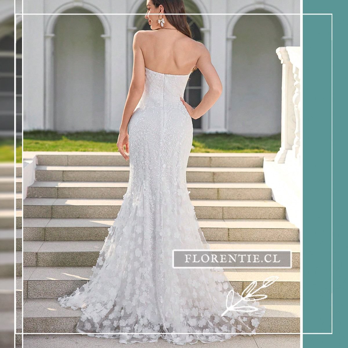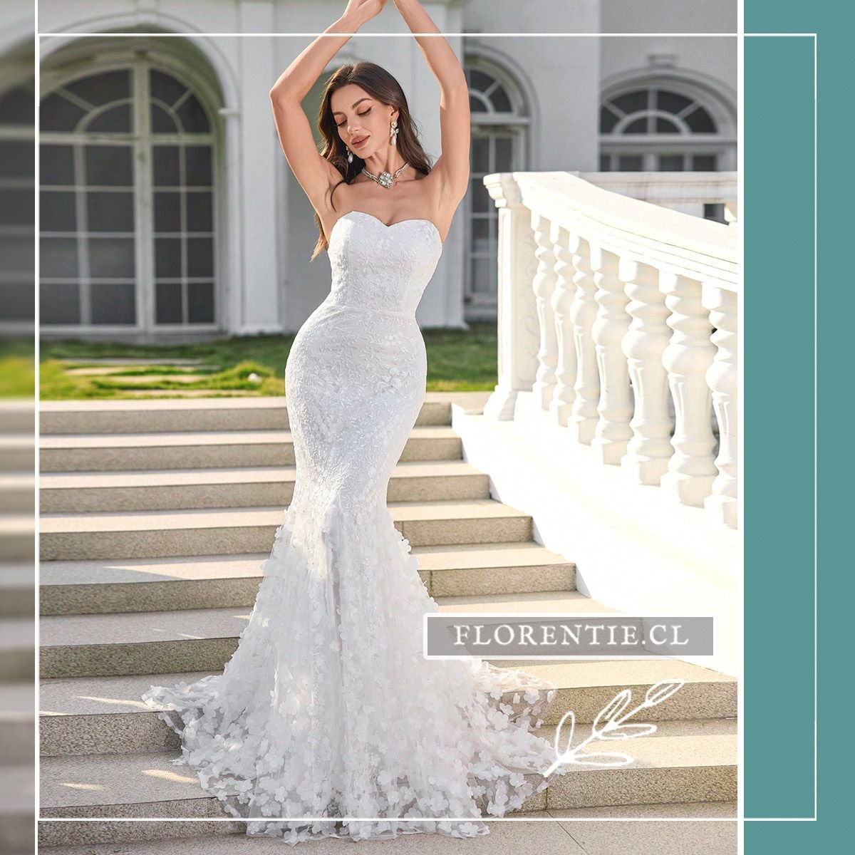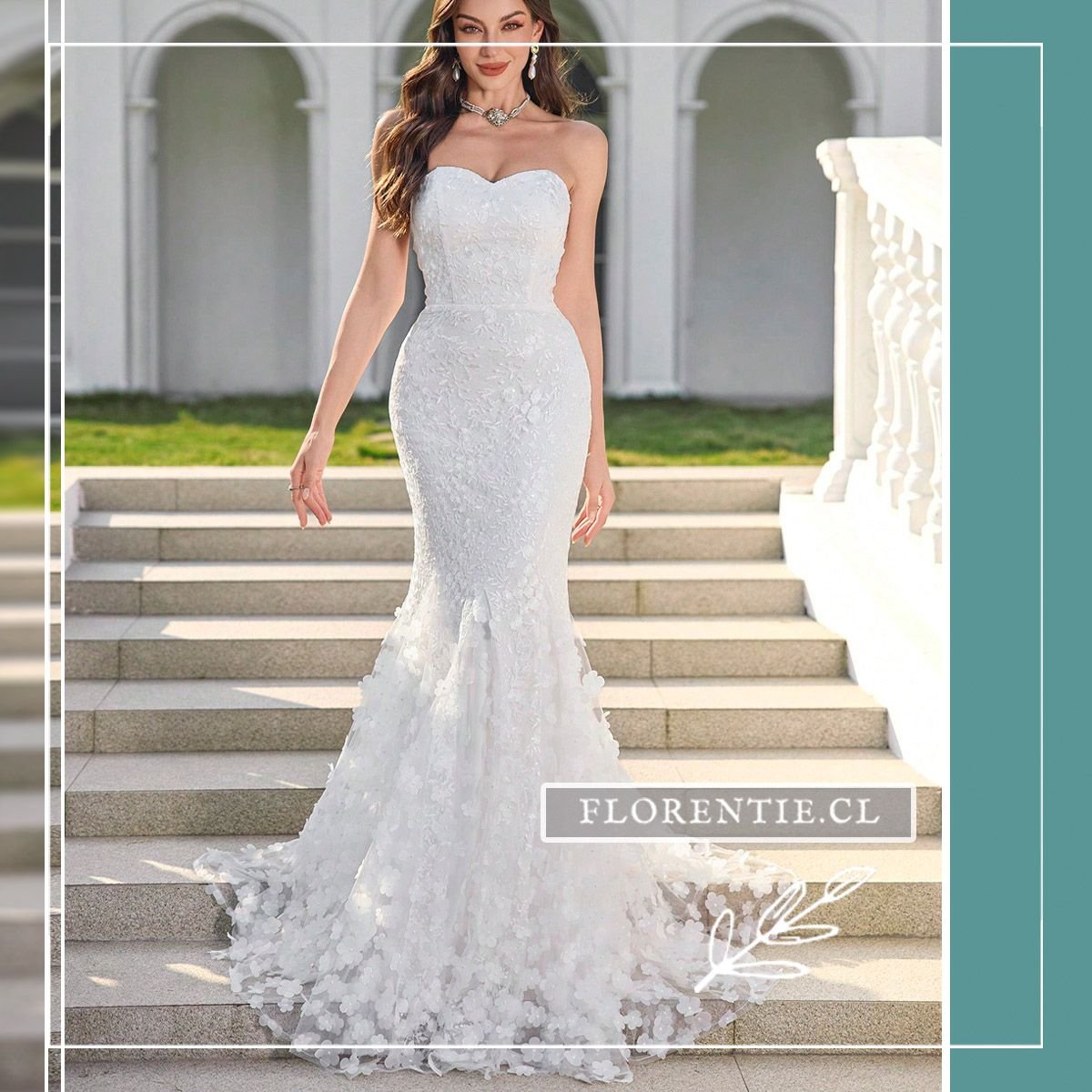 Vestido boda civil corte sirena: elegancia dramática y romanticismo para tu día nupcial más especial. Este vestido blanco de corte sirena combina un escote corazón strapless con un cuerpo de encaje floral. Su falda se despliega dramáticamente desde la rodilla, culminando en una cola tipo catedral adornada con aplicaciones tridimensionales de flores. Ideal para una boda civil o ceremonia íntima, este diseño ofrece un look clásico y glamoroso con un impacto visual inolvidable.