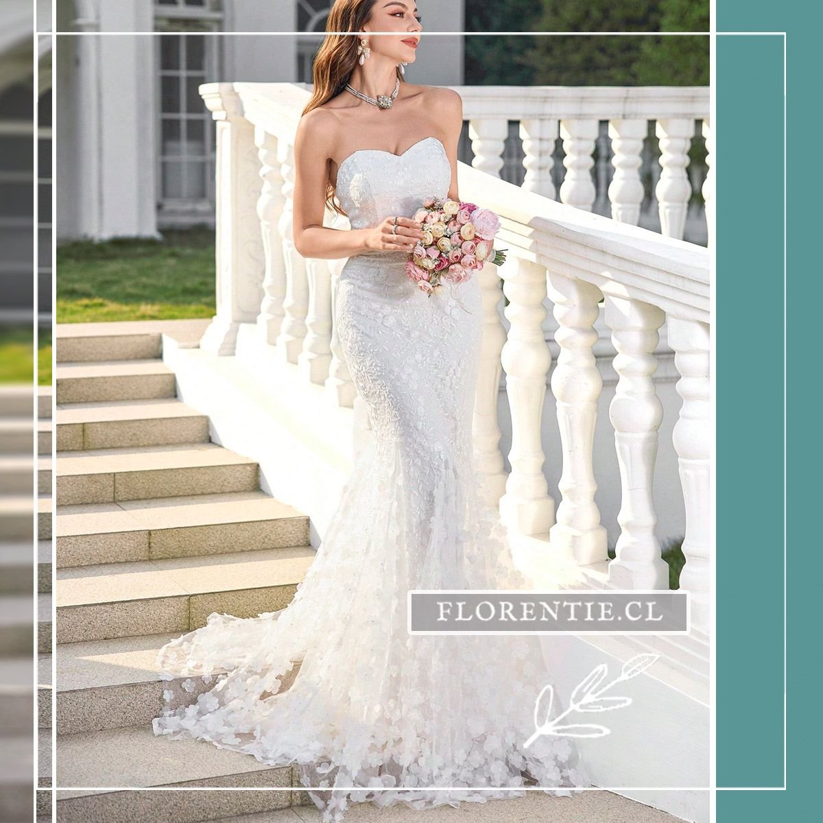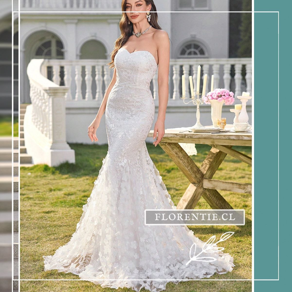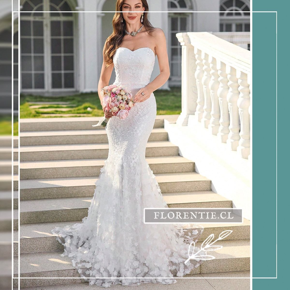 Vestido boda civil corte sirena: elegancia dramática y romanticismo para tu día nupcial más especial. Este vestido blanco de corte sirena combina un escote corazón strapless con un cuerpo de encaje floral. Su falda se despliega dramáticamente desde la rodilla, culminando en una cola tipo catedral adornada con aplicaciones tridimensionales de flores. Ideal para una boda civil o ceremonia íntima, este diseño ofrece un look clásico y glamoroso con un impacto visual inolvidable.