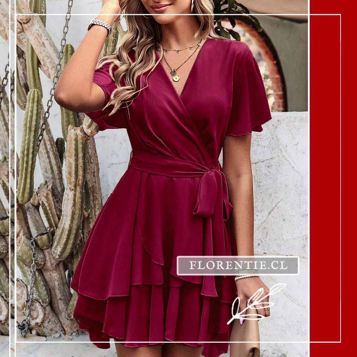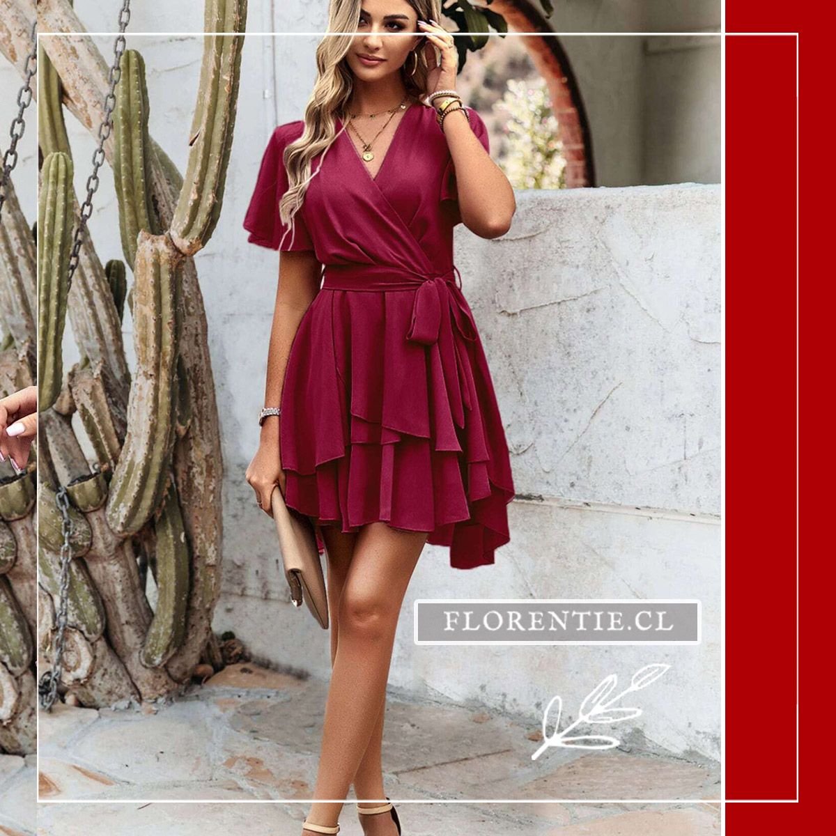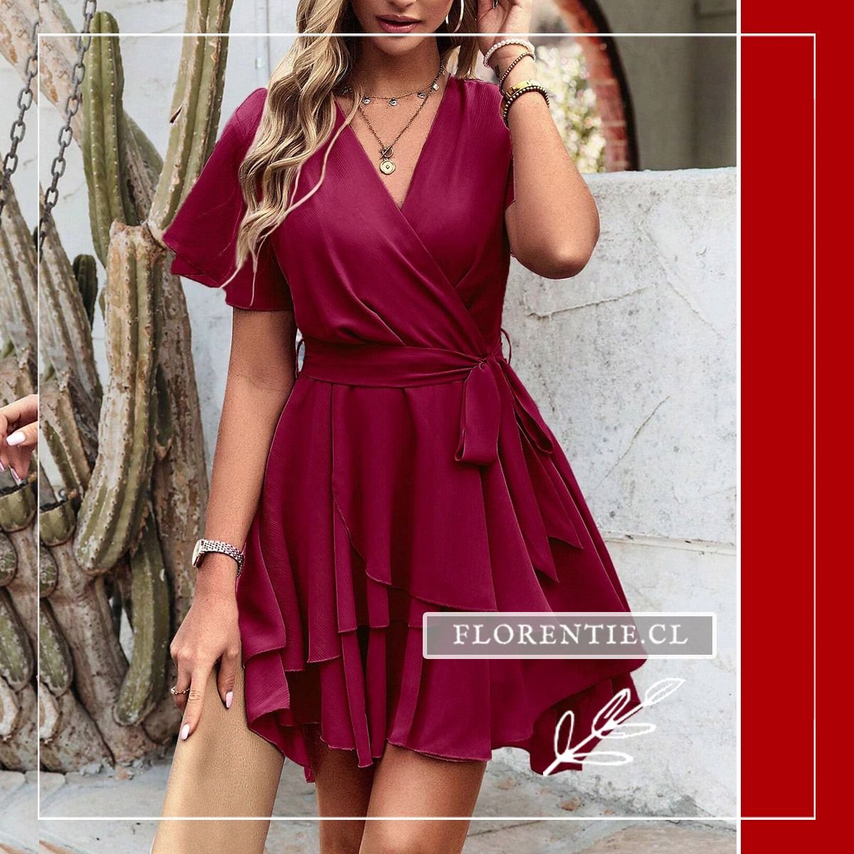 Vestido cena empresa verano: elegancia profesional con un toque femenino para eventos corporativos. Este vestido corto vino presenta un escote cruzado tipo wrap, mangas con volantes tipo mariposa y un cinturón lateral que define la silueta. Su falda de capas escalonadas con volantes asimétricos aporta movimiento y sofisticación. Confeccionado en tejido ligero de caída suave, es ideal para cenas de empresa, eventos corporativos o ocasiones semi-formales, ofreciendo un look pulcro y favorecedor.