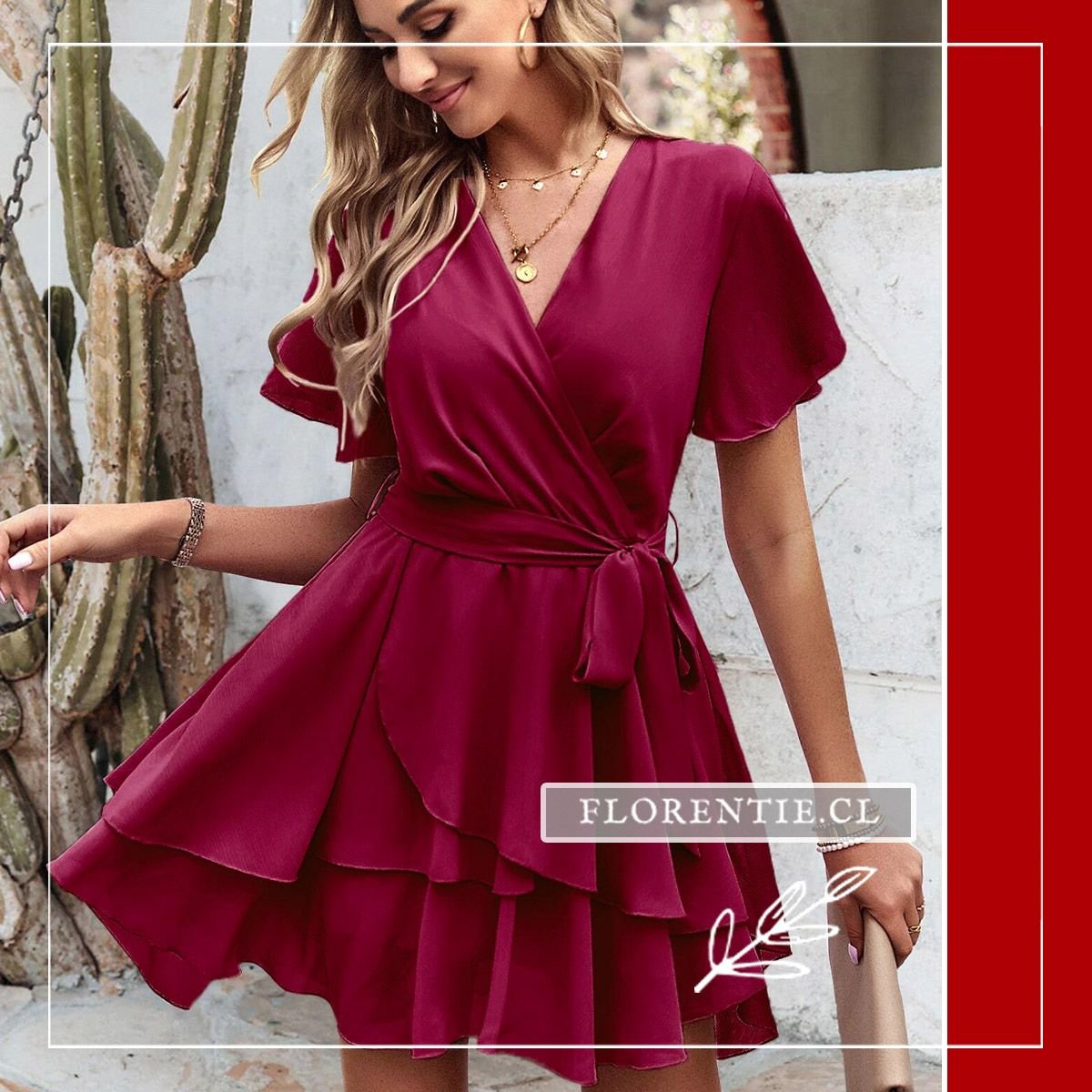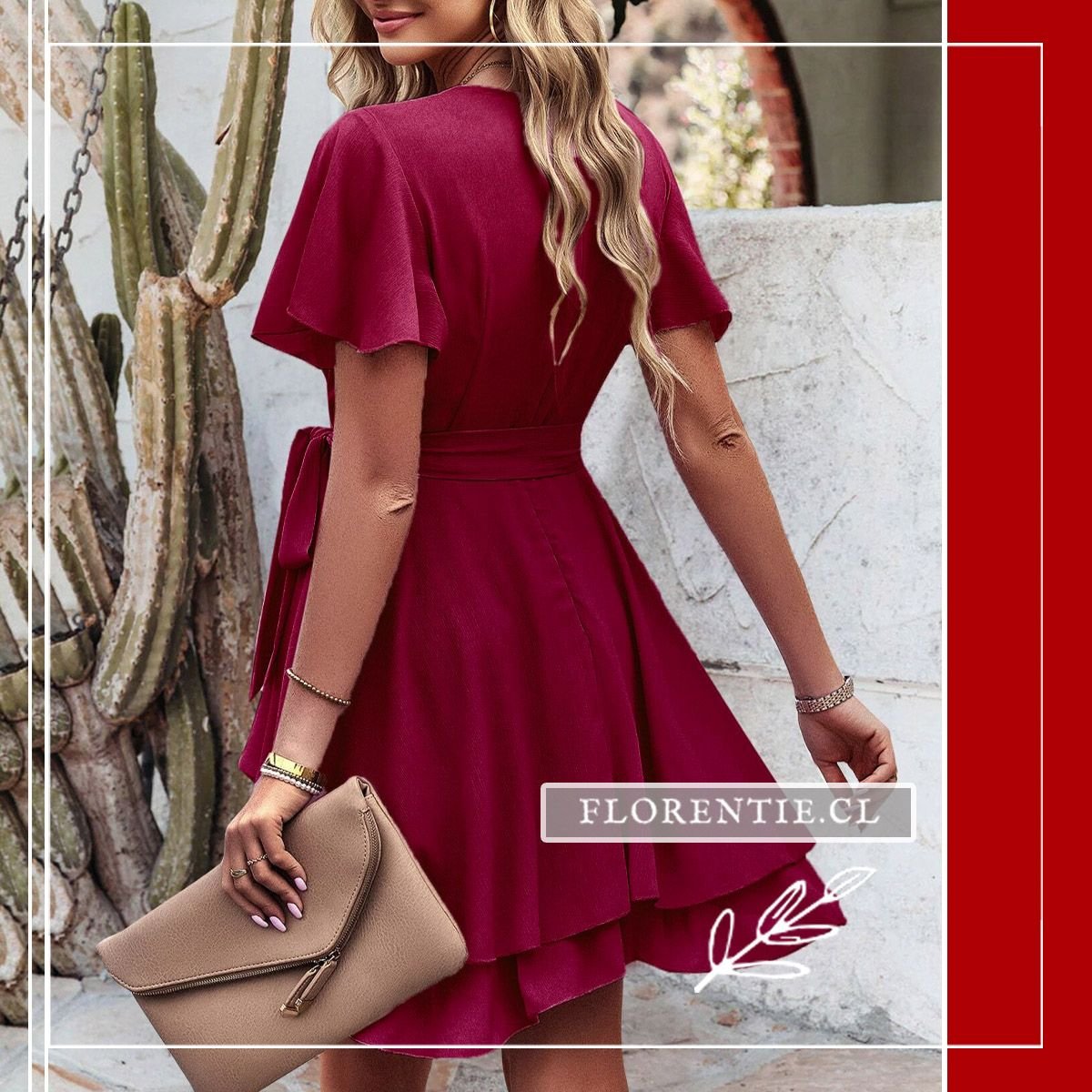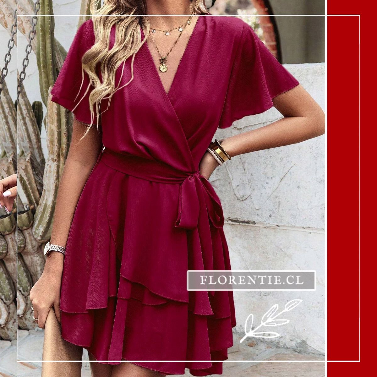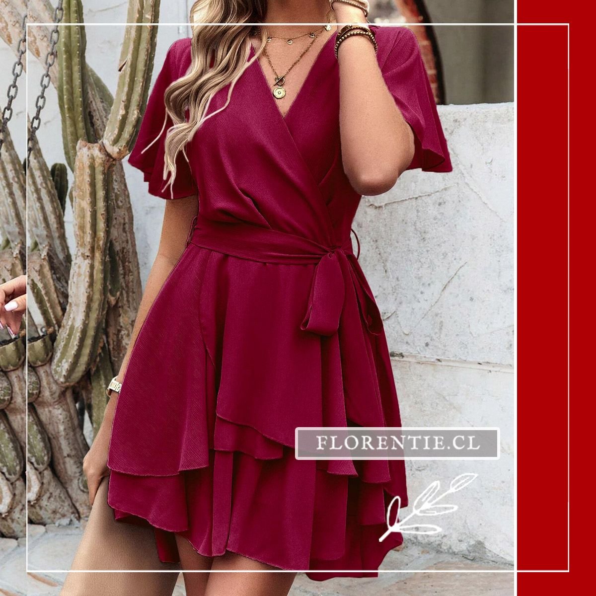 Vestido cena empresa verano: elegancia profesional con un toque femenino para eventos corporativos. Este vestido corto vino presenta un escote cruzado tipo wrap, mangas con volantes tipo mariposa y un cinturón lateral que define la silueta. Su falda de capas escalonadas con volantes asimétricos aporta movimiento y sofisticación. Confeccionado en tejido ligero de caída suave, es ideal para cenas de empresa, eventos corporativos o ocasiones semi-formales, ofreciendo un look pulcro y favorecedor.