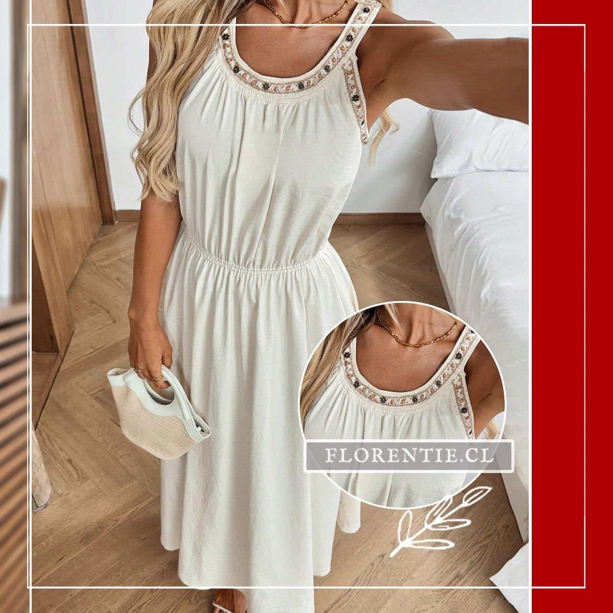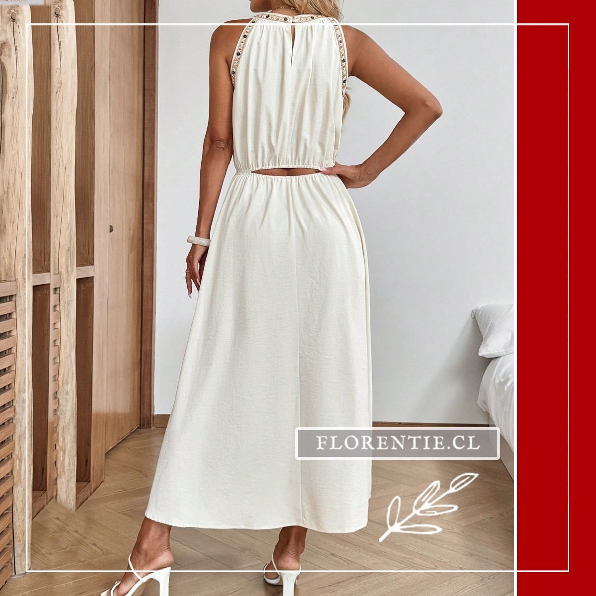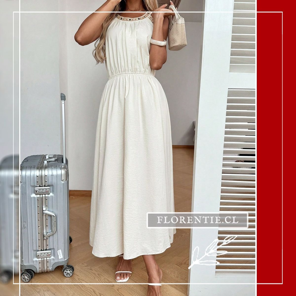 Vestido verano crudo: elegancia natural y sofisticación sutil para tus ocasiones especiales. Este vestido maxi beige presenta un escote redondo con tirantes halter adornados con pedrería y una cintura imperio elástica fruncida. Su espalda con abertura y falda fluida de largo completo ofrecen comodidad y un movimiento elegante. Confeccionado en tela ligera de aspecto natural, es ideal para eventos diurnos, bodas al aire libre o ocasiones casuales-elegantes, logrando un look refinado y fresco.
