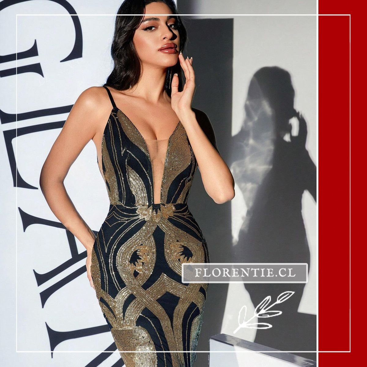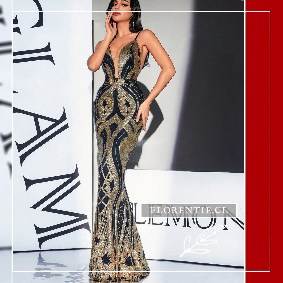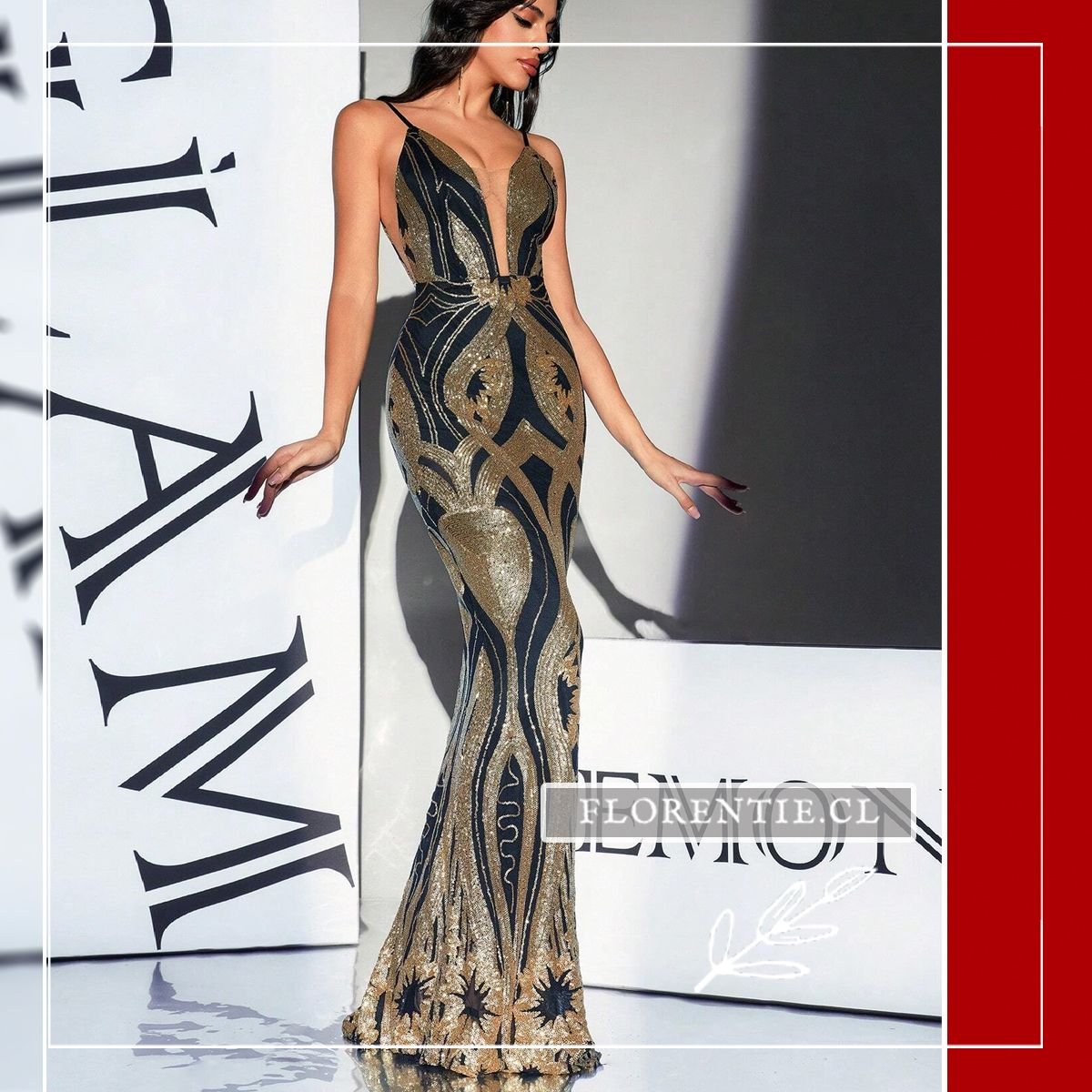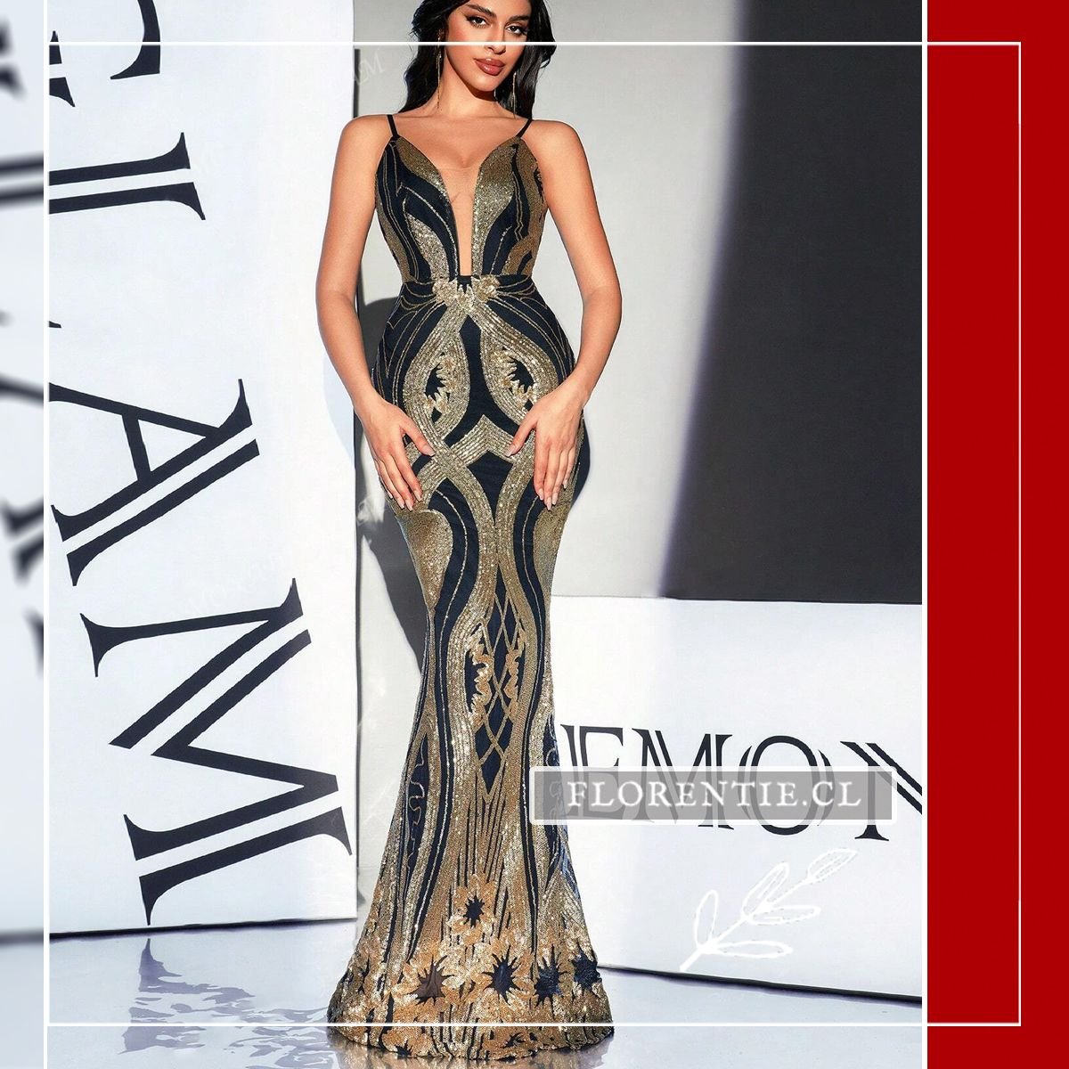 Este vestido luce un escote en V profundo hasta la cintura y espalda descubierta con tirantes delgados. El elaborado patrón art déco en lentejuelas doradas y negras fluye estratégicamente sobre el cuerpo, realzado por una cintura definida con elemento decorativo. Ideal para galas de premiación, alfombras rojas, cócteles de lujo, bodas elegantes o eventos formales nocturnos donde busques un look glamoroso e inolvidable. Un vestido que combina modernidad y arte en cada detalle para ocasiones excepcionales.