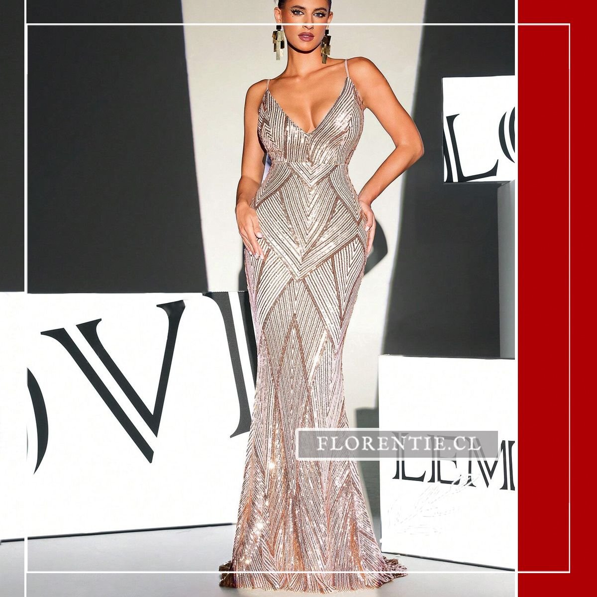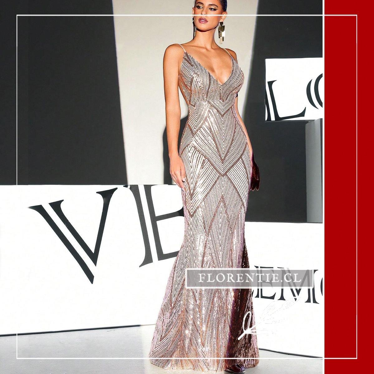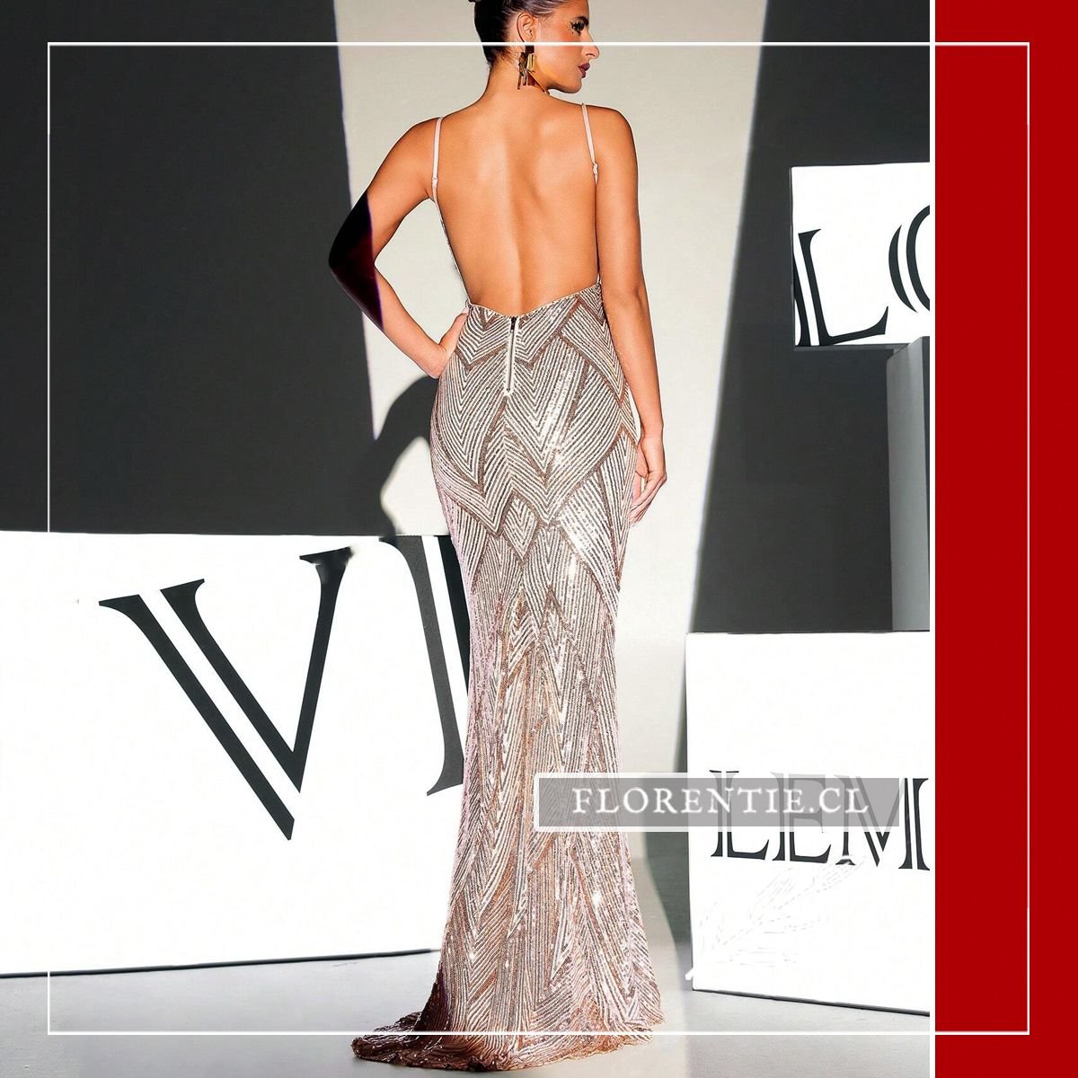 Este vestido largo presenta un escote en V profundo al frente y espalda completamente descubierta, unida por tirantes finos en la parte baja. Cubierto de lentejuelas en patrón de chevron que crean juegos de luz, su silueta ceñida realza la figura hasta el suelo con pequeña cola. Ideal para galas de premiación, alfombras rojas, bodas elegantes, cócteles de lujo o eventos formales nocturnos donde busques un equilibrio perfecto entre sensualidad y glamour contemporáneo. Una pieza transformadora para ocasiones excepcionales.