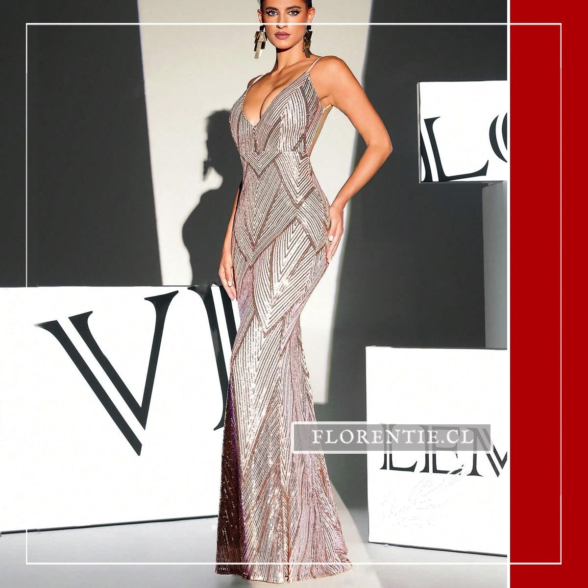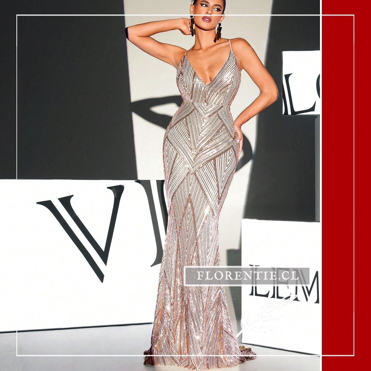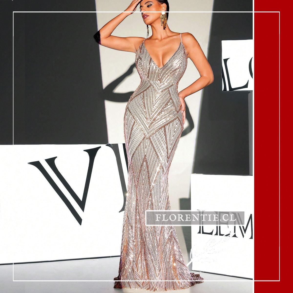 Este vestido largo presenta un escote en V profundo al frente y espalda completamente descubierta, unida por tirantes finos en la parte baja. Cubierto de lentejuelas en patrón de chevron que crean juegos de luz, su silueta ceñida realza la figura hasta el suelo con pequeña cola. Ideal para galas de premiación, alfombras rojas, bodas elegantes, cócteles de lujo o eventos formales nocturnos donde busques un equilibrio perfecto entre sensualidad y glamour contemporáneo. Una pieza transformadora para ocasiones excepcionales.