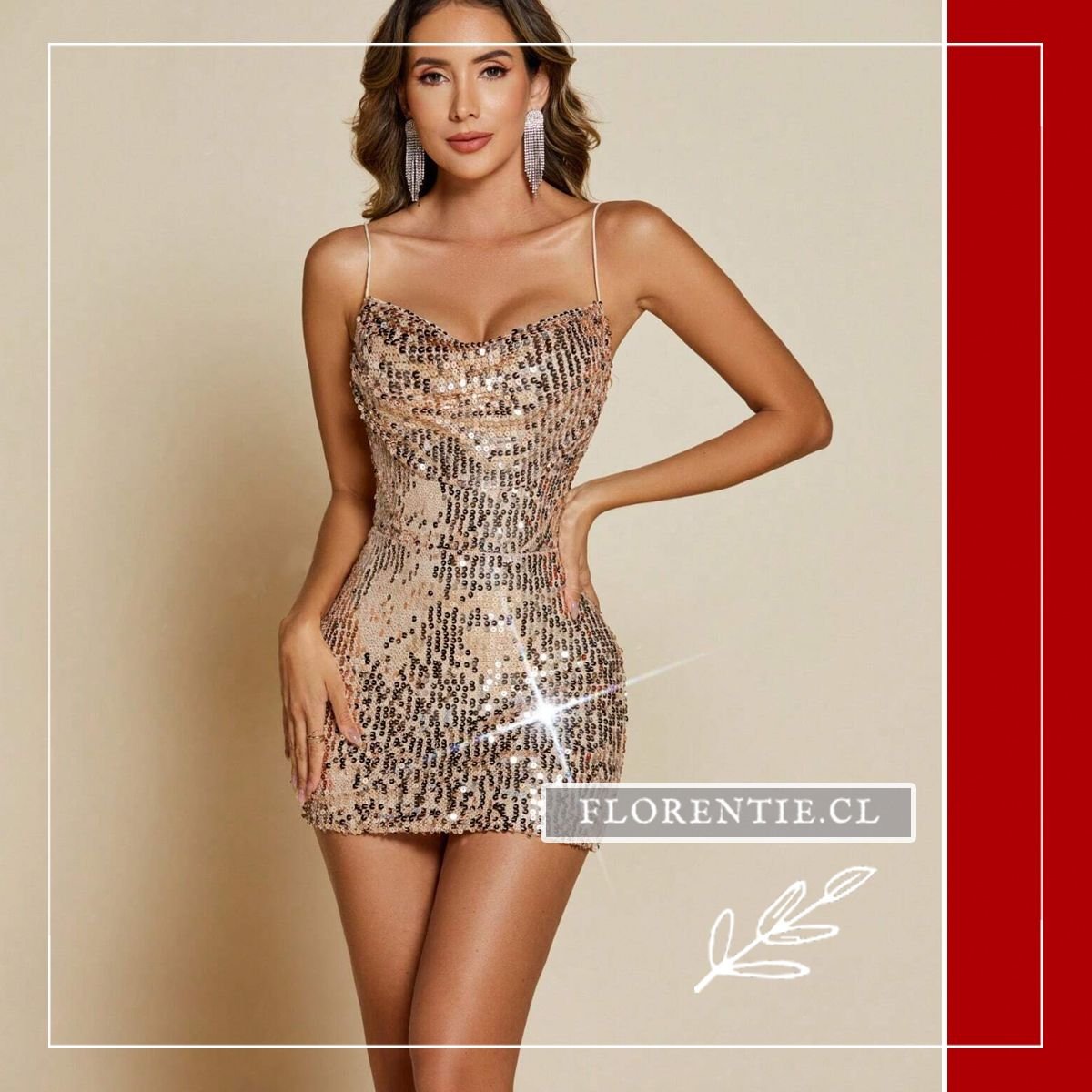 Este vestido presenta un escote corazón con tirantes delgados ajustables y espalda cruzada descubierta. Cubierto completamente de lentejuelas en tonos dorados con patrón de ondas, su corte ceñido realza la silueta hasta el largo mini. Ideal para fiestas nocturnas, celebraciones de Año Nuevo, eventos en discotecas, cócteles elegantes u ocasiones especiales donde busques un equilibrio perfecto entre sensualidad y glamour contemporáneo. Una pieza que garantiza luminosidad y confianza en cada movimiento.