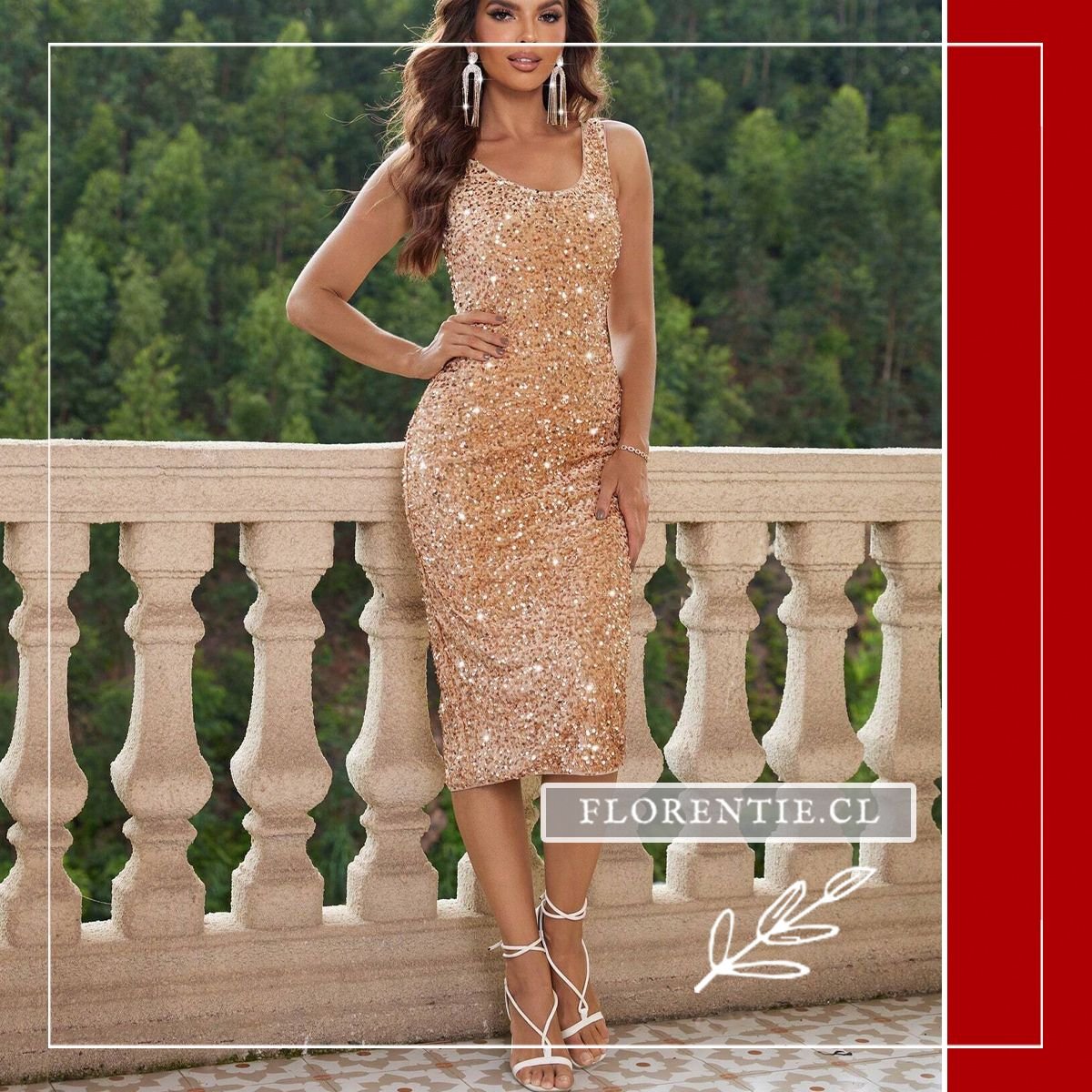 Este vestido champagne presenta un escote redondo con tirantes anchos y una abertura trasera que añade movimiento. Completamente cubierto de lentejuelas en tonos dorados, crea un efecto luminoso que realza tu silueta de manera favorecedora. Ideal para cócteles elegantes, eventos formales, bodas o celebraciones nocturnas donde busques un equilibrio perfecto entre glamour contemporáneo y practicidad. Una pieza que se adapta a múltiples eventos con distinción y confianza.