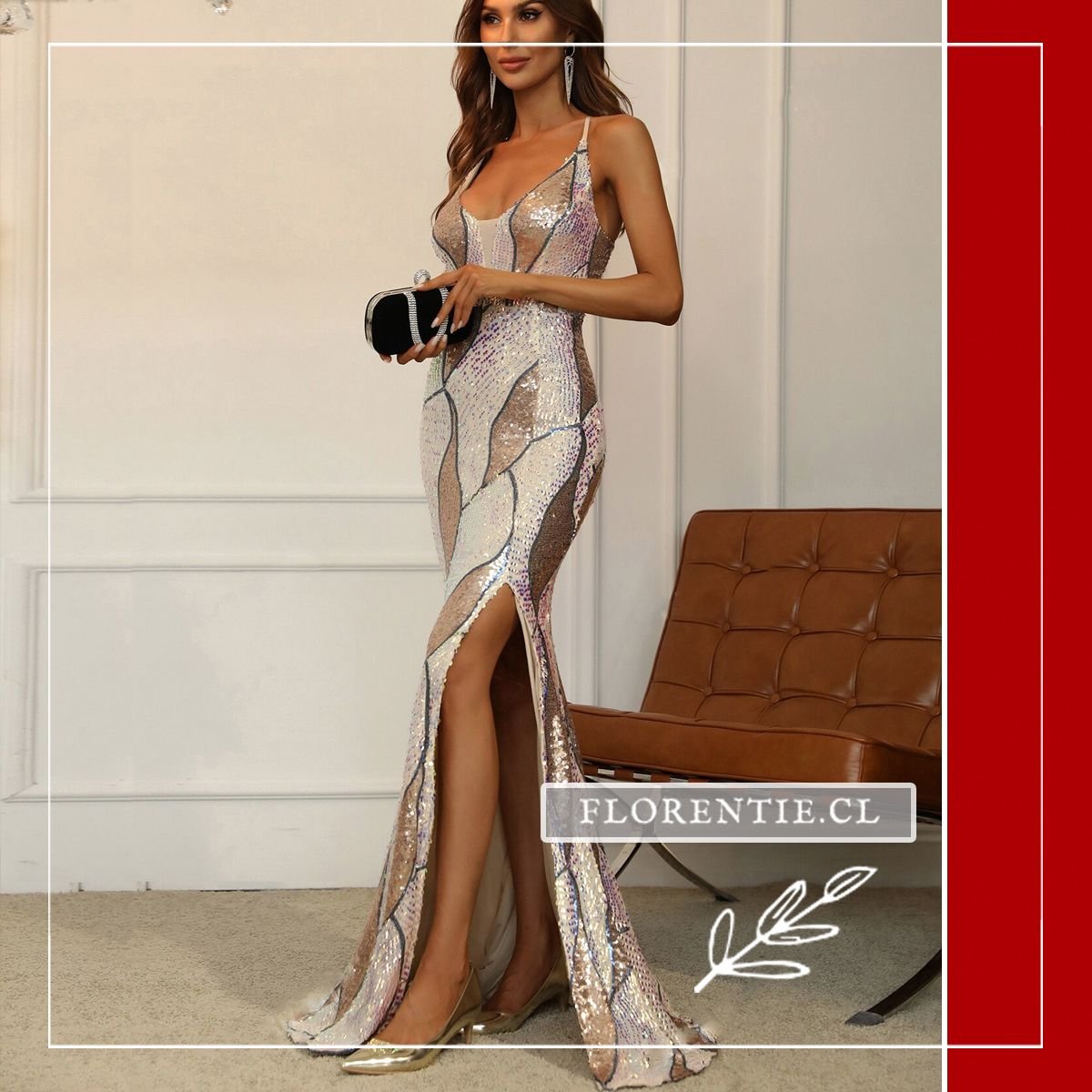 Este vestido largo presenta un escote en V profundo con tirantes finos y espalda descubierta con tirantes cruzados. La abertura lateral alta y la cola larga añaden movimiento y dramatismo. Cubierto de lentejuelas y cristales en patrón de mosaico con tonos champagne, rosado y malva, crea un efecto vitral luminoso. Ideal para galas de premiación, alfombras rojas, bodas elegantes o eventos de alta formalidad donde busques un equilibrio perfecto entre audacia y sofisticación contemporánea.