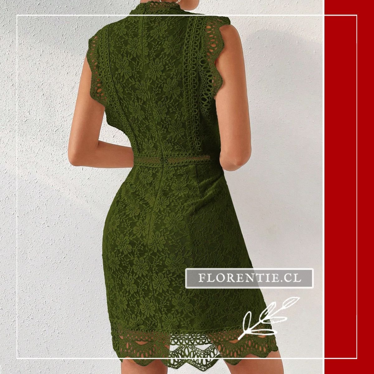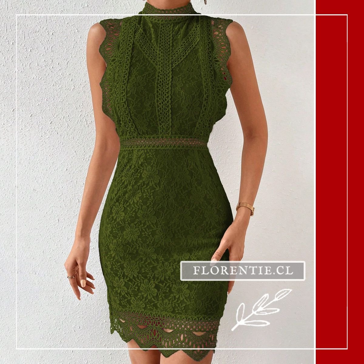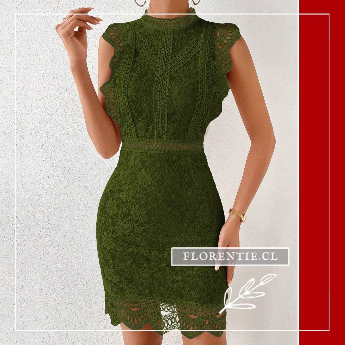 Vestido fiesta encaje corto. Este modelo en color verde oliva luce un cuello alto y una silueta ajustada tipo bodycon completamente confeccionada en encaje floral. Sus detalles calados en el torso, la cintura marcada y el borde inferior con festones le otorgan un aire sofisticado y femenino. Es ideal para eventos donde la elegancia es clave, como cócteles, cenas formales, ceremonias de tarde o recepciones. Su diseño forrado combina el encaje delicado con una figura moderna, asegurando una presencia destacada y llena de estilo en cualquier ocasión especial.