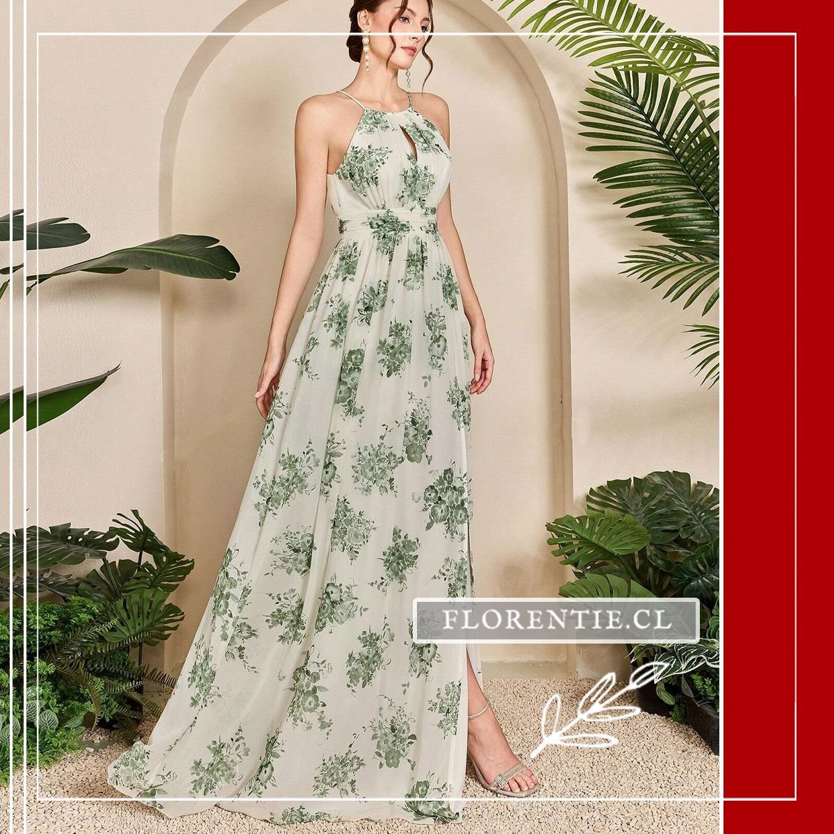 Su diseño halter con apertura keyhole y fruncido en el busto aporta un toque sofisticado. La cintura se marca con una banda a juego, mientras la falda fluida con abertura lateral ofrece comodidad y movimiento. Con su estampado floral sobre base clara, es perfecto para bodas campestres, cócteles de verano, graduaciones o celebraciones especiales donde busques un estilo romántico y distinguido.
