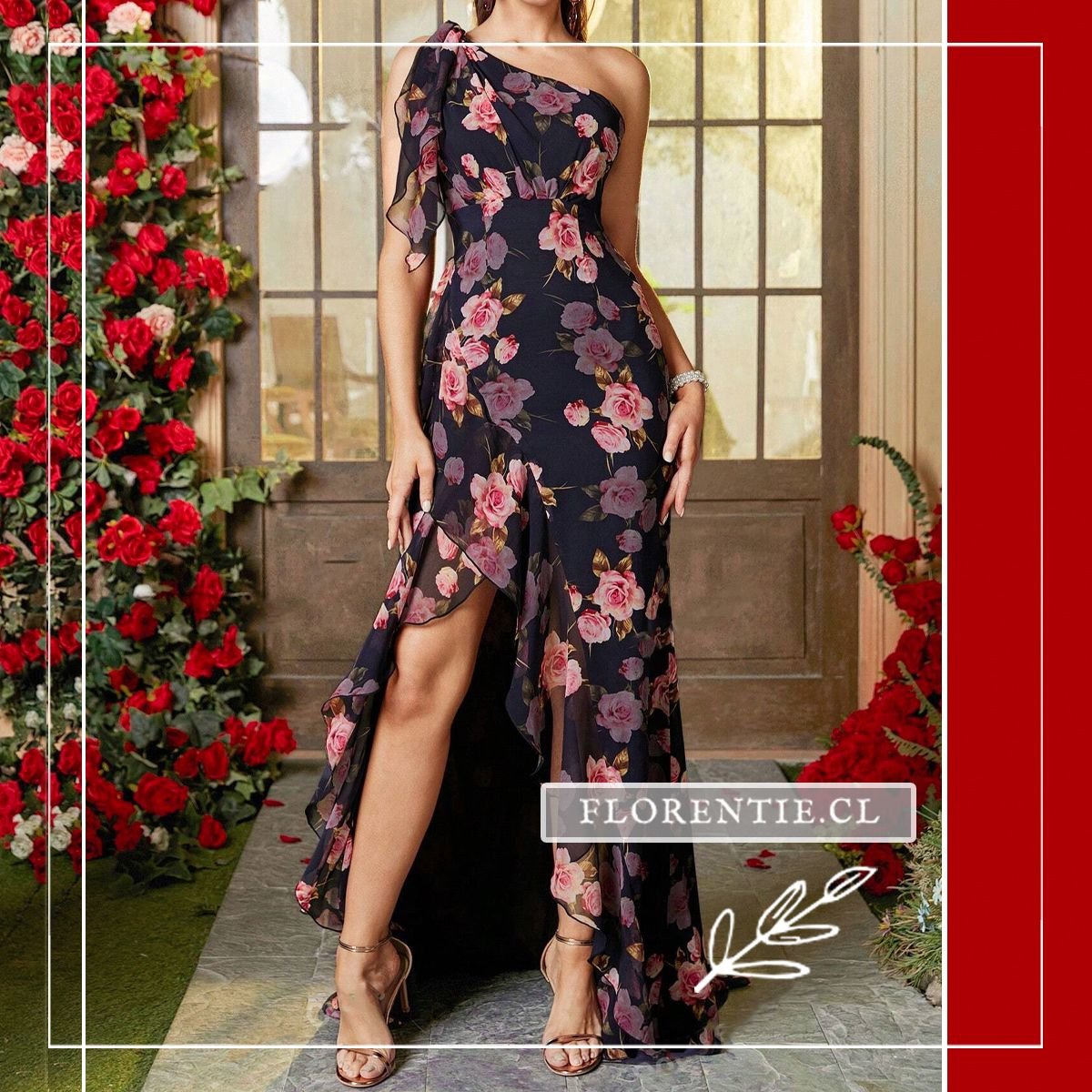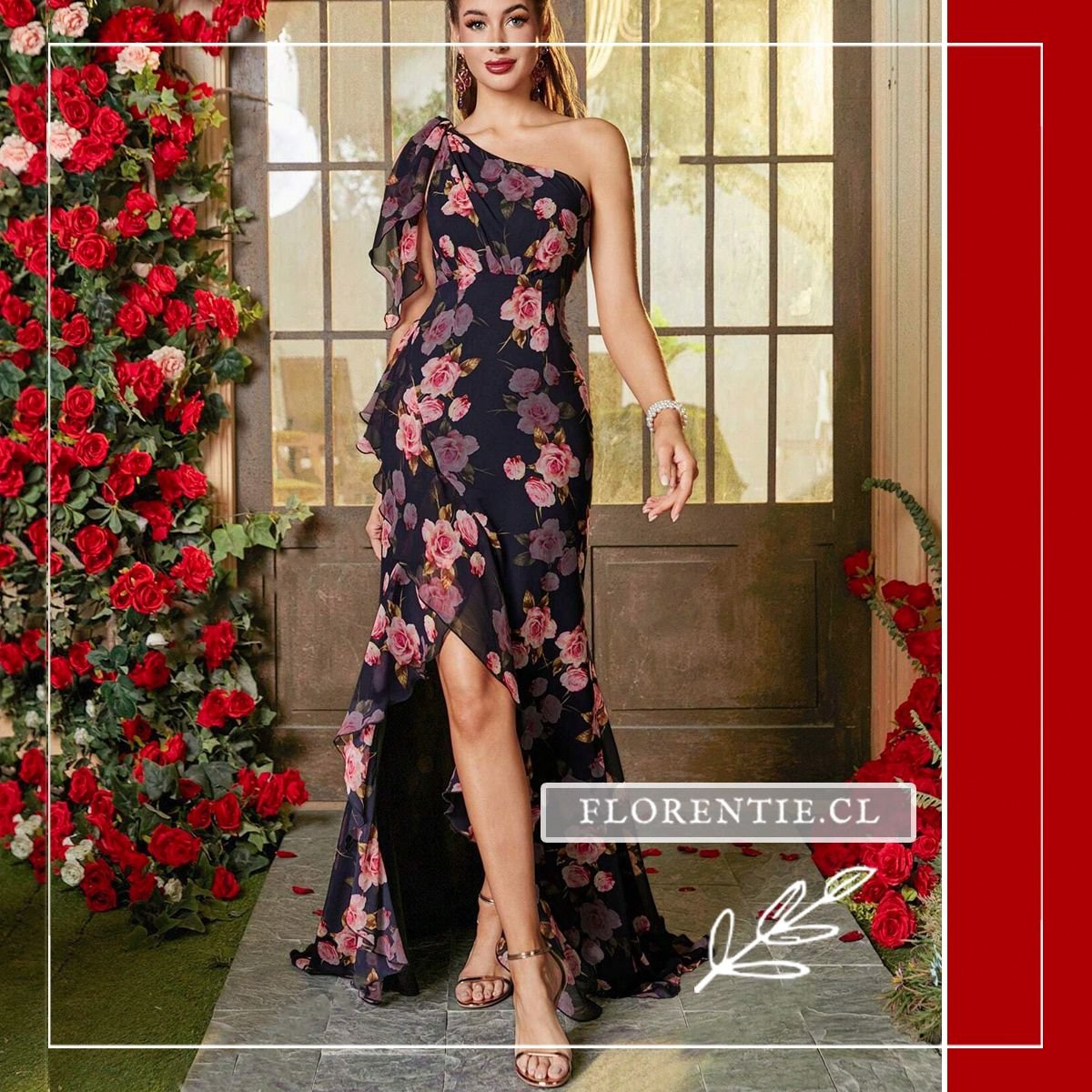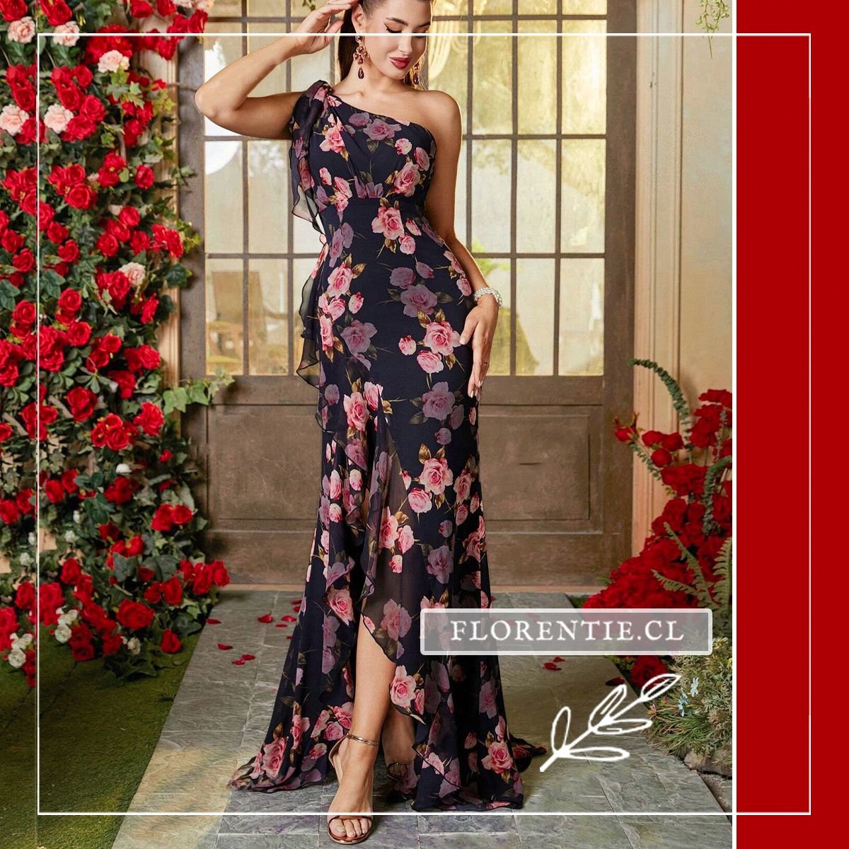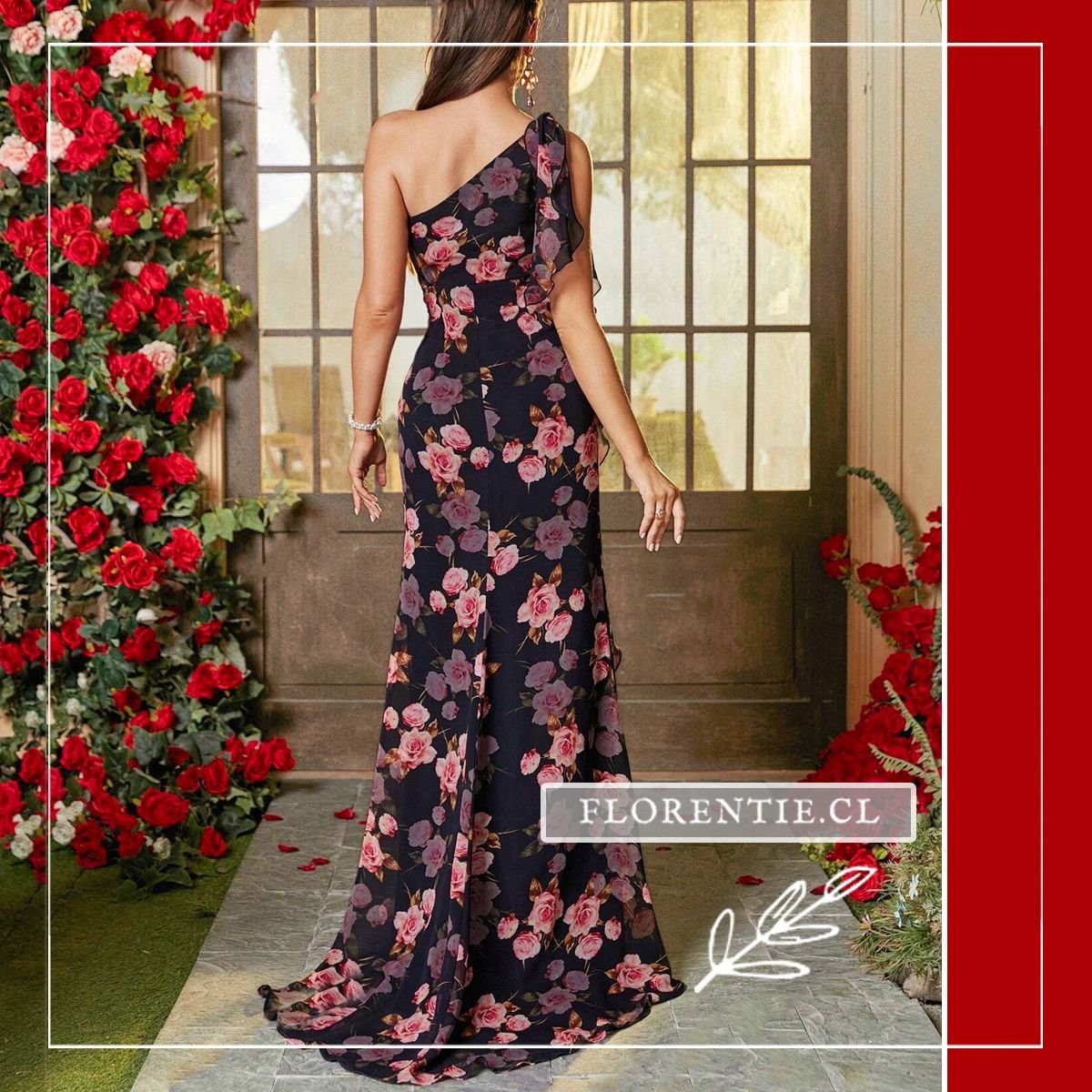 Su corte asimétrico de un solo hombro con manga drapeada crea una silueta única y favorecedora. La falda con abertura pronunciada y cola trasera aporta movimiento y un toque dramático. Confeccionado en gasa estampada con rosas y detalles dorados sobre negro, es ideal para galas, premiaciones, bodas de noche o cualquier celebración que requiera un look inolvidable y lleno de personalidad.