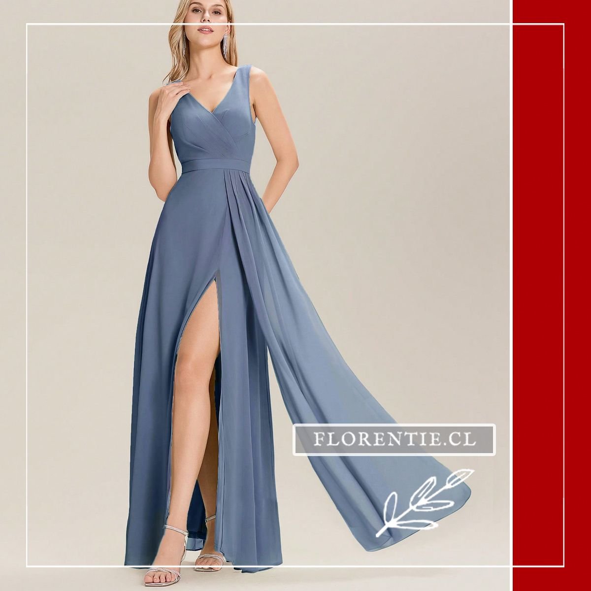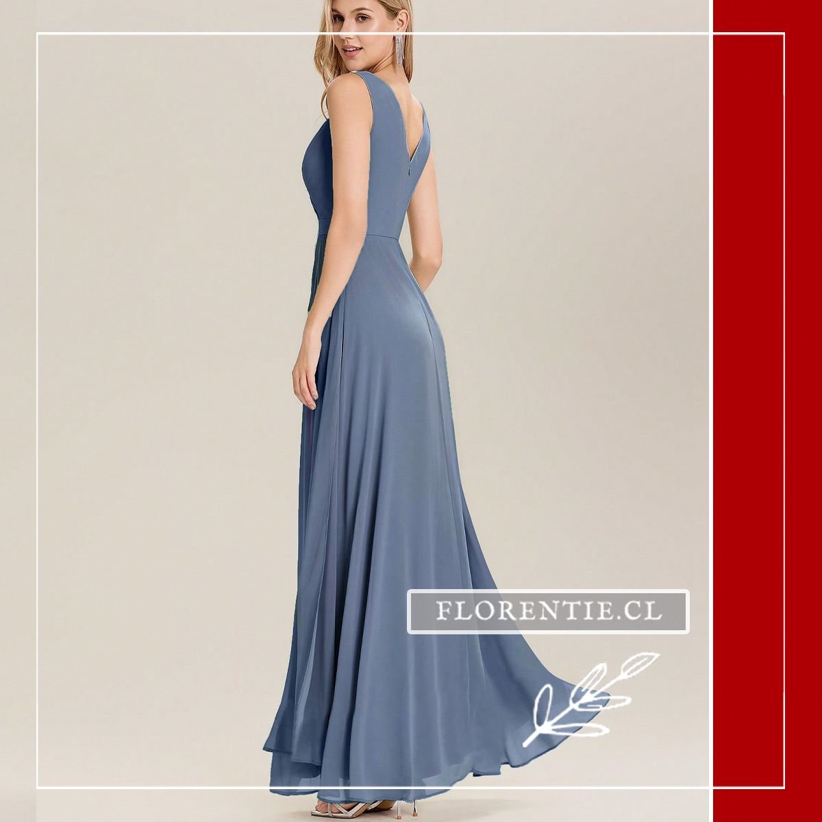La estructura del vestido se completa con una cintura definida por una banda drapeada que estiliza la figura. La falda cae con fluidez en línea A e incorpora una abertura lateral (tajo) sugerente que aporta movimiento y frescura al caminar. El diseño de la espalda es en V moderada con cierre invisible, manteniendo la limpieza visual del modelo en todos sus ángulos.