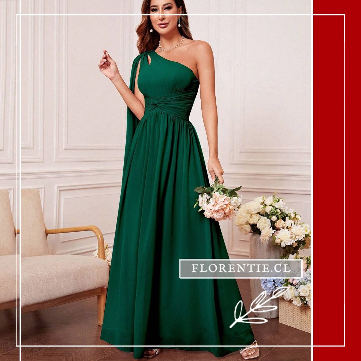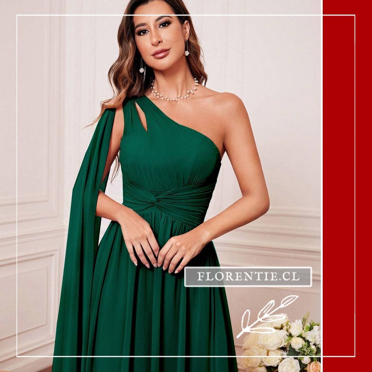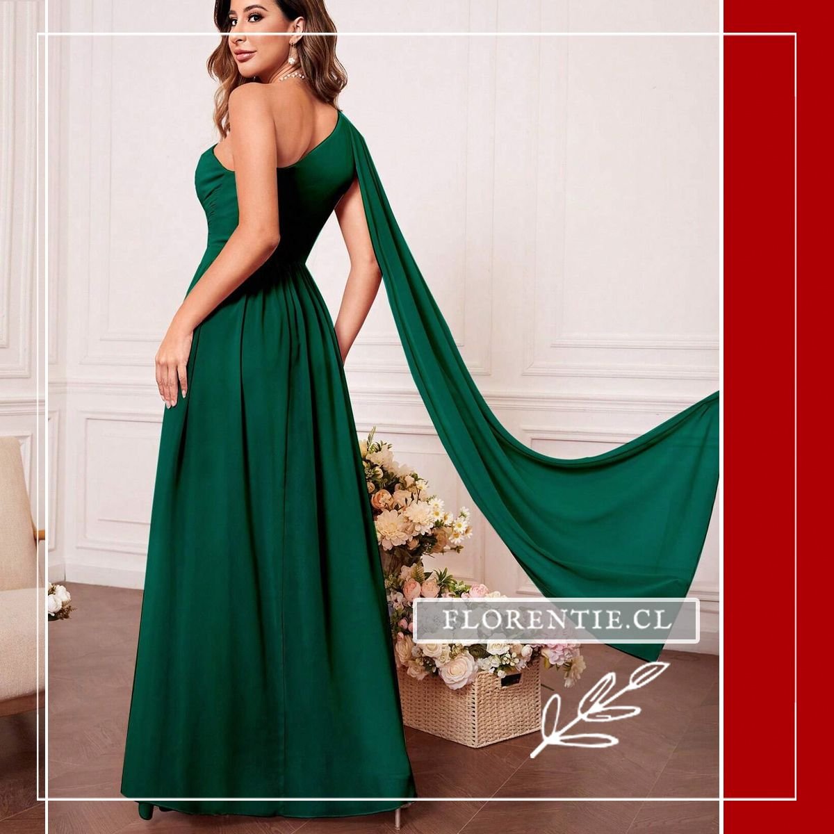 Este diseño evoca una majestuosidad digna de una diosa griega moderna, fusionando el drama con la sofisticación. Confeccionado en gasa (chiffon) de caída fluida, presenta una silueta asimétrica de un solo hombro que proyecta una imagen estatuaria y estilizada. Es un modelo pensado para quienes buscan destacar no por el brillo, sino por la arquitectura y el movimiento de la prenda.