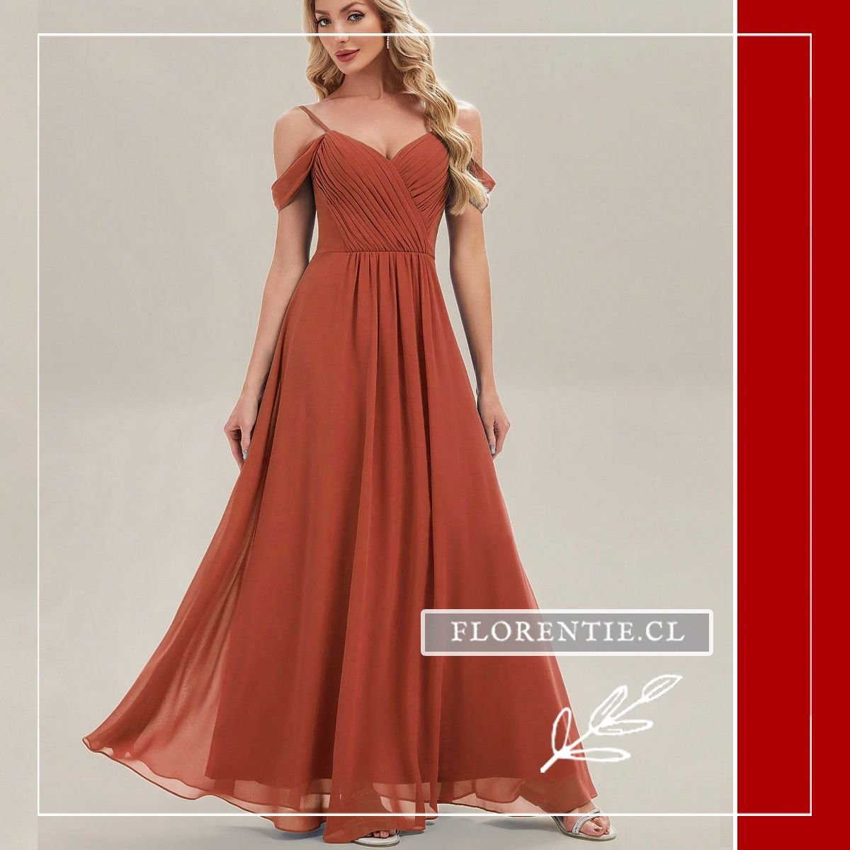 Este diseño captura la calidez y el romanticismo moderno en dos tonalidades inspiradas en la naturaleza. Confeccionado en capas de gasa ligera, presenta una silueta etérea que destaca por su estructura de hombros descubiertos (cold shoulder): finos tirantes que sostienen el escote corazón combinados con mangas caídas drapeadas que enmarcan suavemente los brazos.