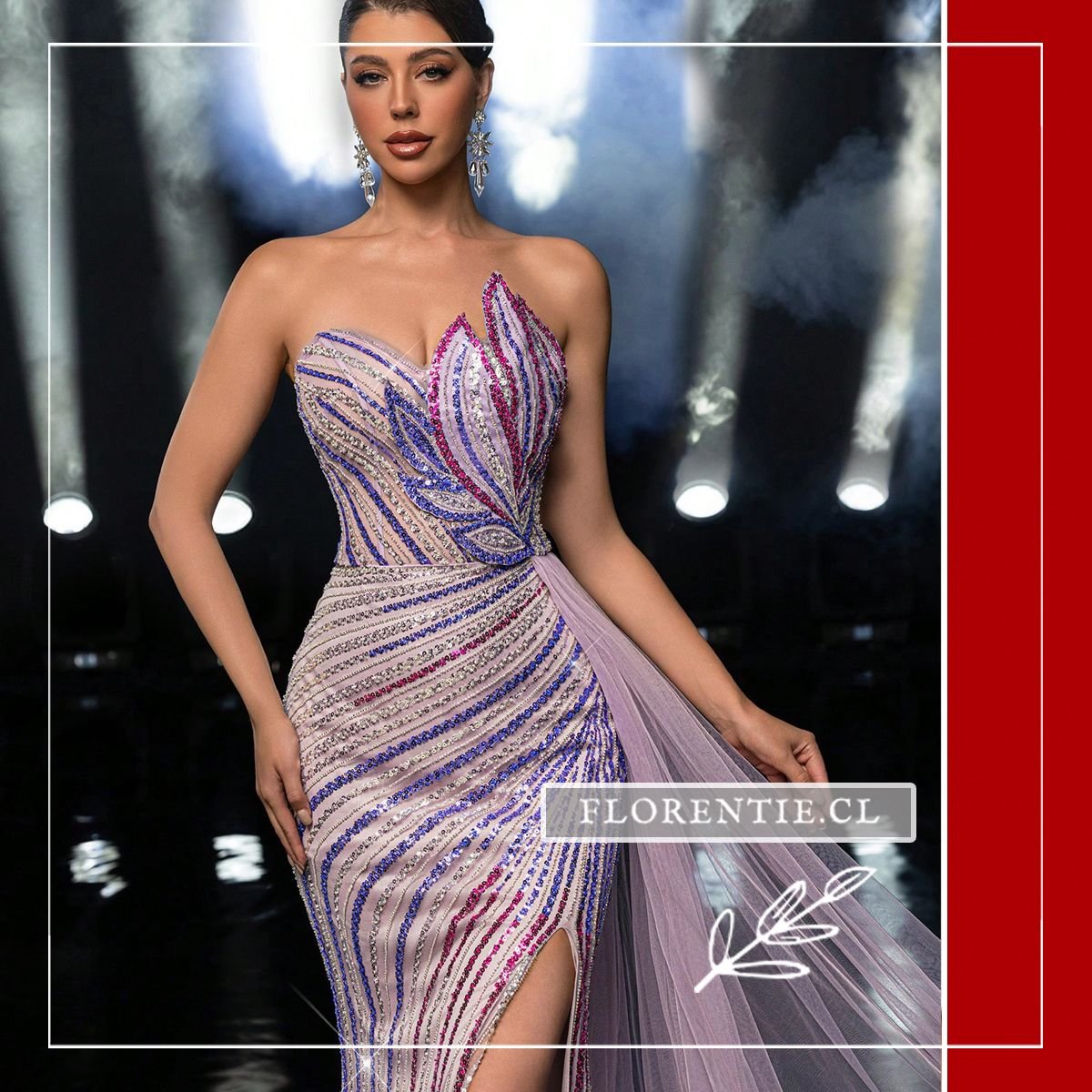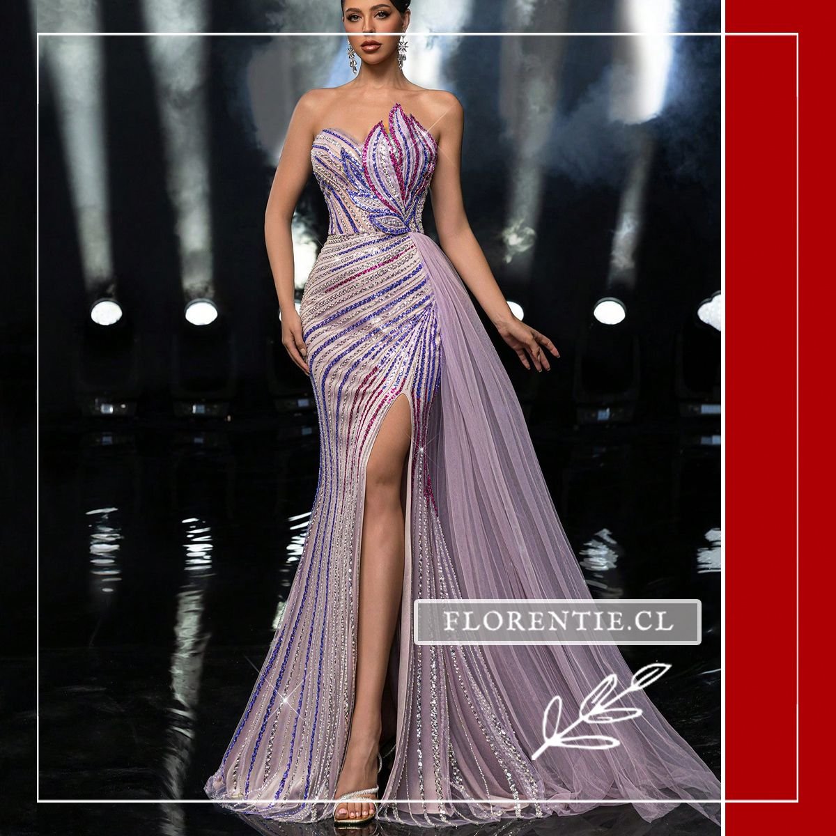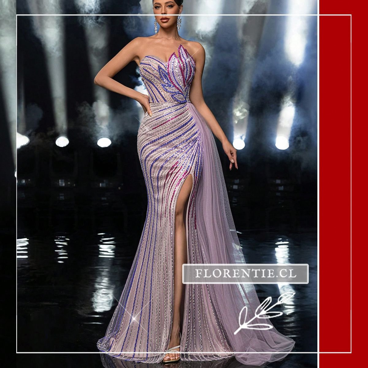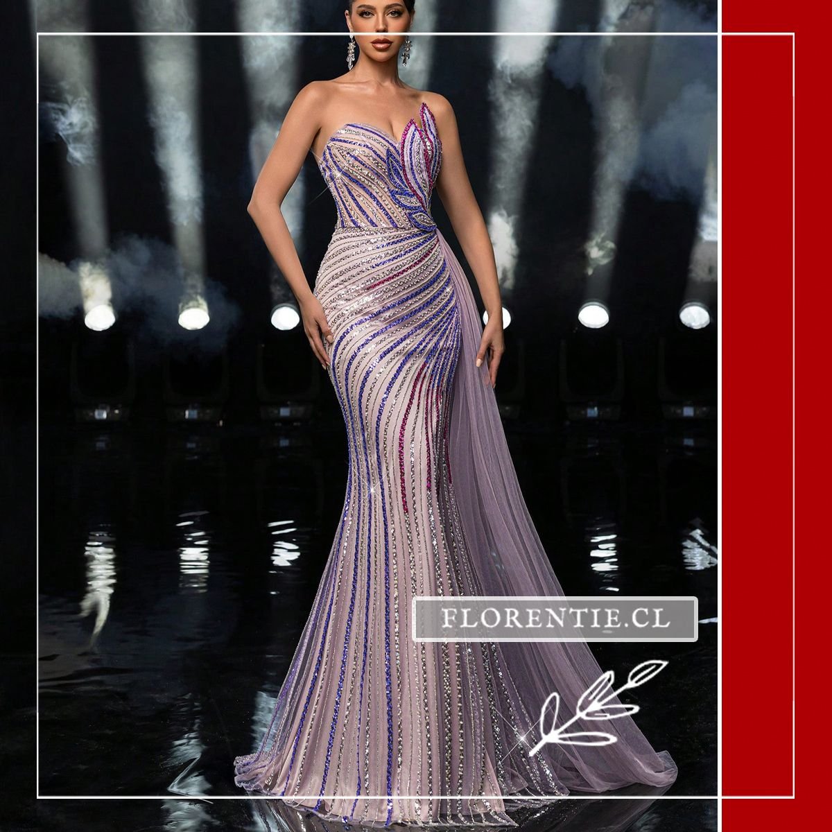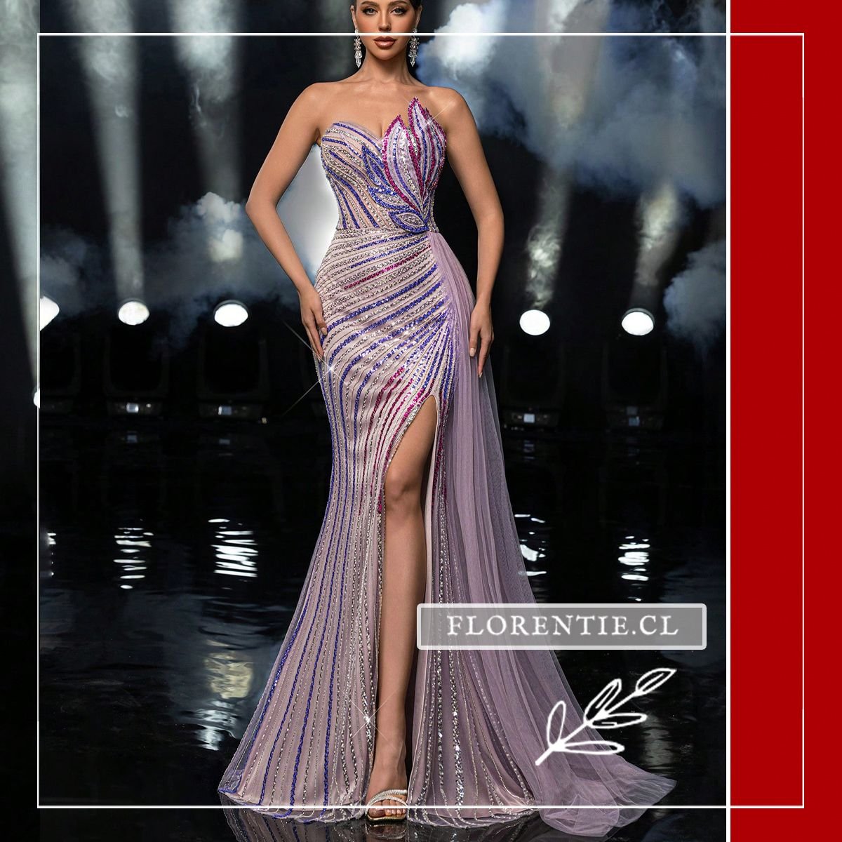 Vestido graduación con cola: una pieza única para un impacto visual inmediato en tu evento más especial. Este vestido de alta costura tiene un corte sirena que se abre en una cola dramática. Su diseño strapless con escote corazón asimétrico y una abertura lateral alta aporta una silueta audaz. Cubierto completamente con pedrería en un patrón de rayas ondulantes, combina tonos como plateado, azul royal y rosa fucsia sobre una base nude. La espectacular cola de tul lila añade volumen y movimiento. Ideal para graduaciones, galas benéficas, eventos de alfombra roja o certámenes donde busques una presencia inolvidable.