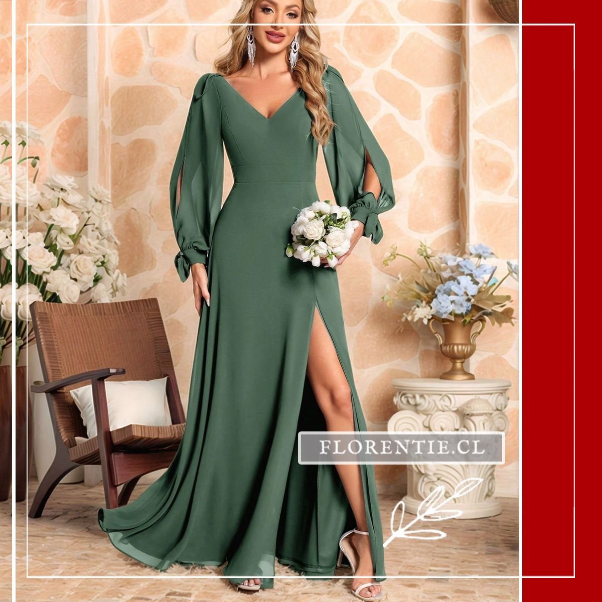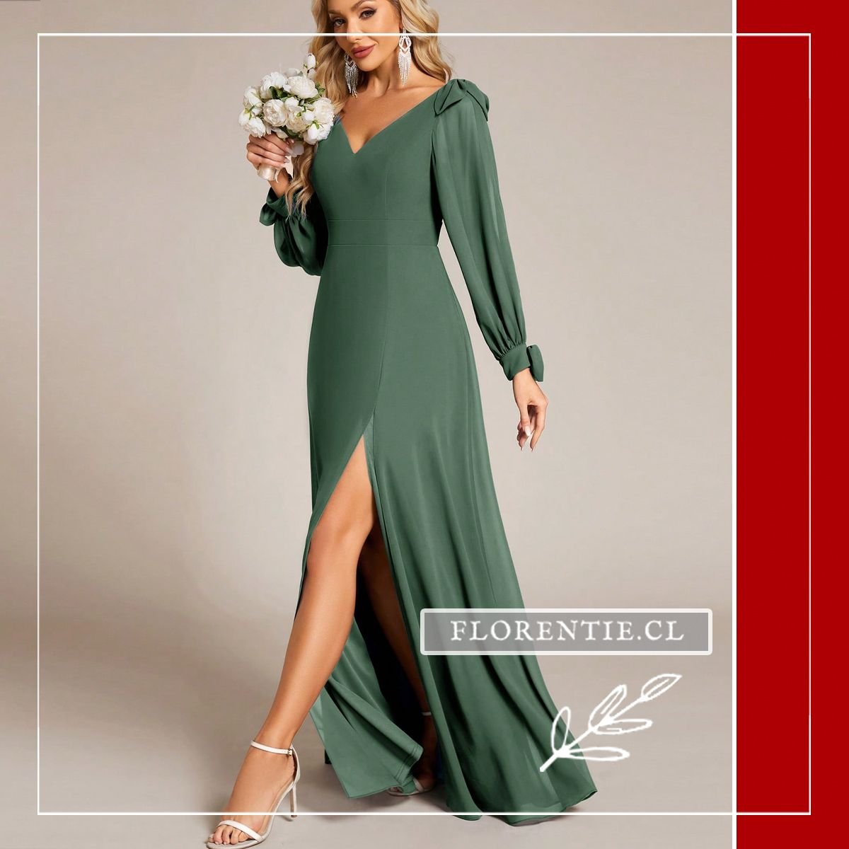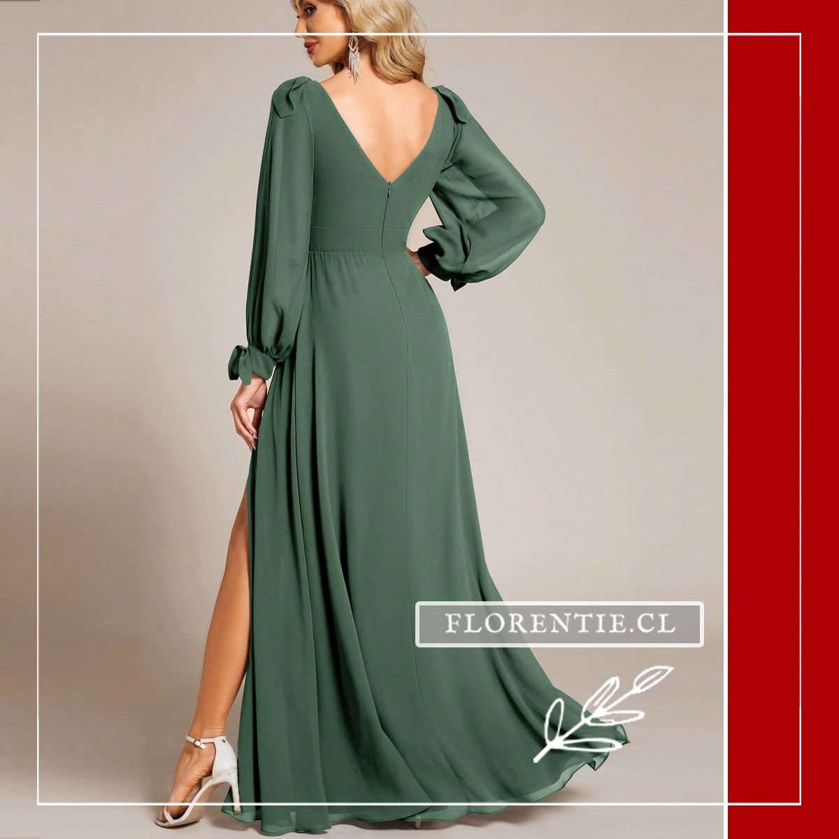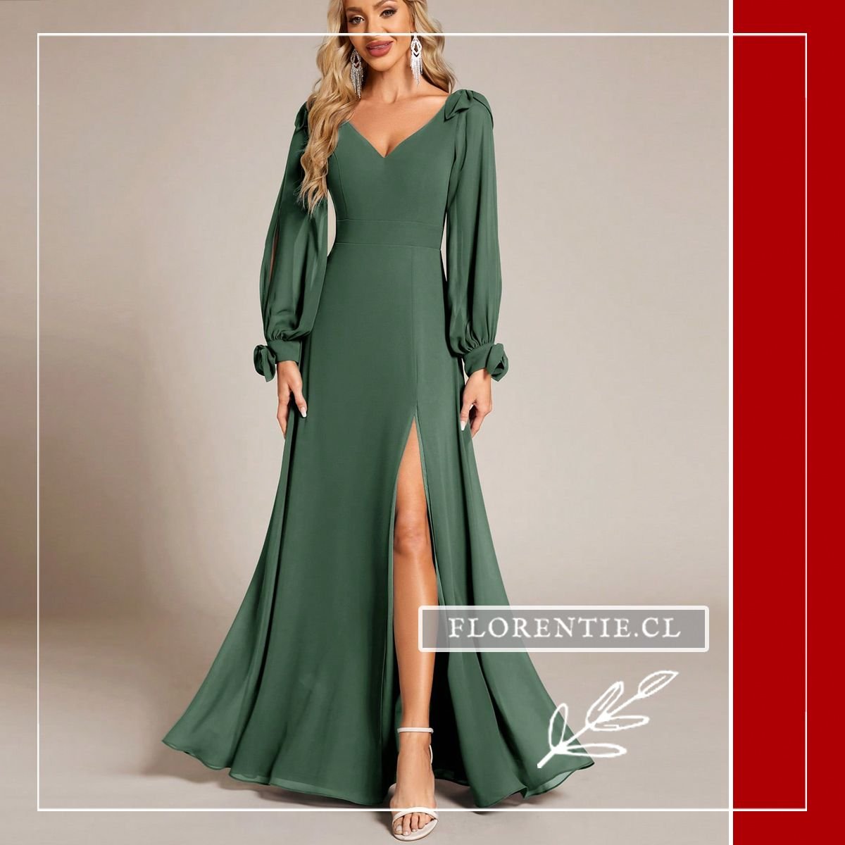 Vestido graduación con mangas: combina elegancia formal y un diseño único con gran comodidad para tu evento. Este vestido largo en verde esmeralda, con su corte A y escote en V, ofrece una silueta sofisticada. Sus distintivas mangas largas tipo globo, en tejido con abertura y lazo, aportan un toque de drama y estilo. La falda fluida con abertura lateral añade movimiento y modernidad. Confeccionado en telas que priorizan el confort, es ideal para graduaciones, bodas formales, cenas de gala o cualquier ceremonia donde busques un look elegante y a la vez vanguardista.