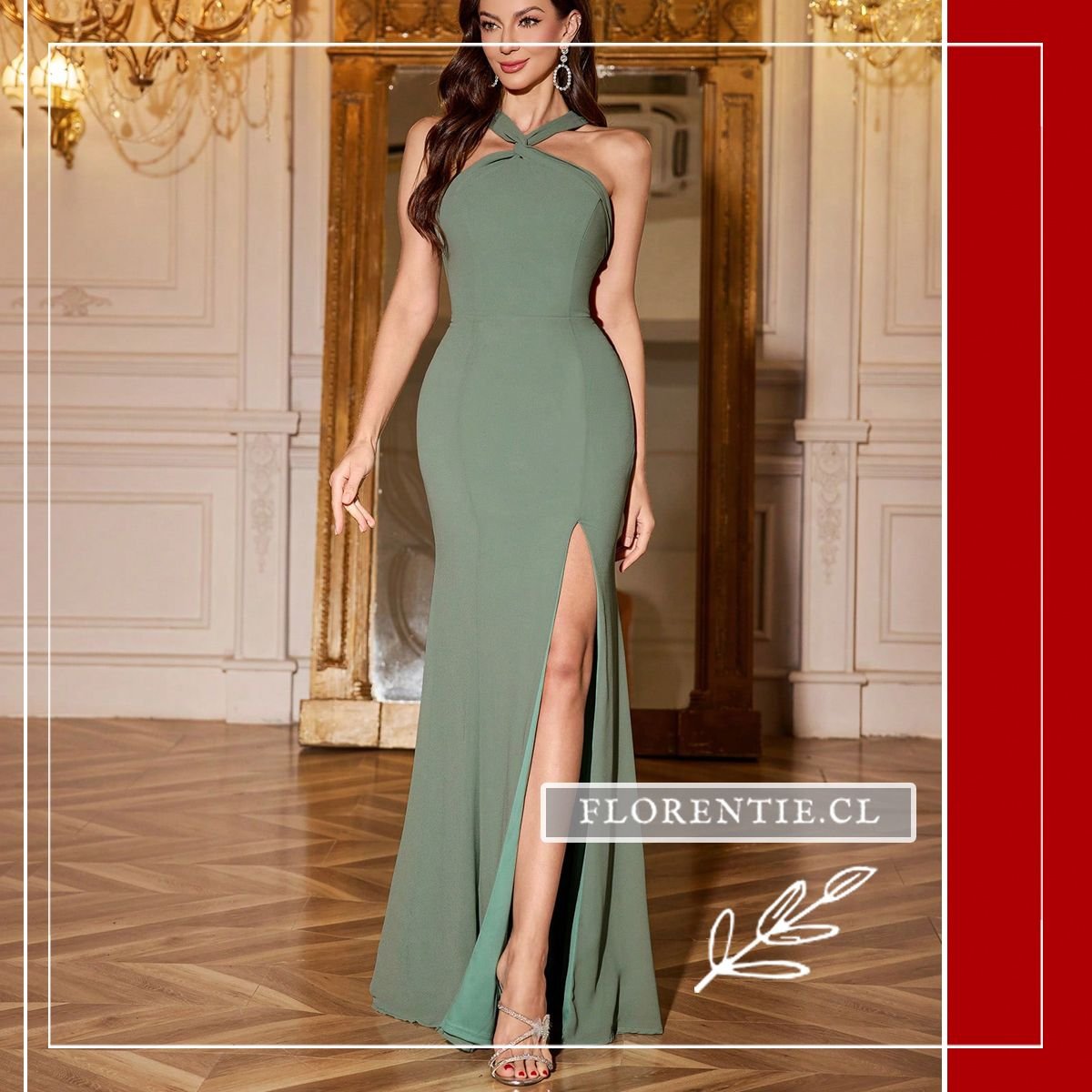Vestido Largo Ajustado Cuello Halter con Nudo y Abertura