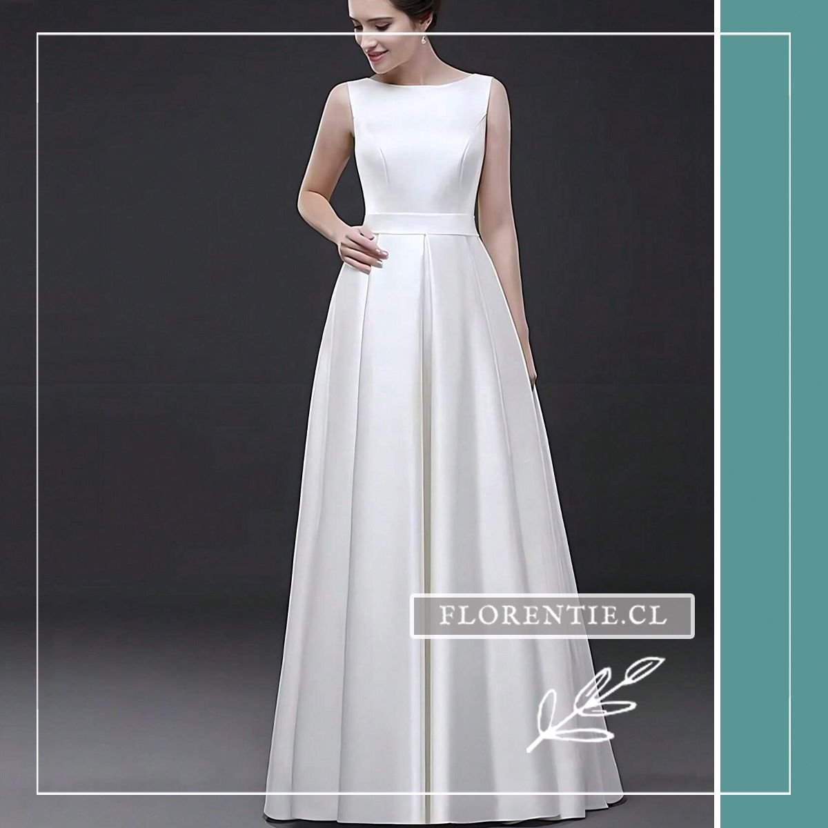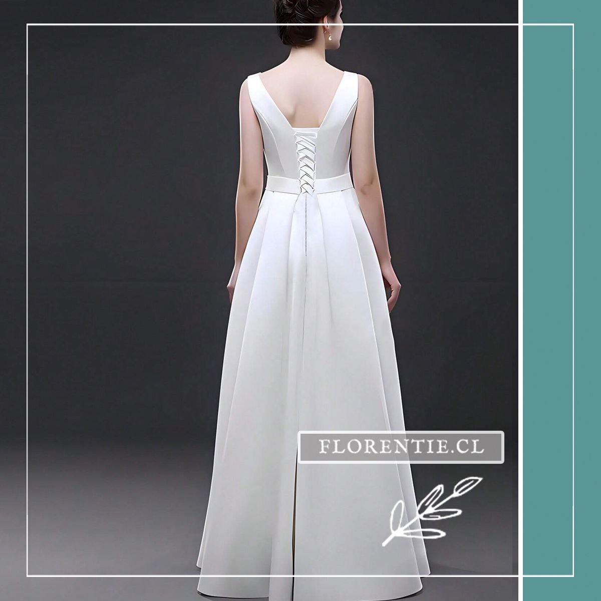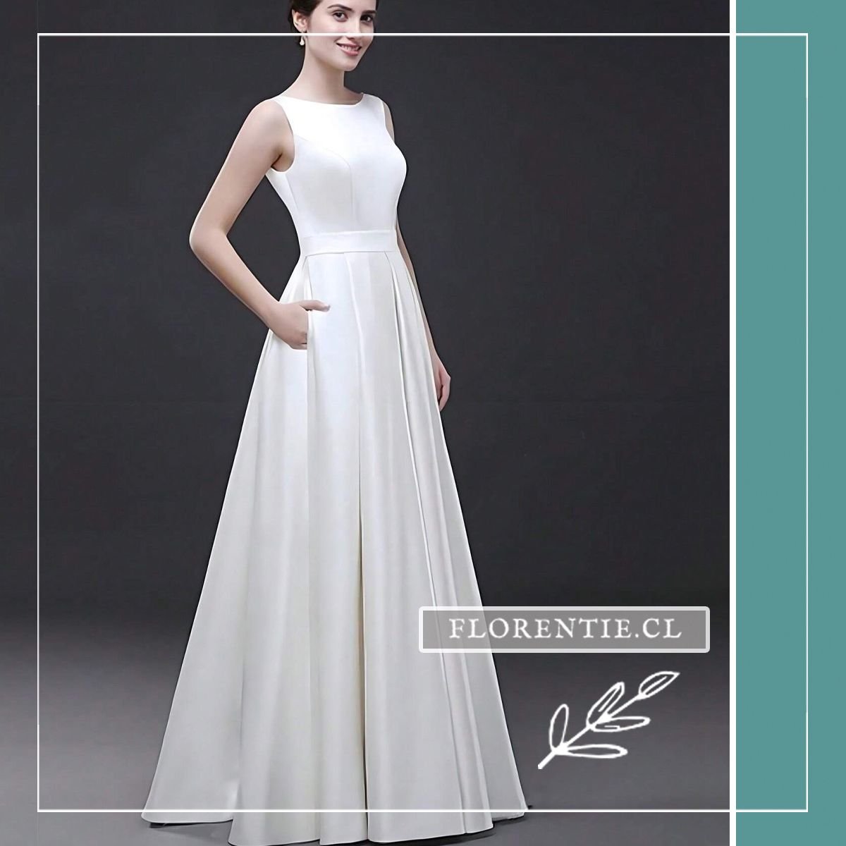 Vestido matrimonio civil: elegancia minimalista y funcional para tu celebración. Su corte línea A y largo hasta el suelo ofrecen comodidad y estilo atemporal. Presenta un cuello barco, corpiño ajustado y espalda con escote en V y detalle de cordones cruzados ajustables. La falda amplia con pliegues incluye prácticos bolsillos laterales. Confeccionado en tela satinada de caída fluida, es ideal para bodas civiles, ceremonias formales, eventos de gala, cócteles elegantes o banquetes. Su diseño combina sofisticación y practicidad, siendo perfecto para cualquier ocasión especial donde busques un look pulcro y favorecedor con un toque de distinción moderna.