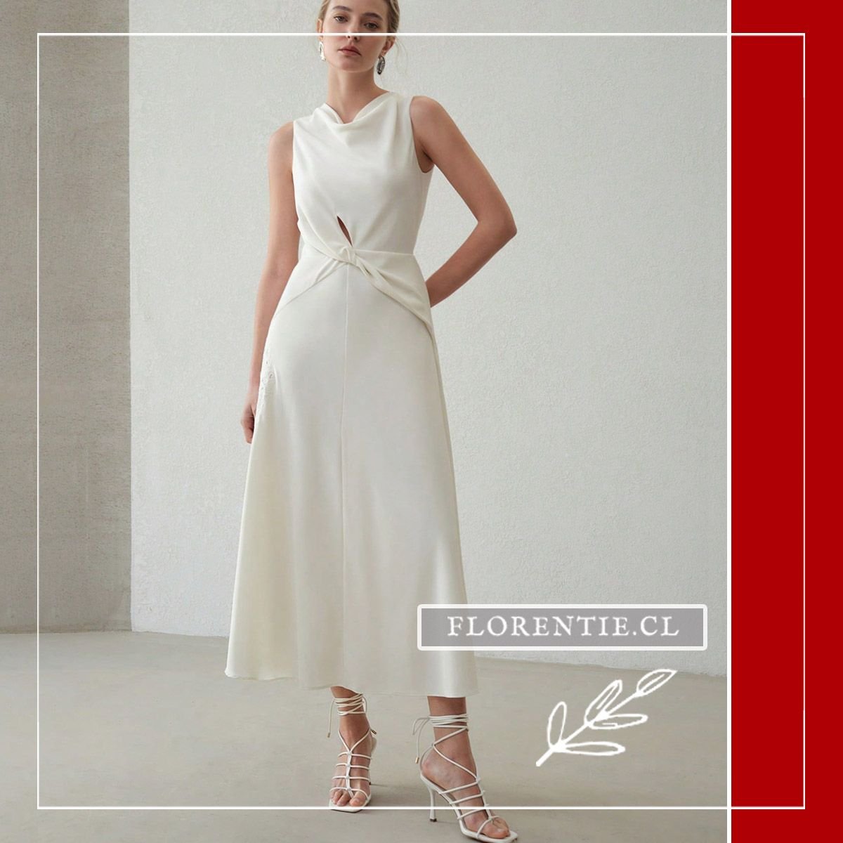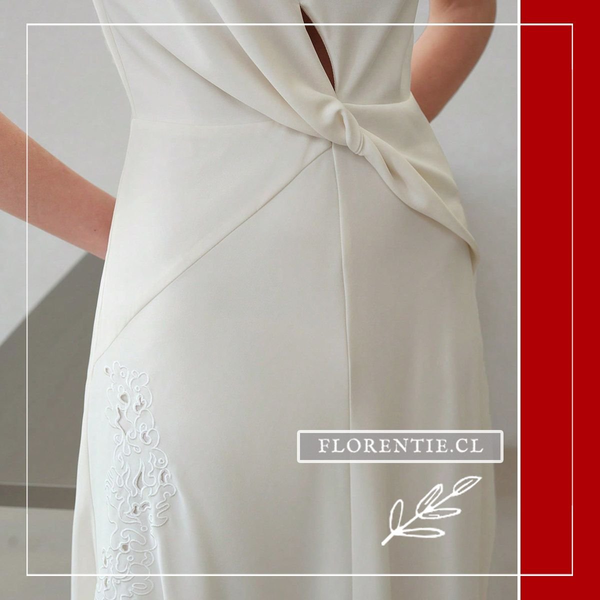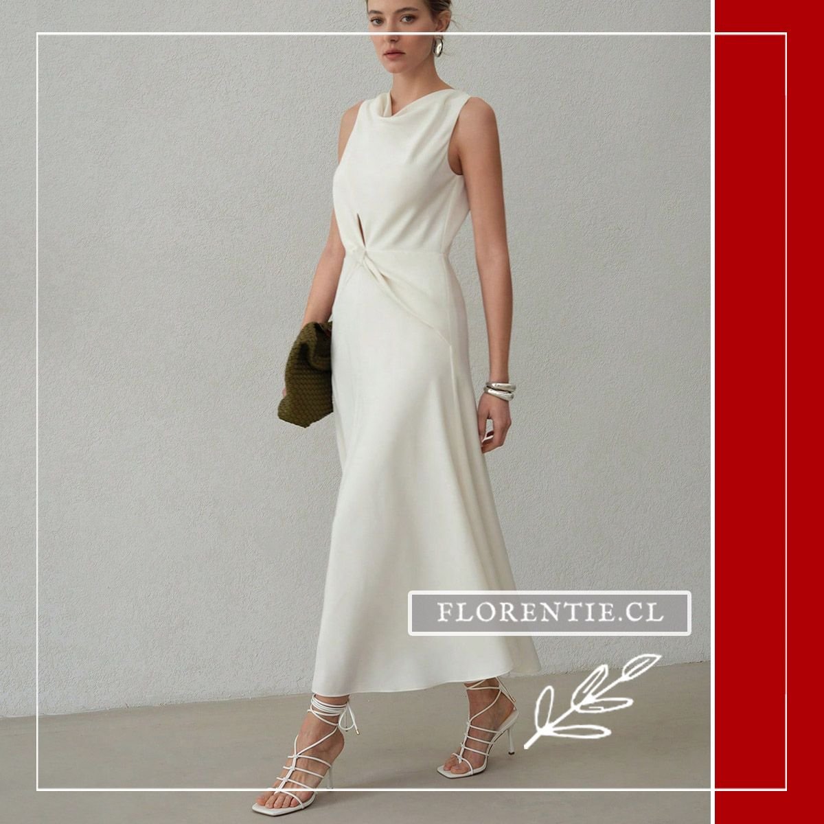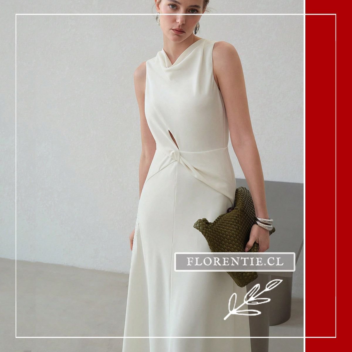 Vestido novia civil Borbolet: elegancia minimalista y sofisticación moderna para tu ceremonia especial. Este vestido largo marfil presenta un escote tipo cowl drapeado y un detalle distintivo de nudo decorativo en la cintura que define la silueta. Su falda fluida de corte A, con un delicado bordado floral lateral, ofrece caída recta y amplitud. Confeccionado en tejido sedoso con cierre trasero, es ideal para bodas civiles o eventos formales, logrando un look pulcro y contemporáneo.