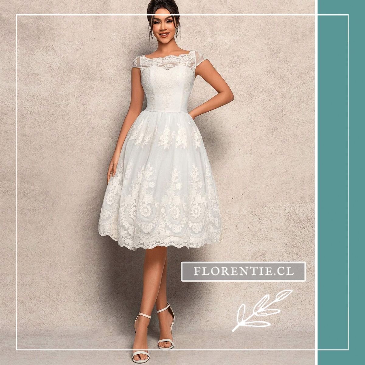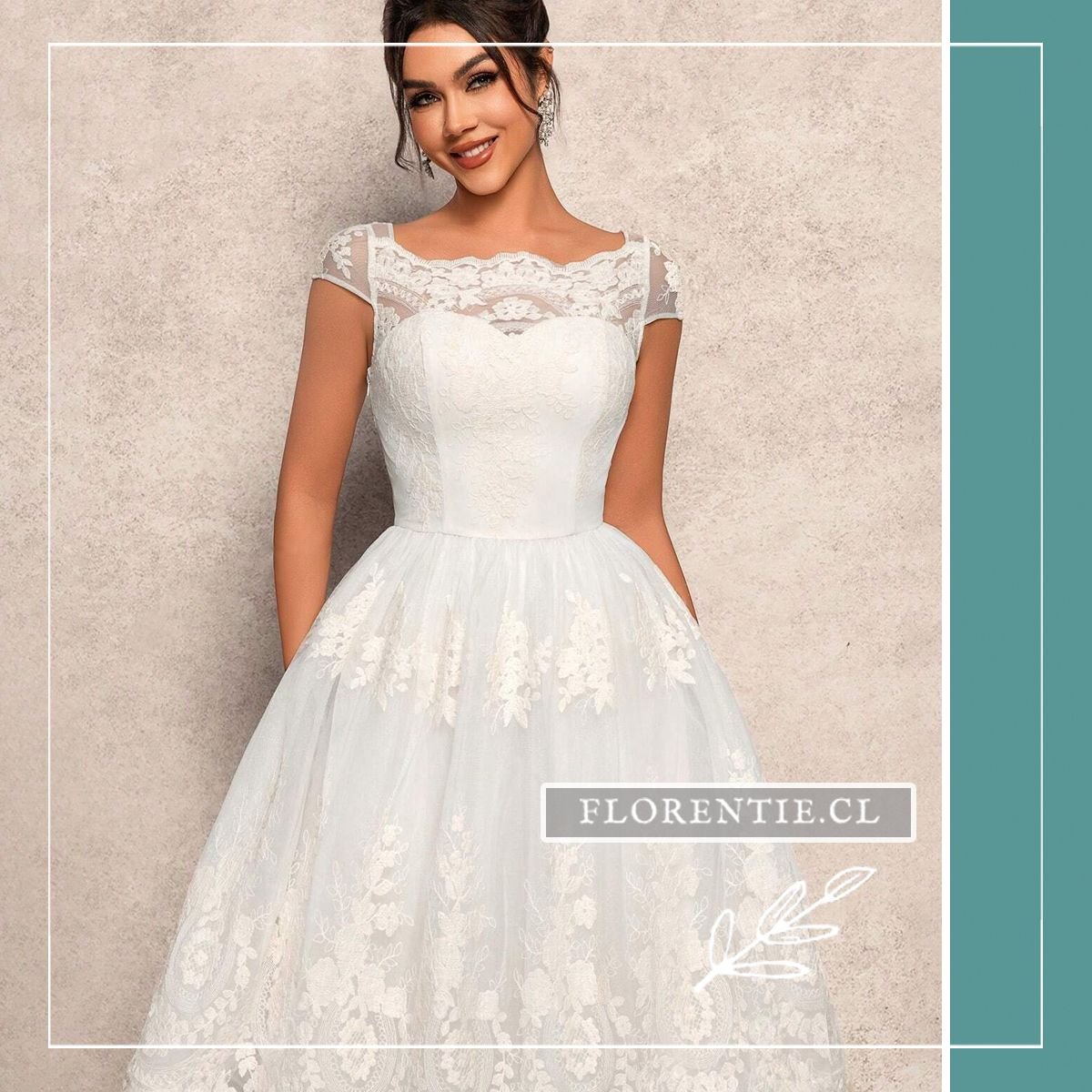 Este modelo presenta un escote barco con panel transparente de encaje floral y mangas cortas tipo cap sleeve. La cintura definida con banda satinada se abre en una falda de tul con aplicaciones de encaje distribuidas y borde festoneado. Ideal para bodas civiles, cócteles elegantes, eventos formales de día, ceremonias de renovación de votos o ocasiones especiales con inspiración retro. Su diseño combina la delicadeza del encaje con la practicidad de un largo moderno, perfecto para lucir sofisticada y cómoda.