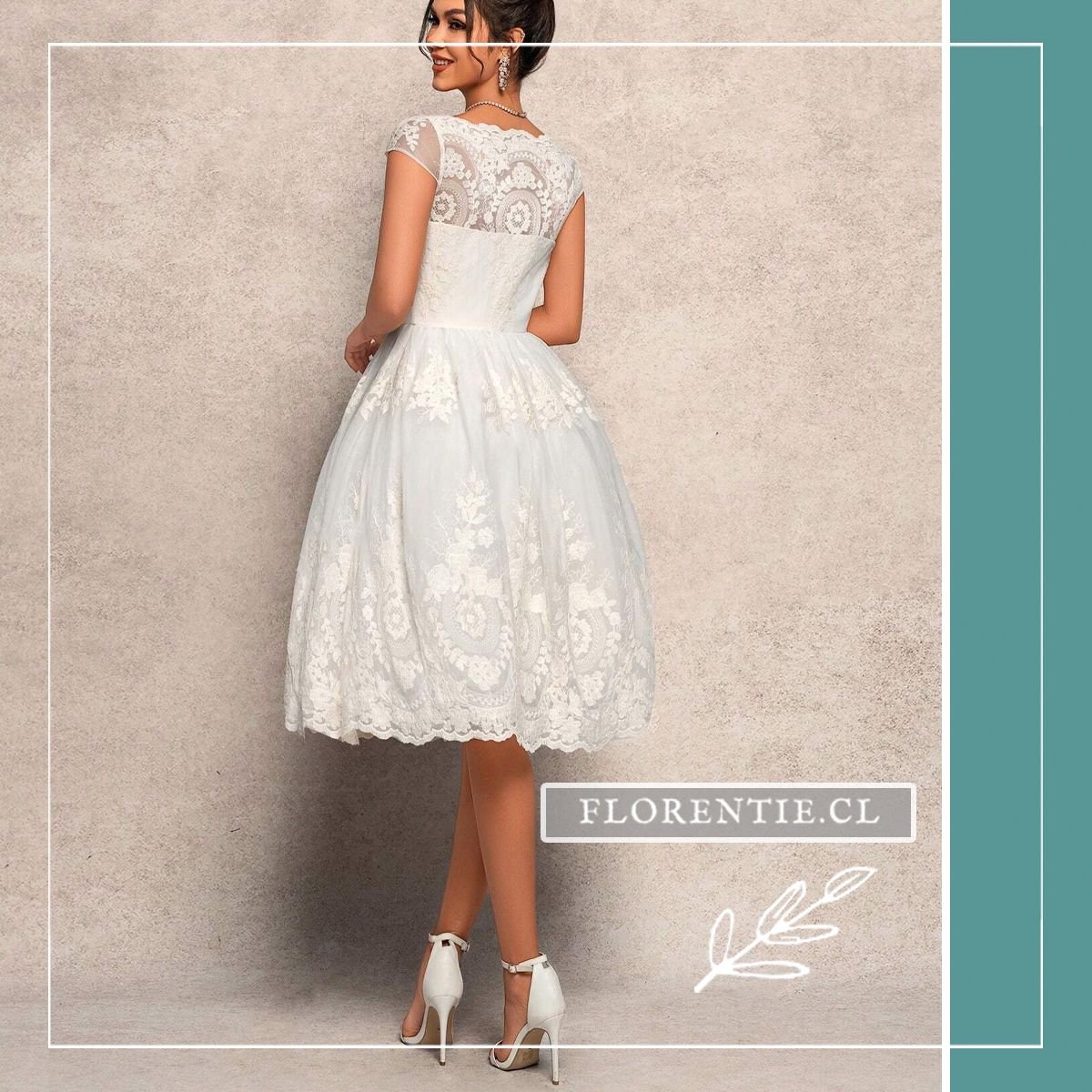 Vestido novia civil: elegancia retro y funcional para tu celebración. Su silueta tea-length y falda amplia ofrecen comodidad y estilo vintage.