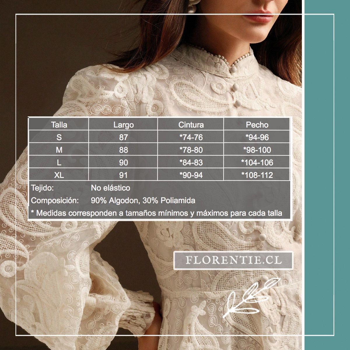 Este vestido luce un cuello alto con detalles de perlitas y mangas largas tipo globo con puños ajustados. El cuerpo enteramente de encaje con aplicaciones tridimensionales marca suavemente la cintura, abriéndose en falda evasé. Ideal para bodas civiles, cócteles elegantes, eventos de día, ceremonias íntimas o celebraciones especiales donde busques un equilibrio perfecto entre sofisticación vintage y comodidad contemporánea. Un vestido que destaca por su artesanía detallada y aire romántico para ocasiones memorables.