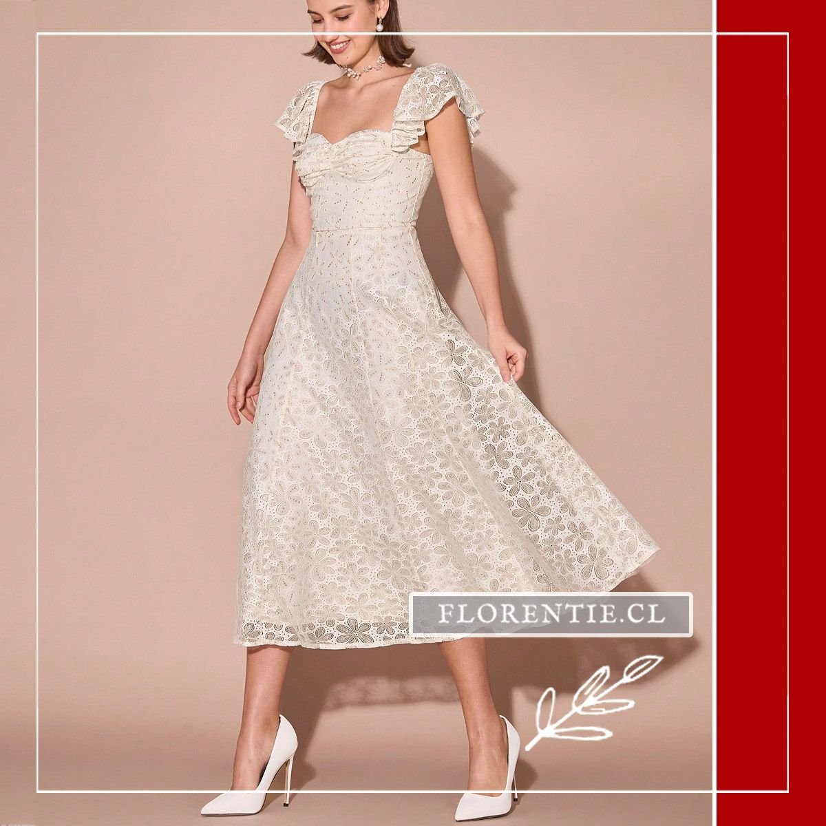 Vestido boda civil romántico: elegancia atemporal y un toque vintage para tu ceremonia especial. Este vestido midi marfil presenta un escote corazón con fruncido decorativo, tirantes de encaje con volantes y una cintura marcada con detalle elástico. Su falda en forma de A está confeccionada completamente en encaje floral, creando una silueta amplia y vaporosa. Ideal para una boda civil, evento formal o celebración elegante, este diseño combina femineidad, delicadeza y un estilo romántico inolvidable.