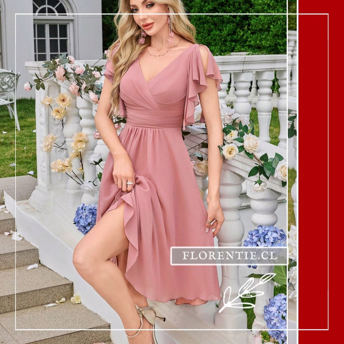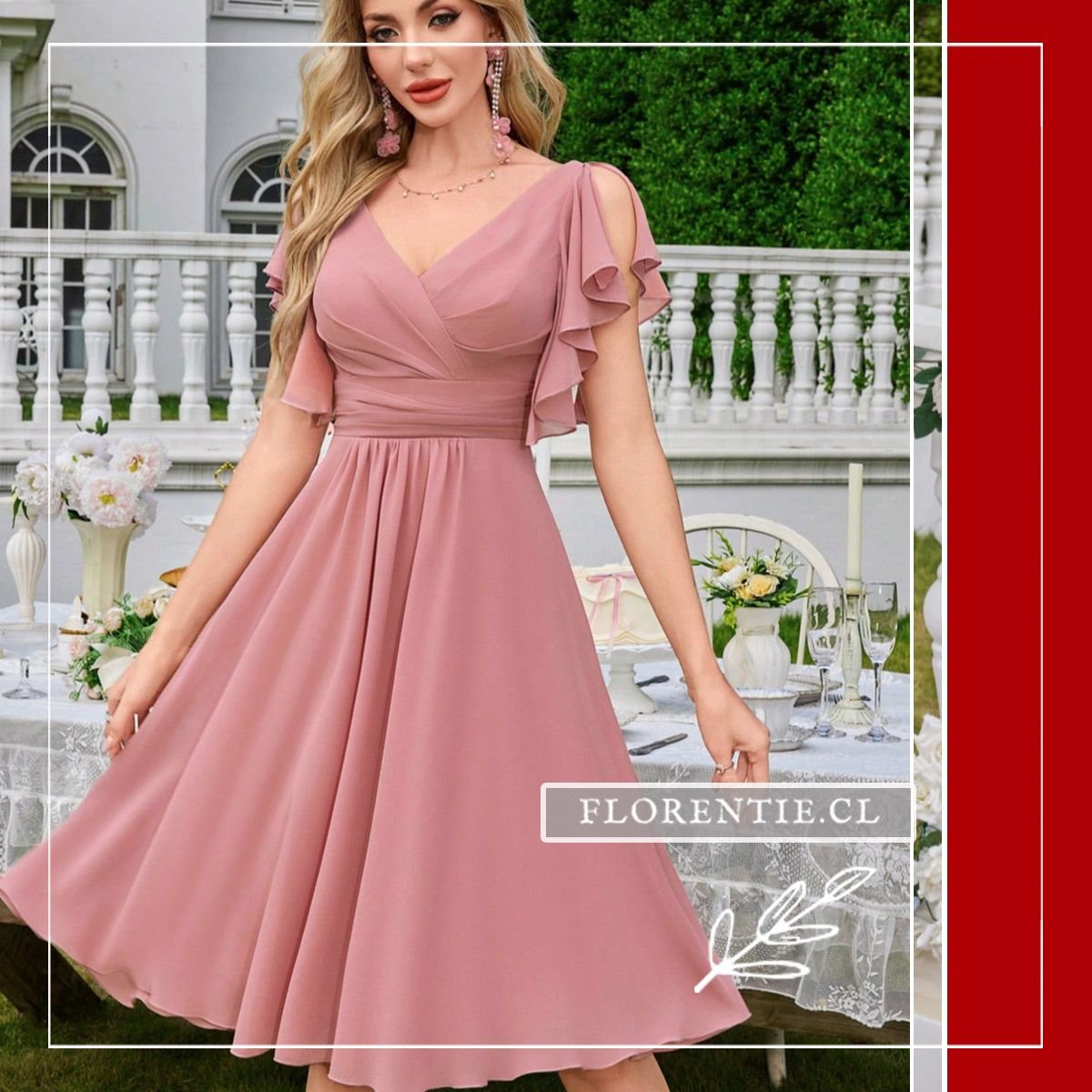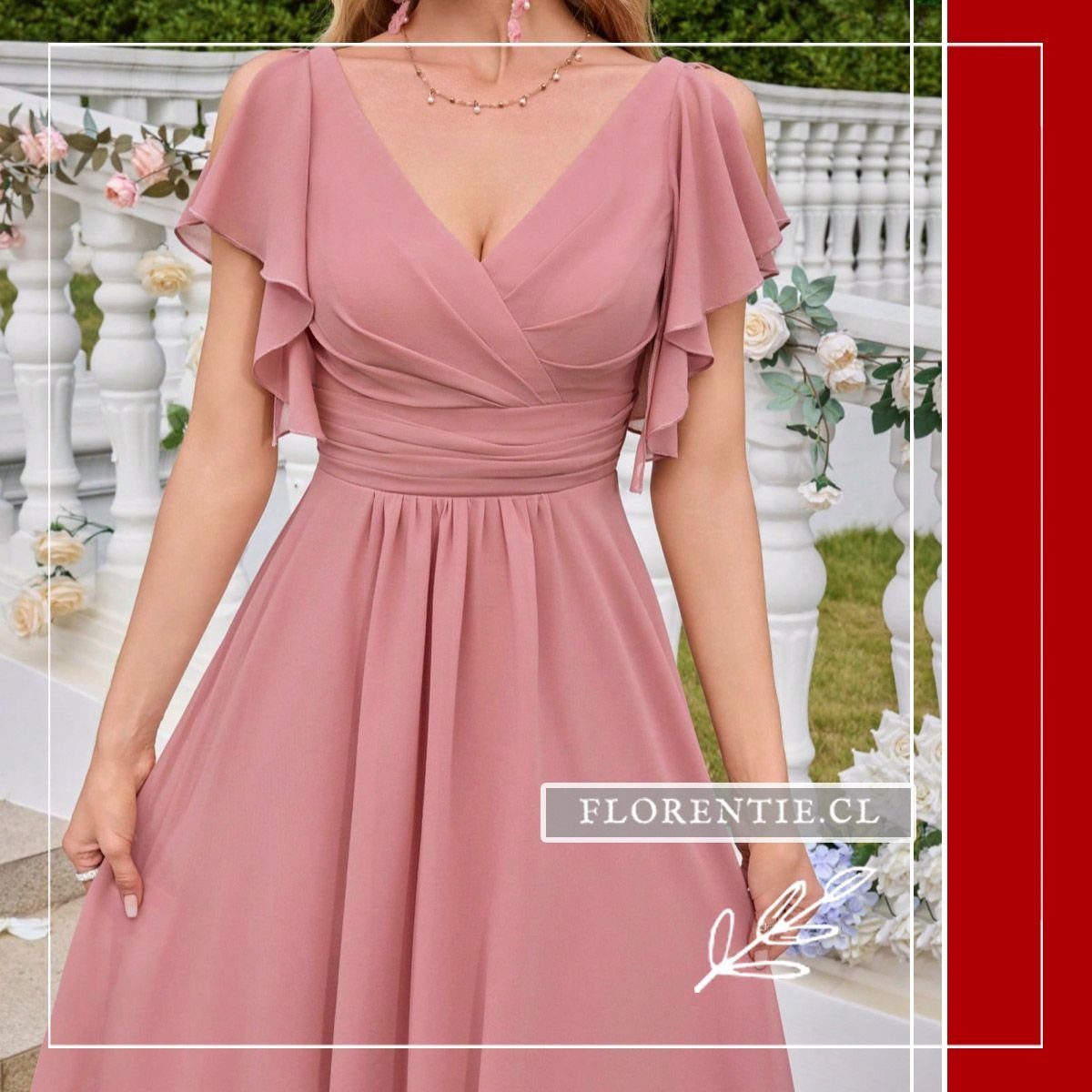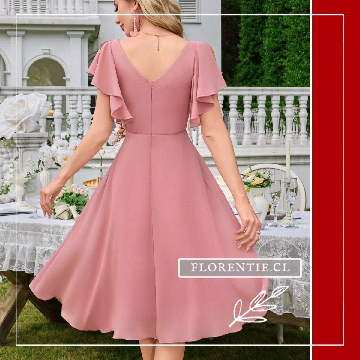 El vestido rosado Isabella es la elección perfecta para eventos donde buscas un estilo femenino y sofisticado. Su escote en V y su corpiño cruzado realzan la figura, mientras el fajín en la cintura define tu silueta. Las etéreas mangas tipo mariposa y la falda midi en A de tela fluida añaden un toque de movimiento y romanticismo. Ideal para bodas como invitada, cócteles de día, celebraciones en jardín, eventos de tarde o cualquier ocasión especial de primavera-verano donde desees lucir elegante, fresca y con un aire delicado y distinguido.