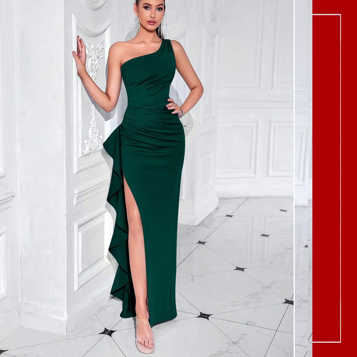 Su corte sirena y drapeado asimétrico de un hombro definen una silueta impactante, mientras que las tiras cruzadas en la espalda añaden sofisticación. La abertura lateral con volante tipo cascada aporta movimiento y un toque dramático. Confeccionado en satén, es ideal para galas de premiación, bodas elegantes, cócteles de lujo, fiestas de fin de año o eventos benéficos. Un vestido que garantiza un look memorable y lleno de confianza.