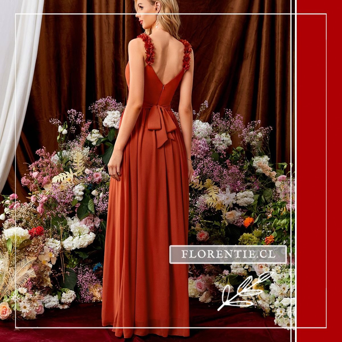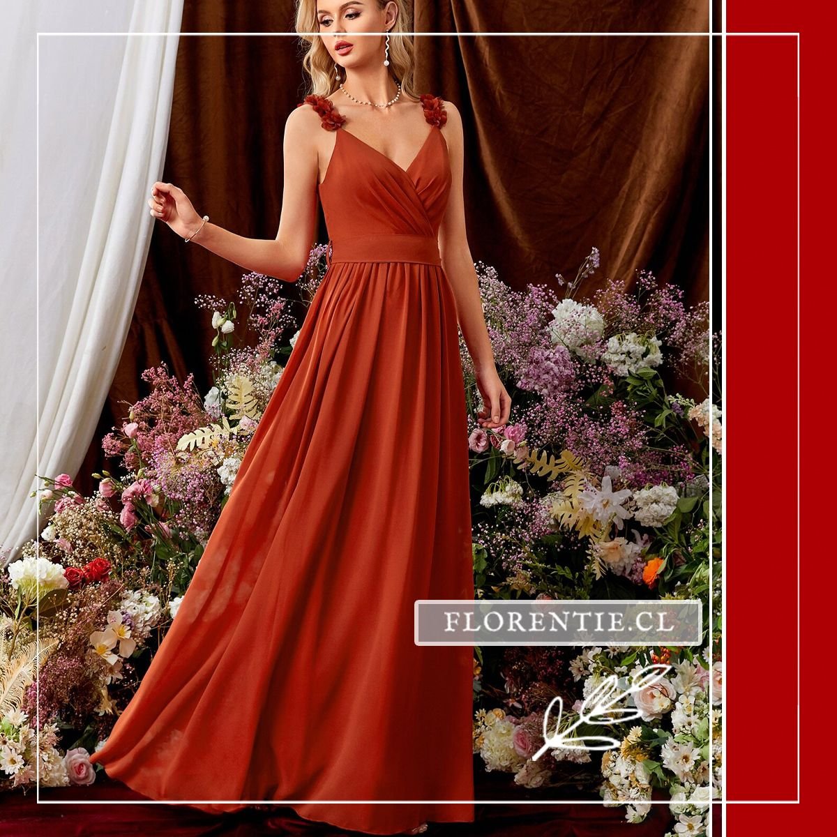 Por su tono tierra vibrante y sus detalles florales, este vestido evoca la naturaleza y la calidez. Es una opción romántica, cómoda y altamente recomendada para damas de honor en bodas de estilo rústico, campestre o en viñedos, donde el color armoniza perfectamente con el entorno natural y la luz dorada del atardecer.