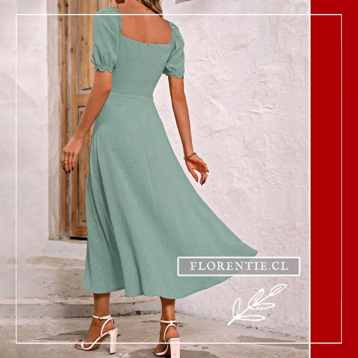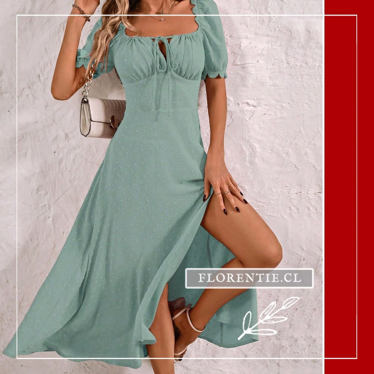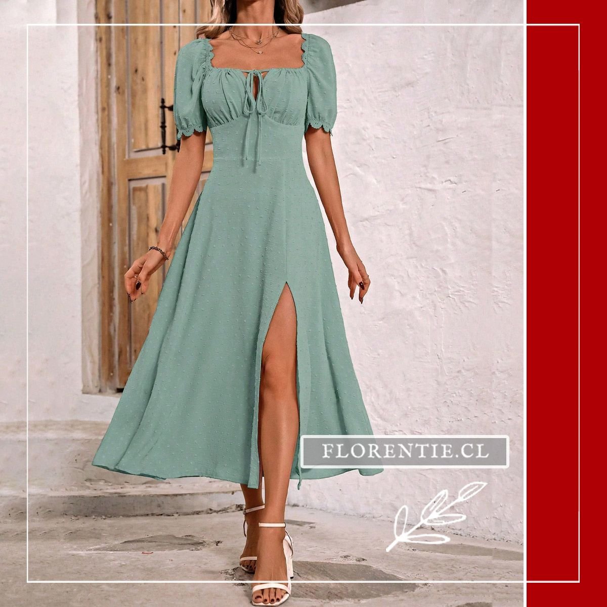 Vestido verano abierto: elegancia fresca y un toque de romanticismo para ocasiones especiales. Este vestido midi verde salvia presenta un escote cuadrado ajustable con cordón y mangas abullonadas. Su corte entallado en la cintura marca la silueta, mientras la falda tipo A con una pronunciada abertura lateral aporta movimiento y sofisticación. Confeccionado en tela ligera con textura punteada, es ideal para eventos al aire libre, como bodas campestres o celebraciones en jardín, ofreciendo un estilo cottage-core moderno y muy favorecedor.