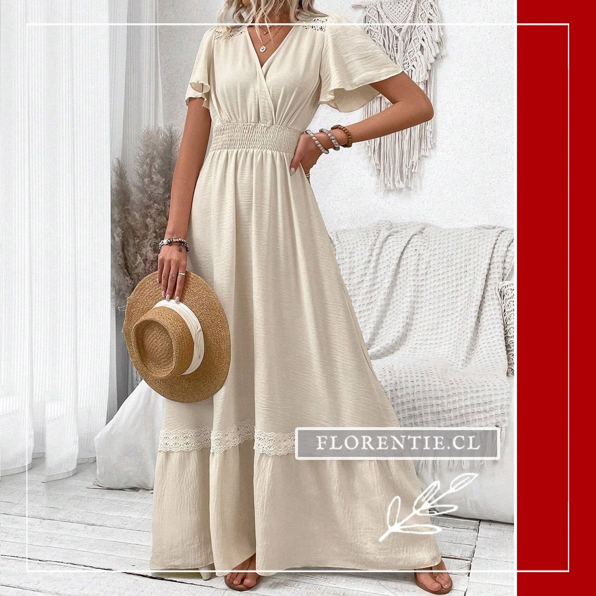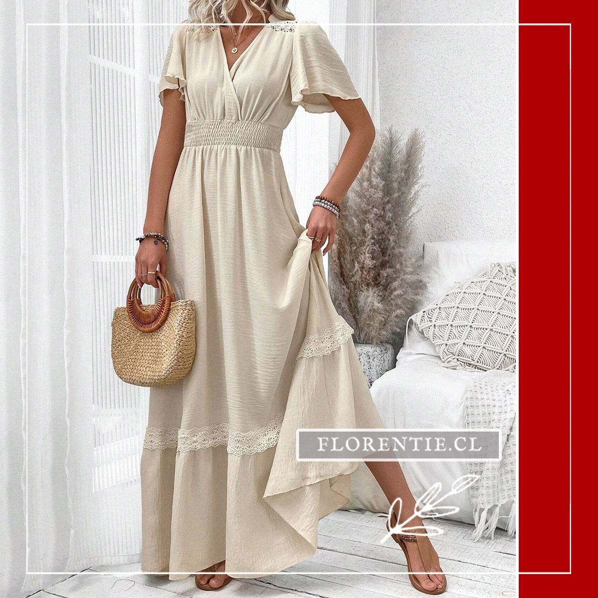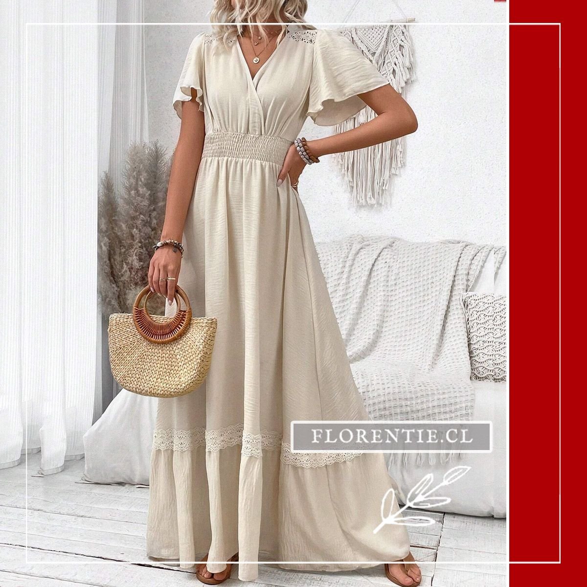 Vestido verano beige: estilo bohemio y comodidad se unen en este diseño fresco y versátil. Este vestido maxi beige presenta un escote en V cruzado con mangas tipo mariposa y detalles de encaje en los hombros. Su cintura con elástico fruncido crea un ajuste cómodo y favorecedor, mientras la falda de dos niveles, dividida por una banda de encaje, ofrece fluidez y movimiento. Ideal para bodas al aire libre, eventos diurnos o salidas veraniegas, logrando un look boho elegante y perfecto para el calor.