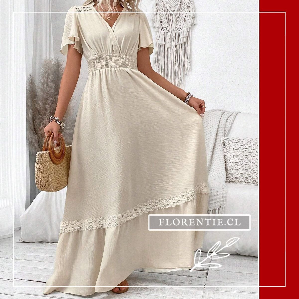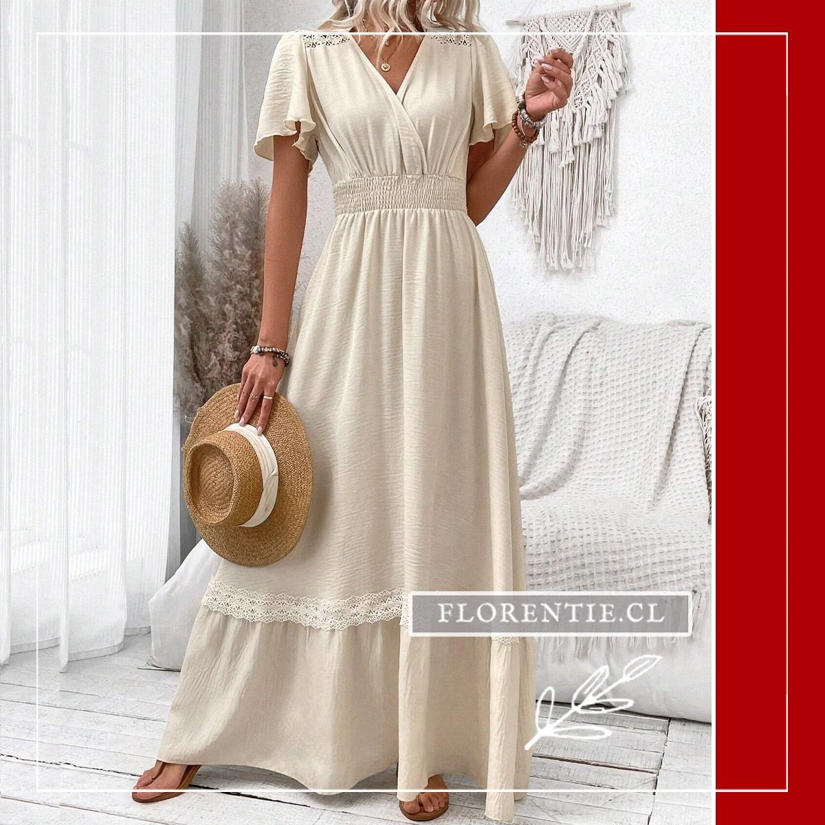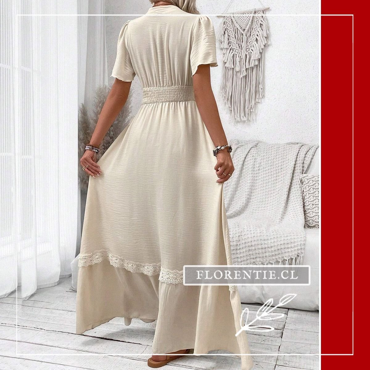Vestido verano beige: estilo bohemio y comodidad se unen en este diseño fresco y versátil. Este vestido maxi beige presenta un escote en V cruzado con mangas tipo mariposa y detalles de encaje en los hombros. Su cintura con elástico fruncido crea un ajuste cómodo y favorecedor, mientras la falda de dos niveles, dividida por una banda de encaje, ofrece fluidez y movimiento. Ideal para bodas al aire libre, eventos diurnos o salidas veraniegas, logrando un look boho elegante y perfecto para el calor.