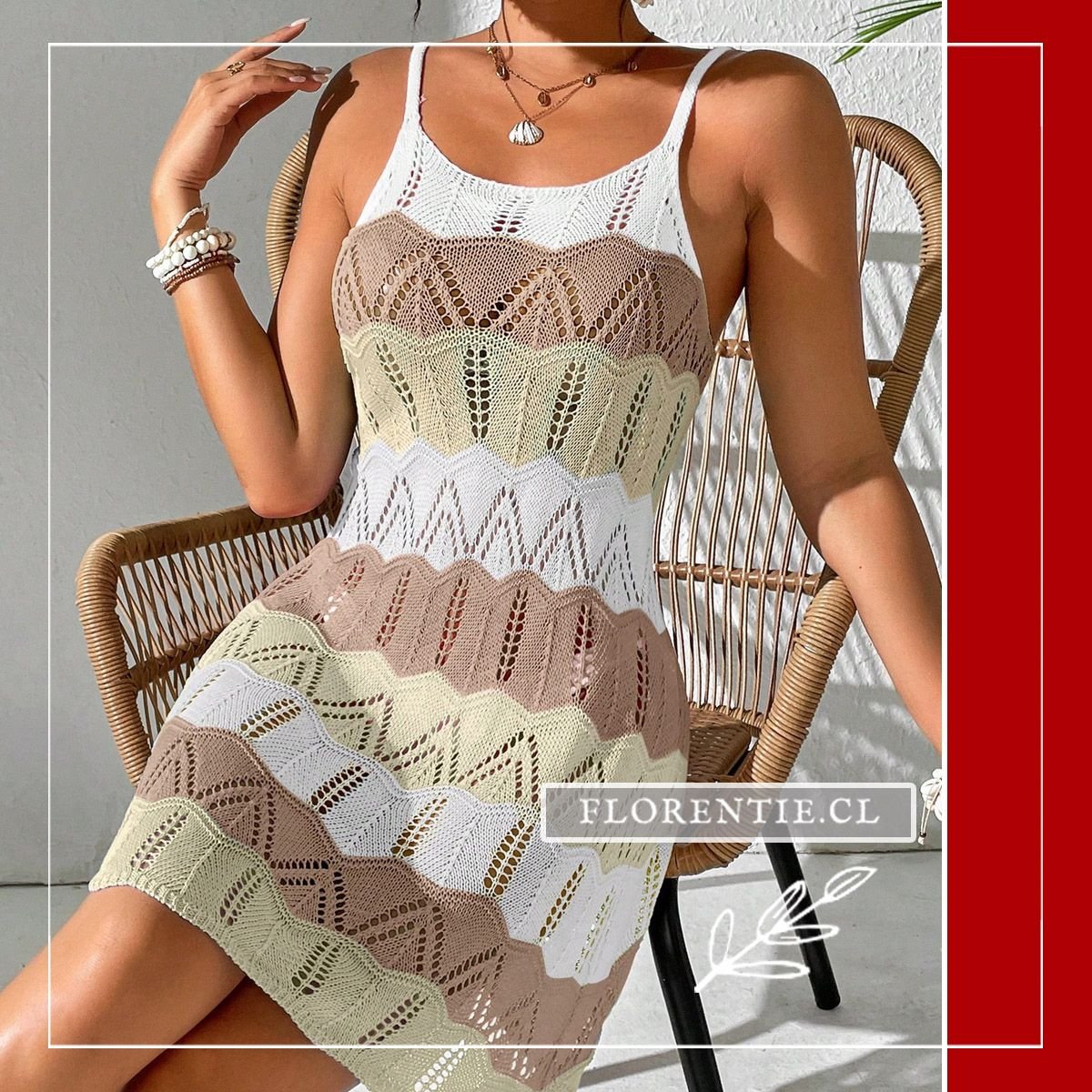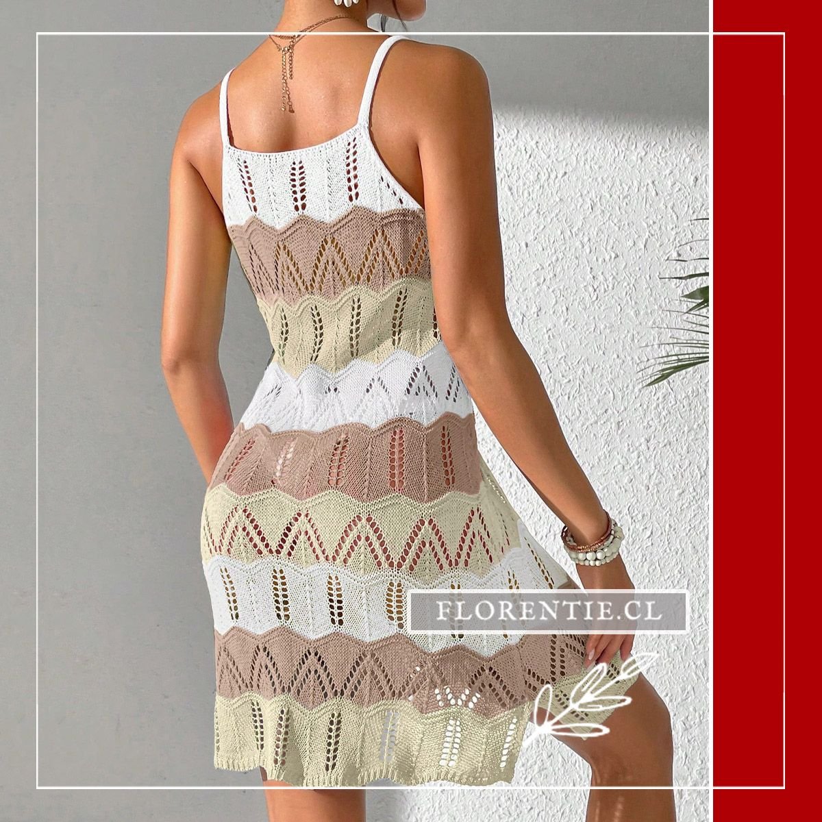 Vestido verano calado: estilo bohemio y fresco para tus días más relajados y soleados. Este vestido mini de tejido calado presenta un escote redondo con tirantes anchos y una silueta ceñida al cuerpo. Su diseño combina franjas horizontales en zigzag con tonos neutros y un patrón de calados verticales que crean un efecto semitransparente. Ligero y con bajo ondulado, es ideal para usar en la playa, como cubrebikini o en eventos casuales, ofreciendo un look veraniego y desenfadado con un toque artesanal.