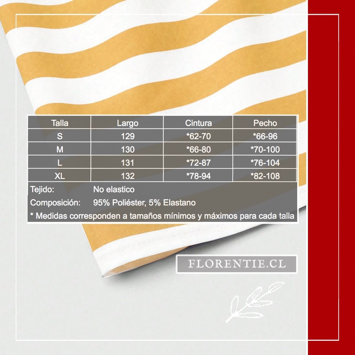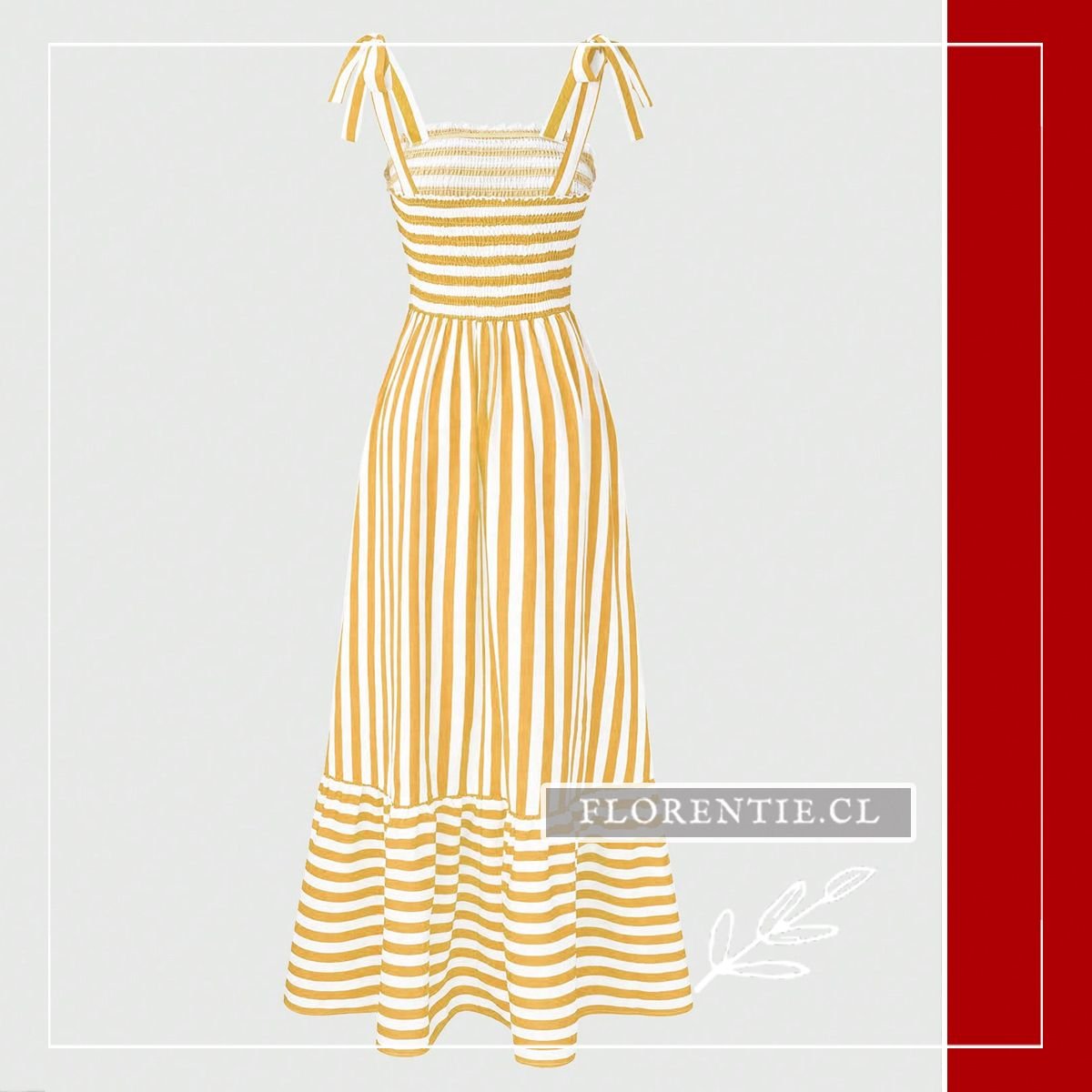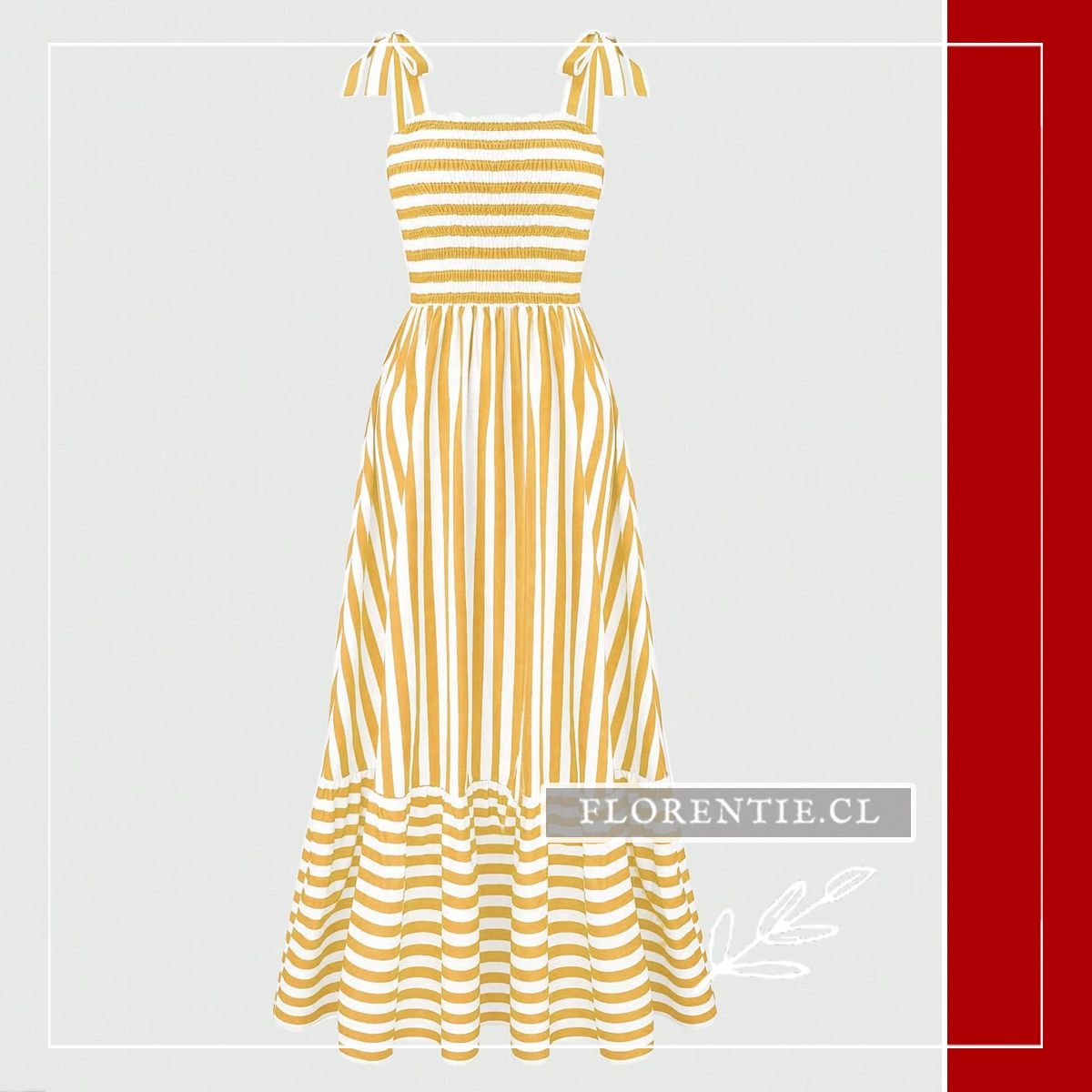 Este vestido maxi de corte imperio se ajusta bajo el busto con un corpiño fruncido, creando una silueta favorecedora. Los tirantes ajustables con lazos y el volante inferior le otorgan un toque de movimiento único. Confeccionado en tela fluida, su estampado de rayas verticales en amarillo mostaza y blanco es ideal para eventos como cenas en la terraza, fiestas playeras o un día de veraneo, ofreciendo comodidad y un estilo mediterráneo con un look pulido y casual.