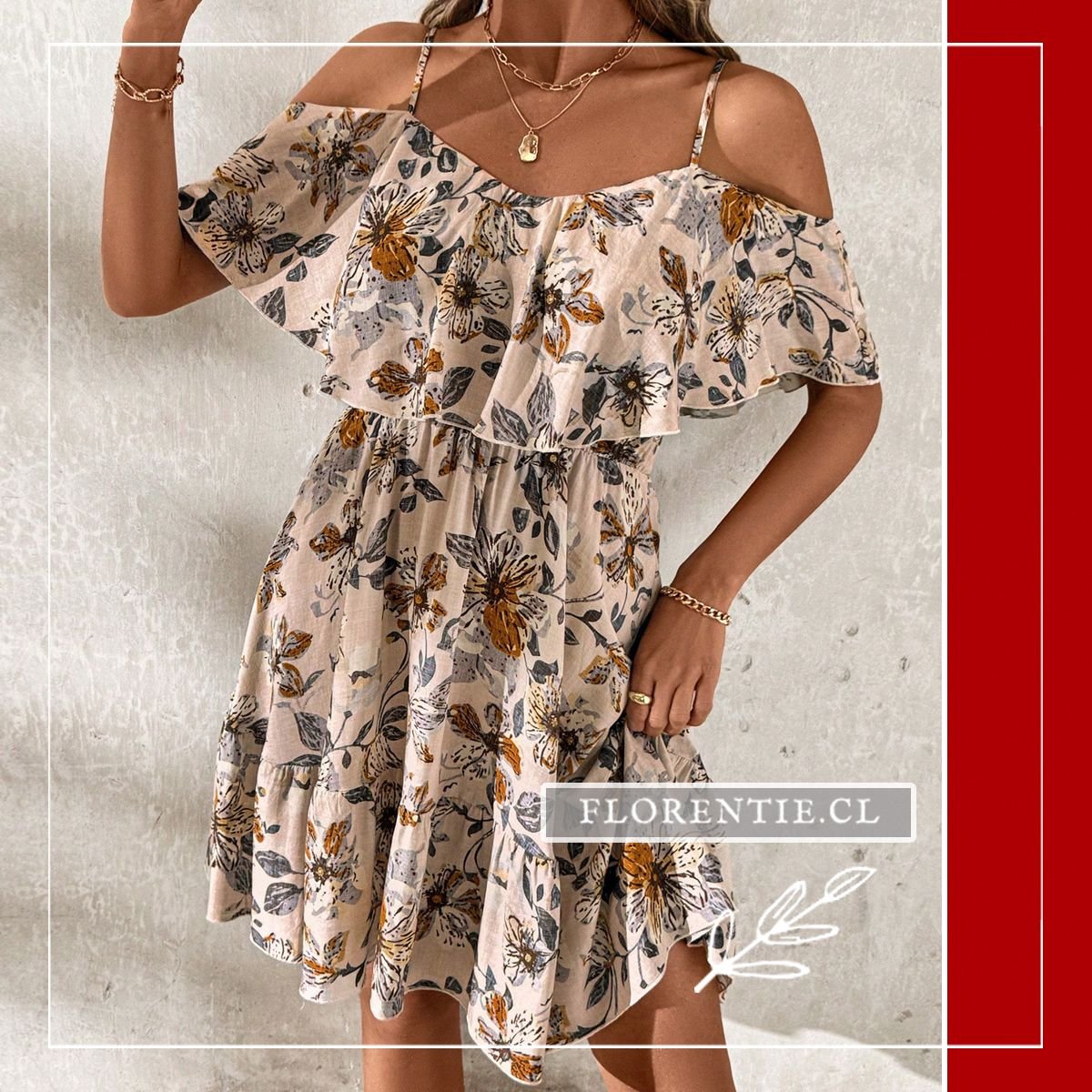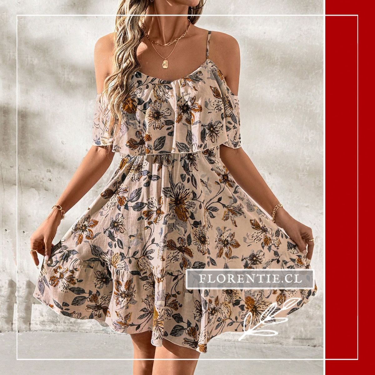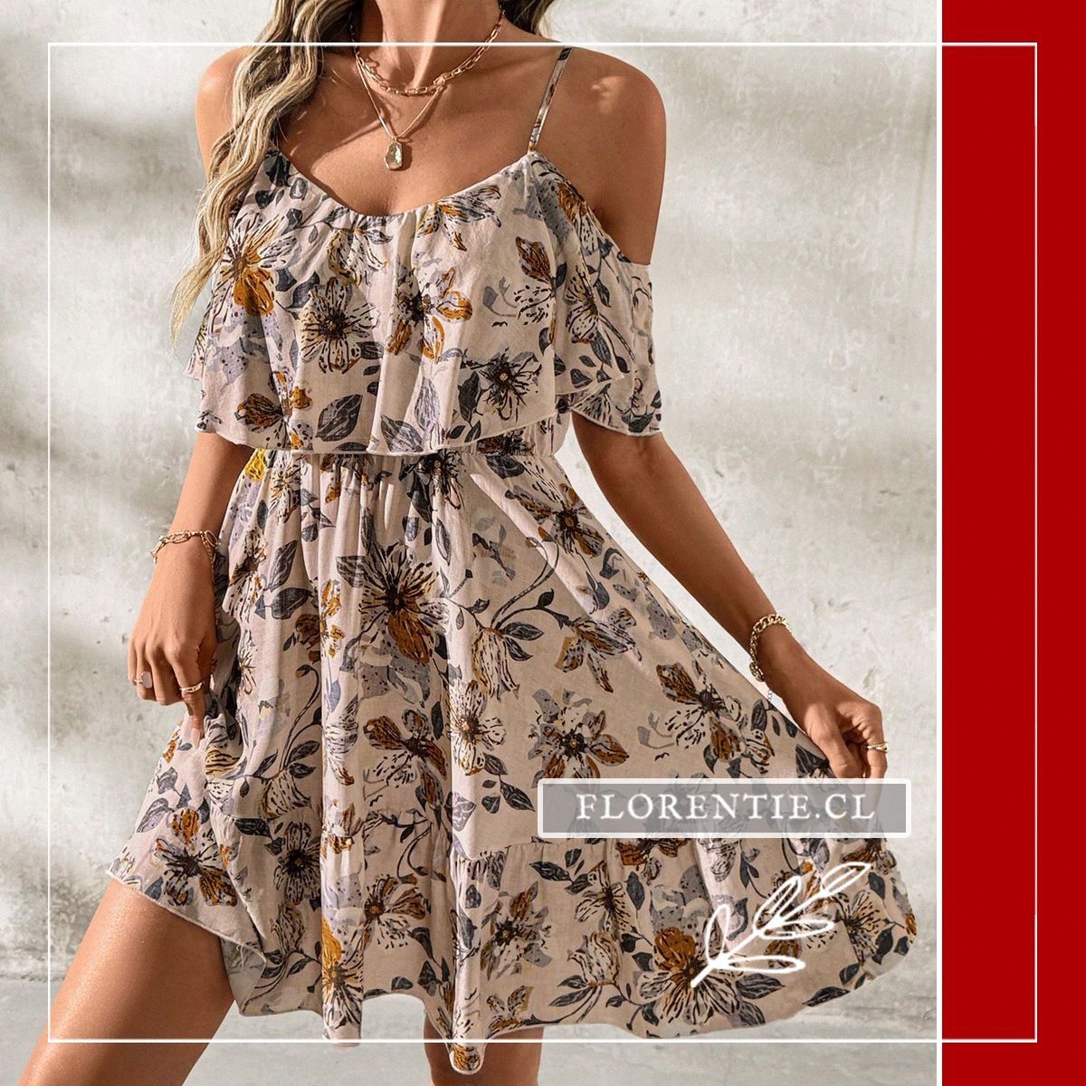 Este vestido corto de silueta en A posee un escote off-shoulder con un volante superior y tirantes ajustables. Su cintura elástica fruncida y falda de tres niveles con volantes crean una figura favorecedora y llena de movimiento. Confeccionado en tela ligera, luce un vibrante estampado de flores grandes en tonos mostaza y naranja. Ideal para una boda al aire libre, una cena de verano o cualquier evento donde quieras destacar con un estilo boho-chic fresco y femenino.